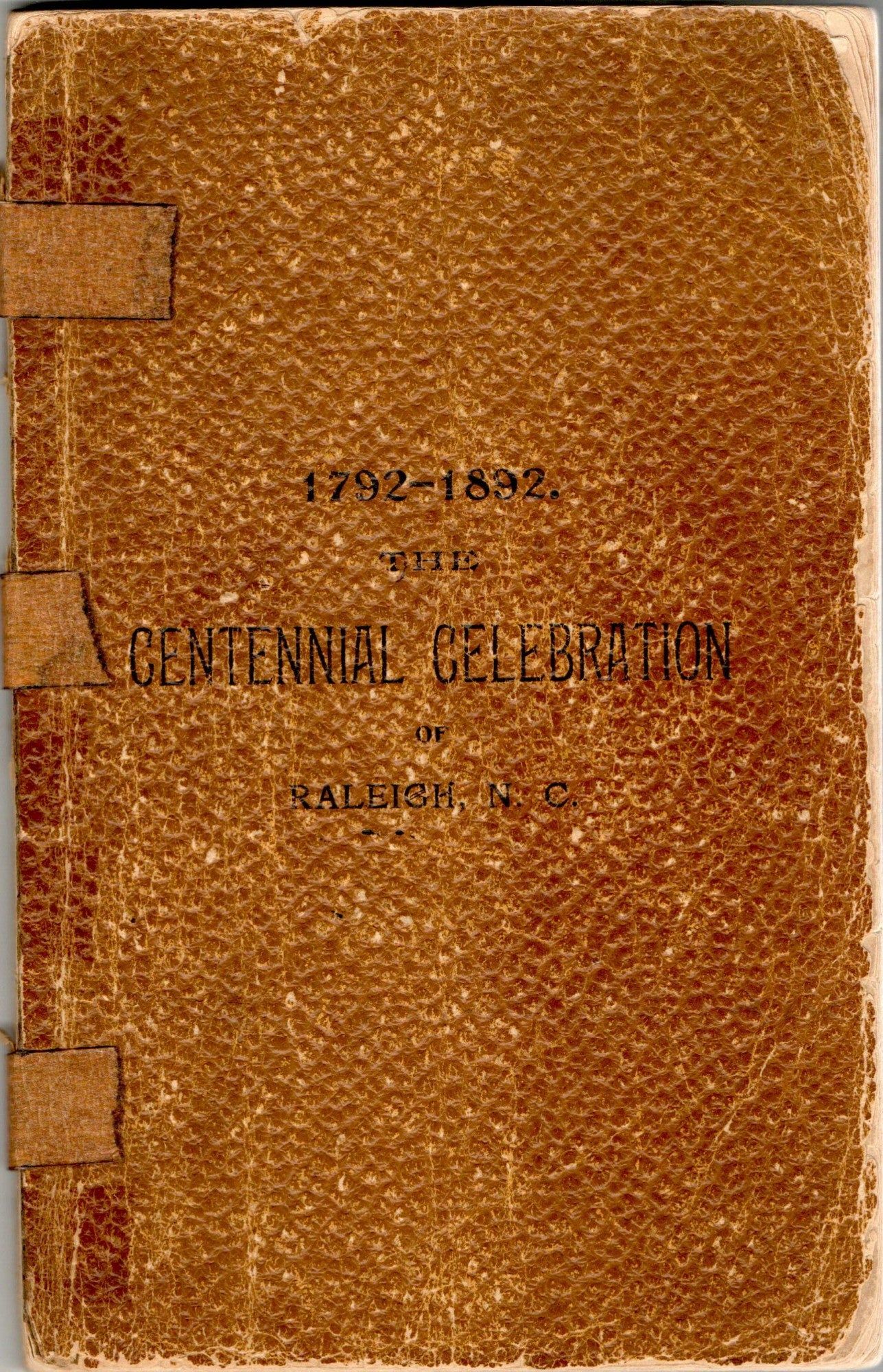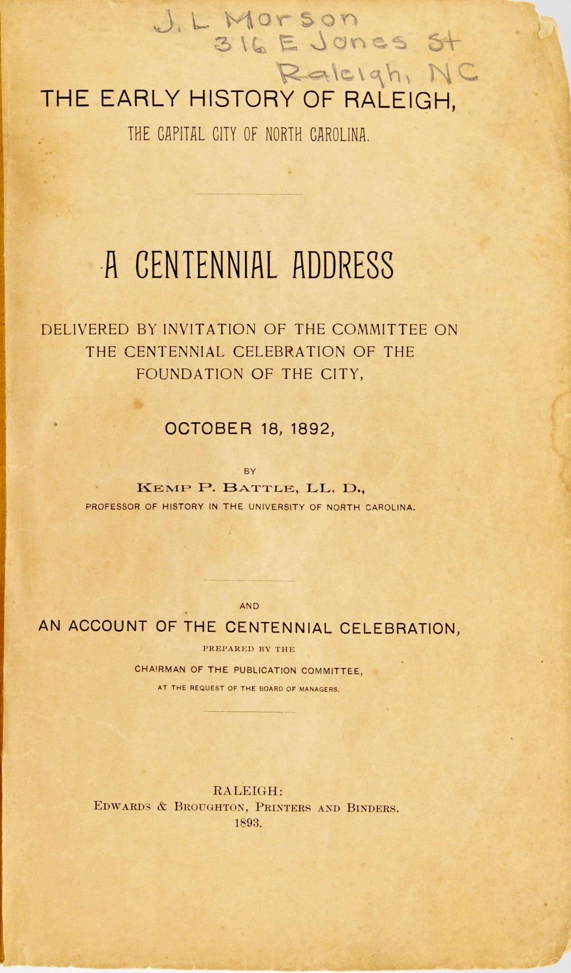 [AMERICANA] THE EARLY HISTORY OF RALEIGH, THE CAPITAL CITY OF NORTH CAROLINA. A CENTENNIAL ADDRESS DELIVERED BY INVITATION OF THE COMMITTEE ON THE CENTENNIAL CELEBRATION OF THE FOUNDATION OF THE CITY, OCTOBER 18, 1892. AND AN ACCOUNT OF THE CENTENNIAL CELEBRATION, PREPARED BY THE CHAIRMAN OF THE PUBLICATION COMMITTEE, AT THE REQUEST OF THE BOARD OF MANAGERS