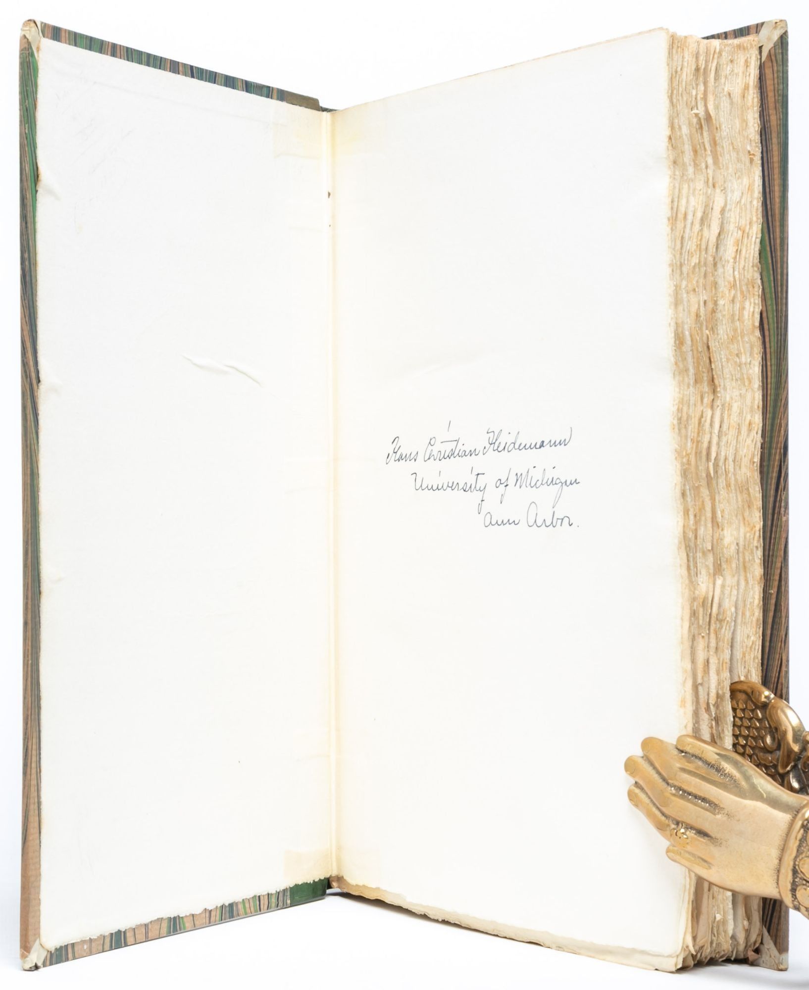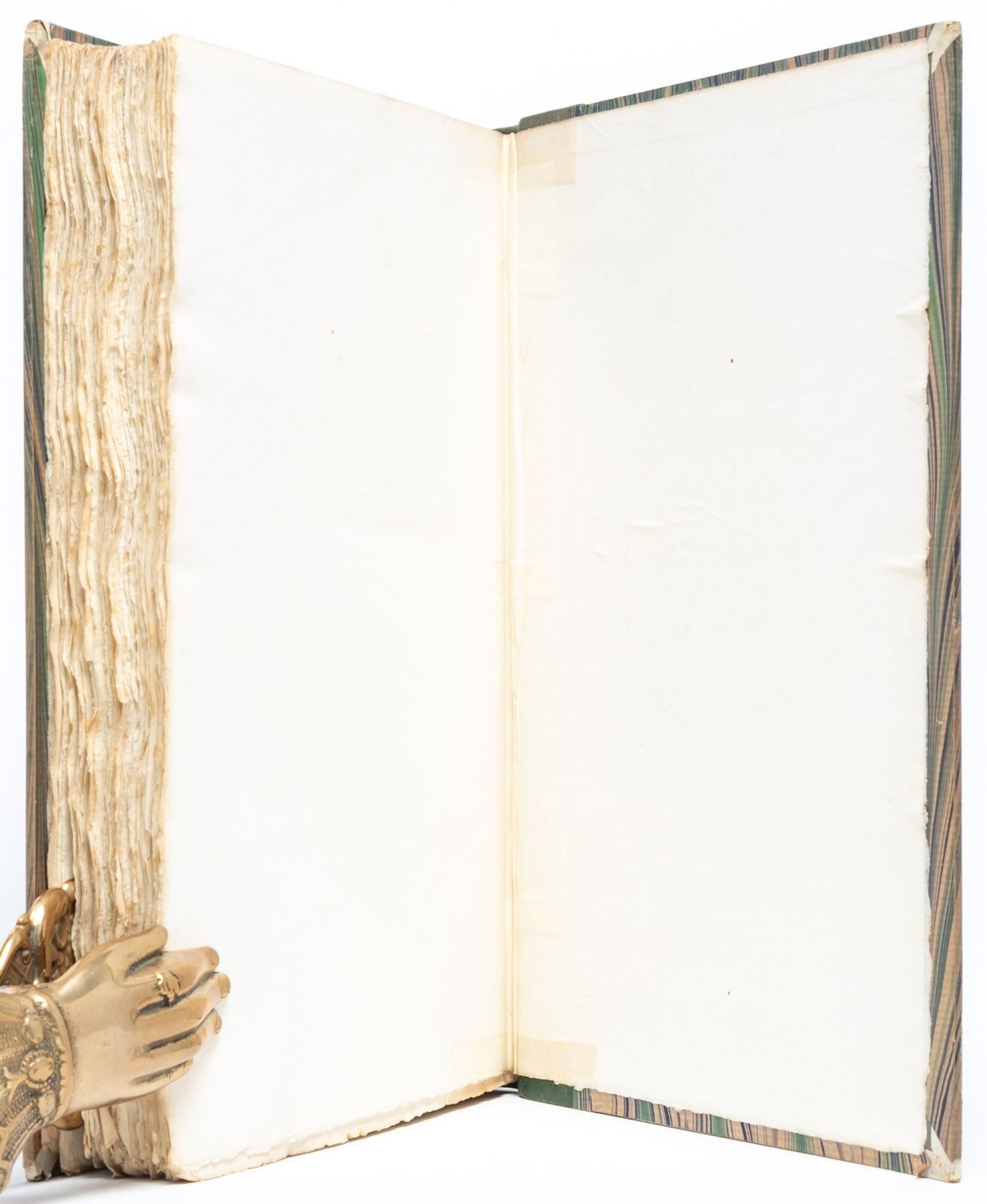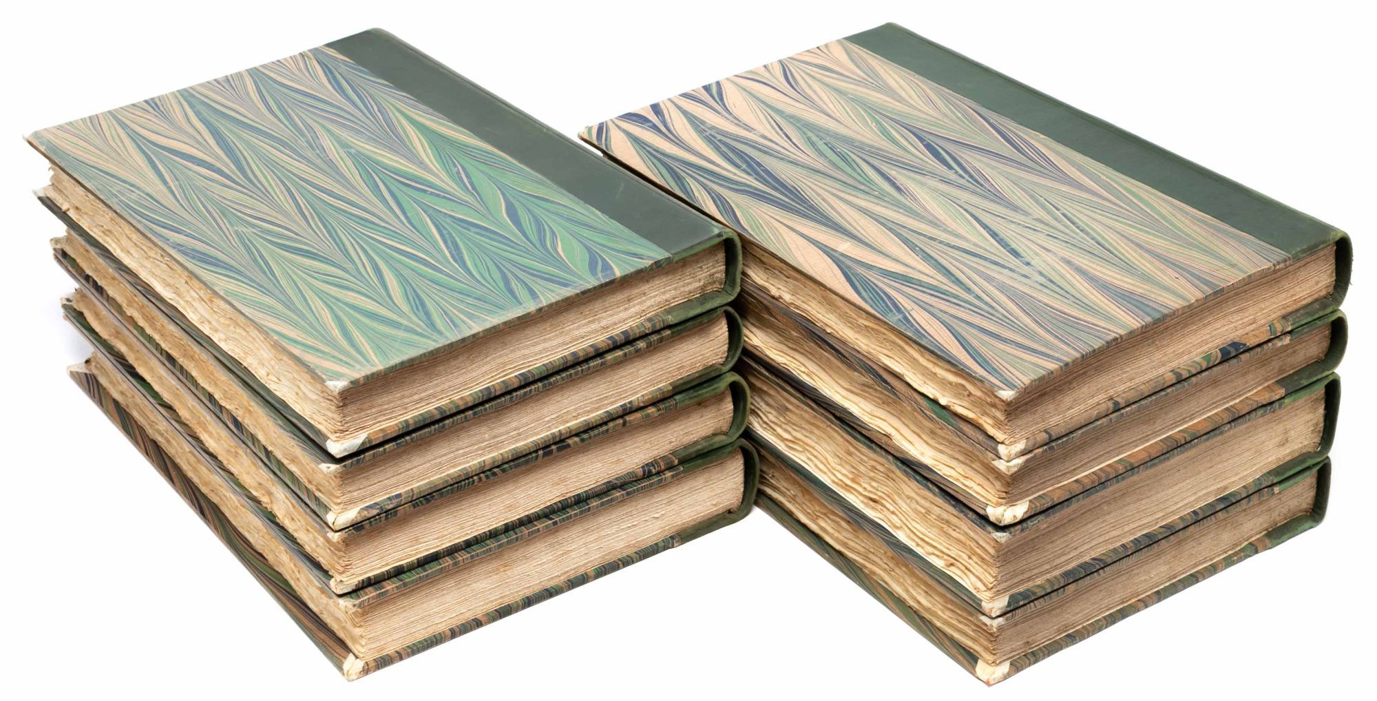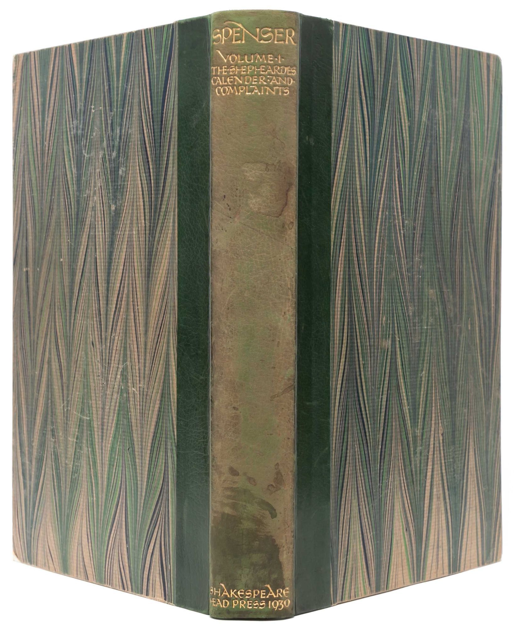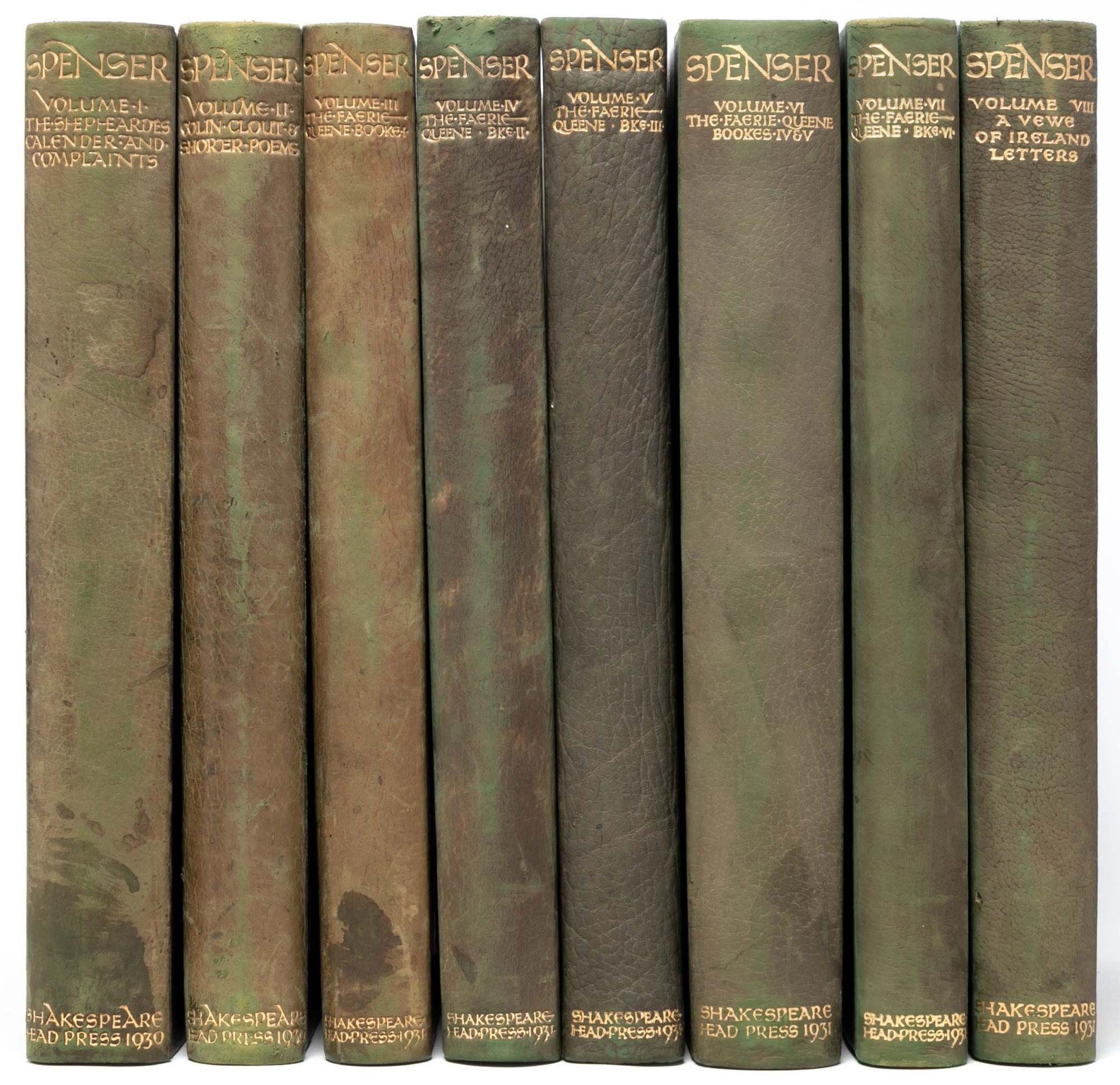 Oxford: Printed at the Shakespeare Head Press…and Published for the Press by Basil Blackwell, 1932. First Thus. Very Good+. One of 375 numbered copies on Batchelor’s Shakespeare Head handmade paper (this copy being number 134), out of a total edition of 386 copies. Eight volumes, large octavo (11 3/16 x 7 1/8 inches; 285 x 194 mm.). Bound in the original quarter green calf over marbled boards by Douglas Cockerell. Vellum tips. Spines lettered and dated in gilt. Edges untrimmed. With 111 woodcut illustrations, decorations, and title vignettes after and by Hilda Quick, all hand-colored, except for five that are printed in red and black. A Vewe of the Present State of Ireland with pictorial woodcut title-page border and woodcut frontispiece map of Ireland by Macdonald Gill, both hand-colored. Lettering for half-titles, title-pages, headings, and initials printed in red, black, and blue after designs by Joscelyne Gaskin, some shoulder notes printed in red, with occasional text printed in red and black. Some scuffing to boards and rubbing to spines. Mid-twentieth-century ink ownership inscriptions in first two volumes. Bright and fresh throughout. A Very Good+ set.