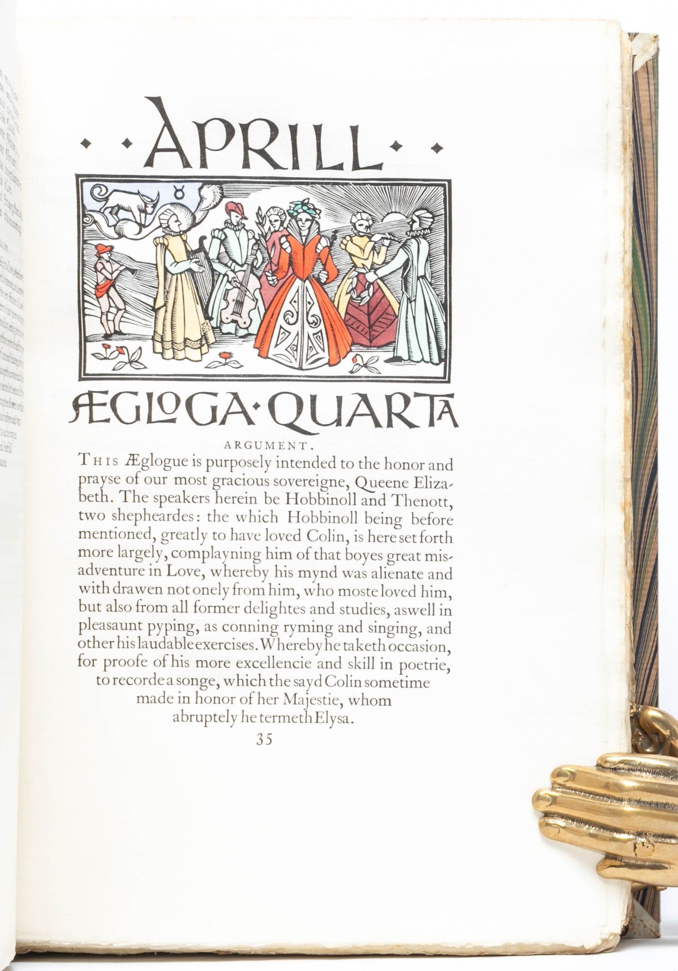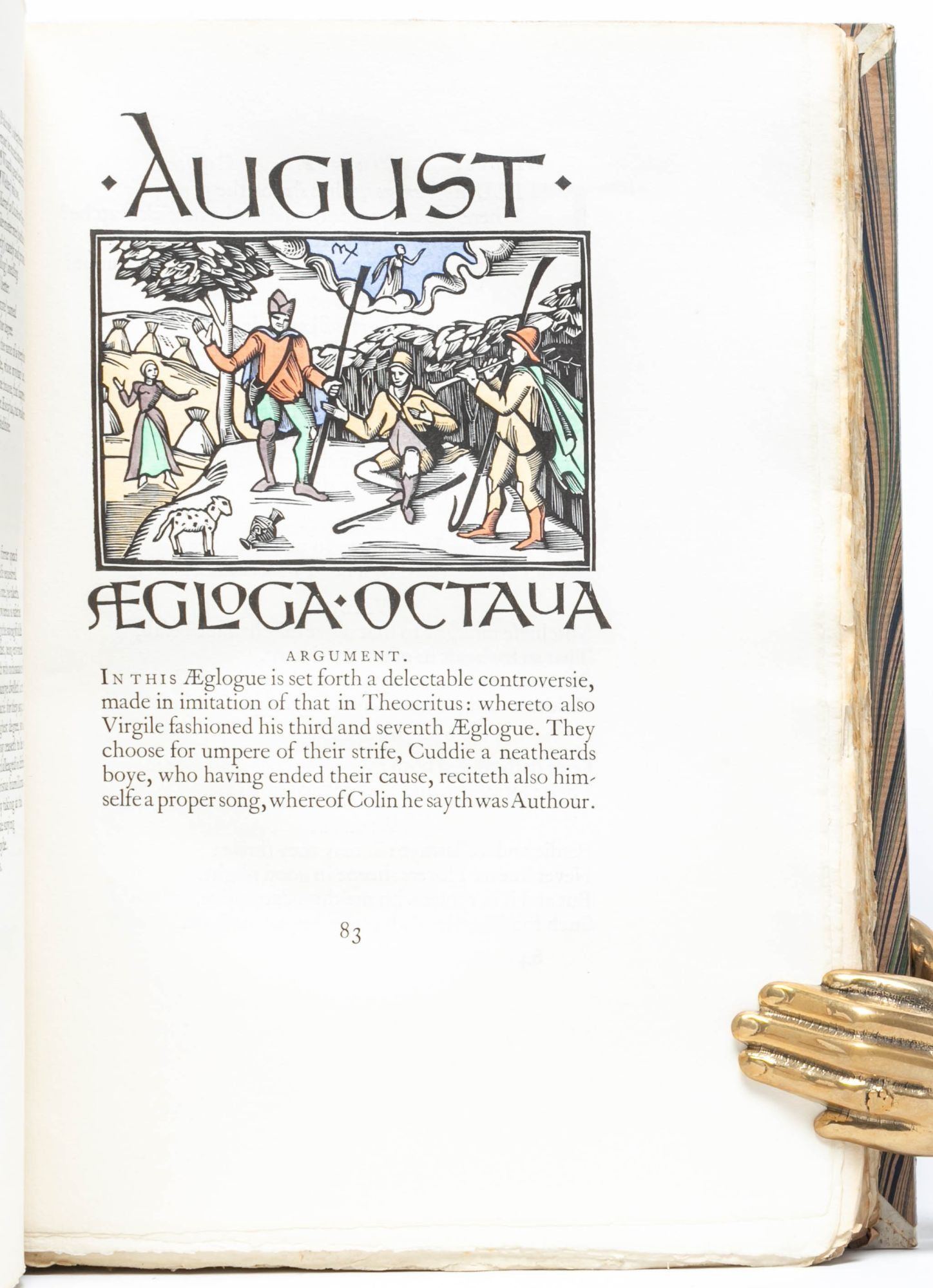 “The text of the present edition of Spenser’s Works has been prepared by Professor W.L. Renwick. It follows in every case the first editions…The decorations have been designed and engraved on wood by Hilda Quick, those in The Shepheardes Calender being based on the cuts in the original editions. The initial letters and the letterings for the title- page and headings have been engraved by her from designs by Joscelyne Gaskin...The eight volumes of Spenser, 1930, are equally good—different, as the character of the author, is, but in merita nothing to choose between them. Perhaps the small devices below Spenser’s sonnets, printed in black and in the vellum copies beautifully laid with gold, are the most discreet and opulent form of decoration, fitting and in flawless taste” (Franklin).