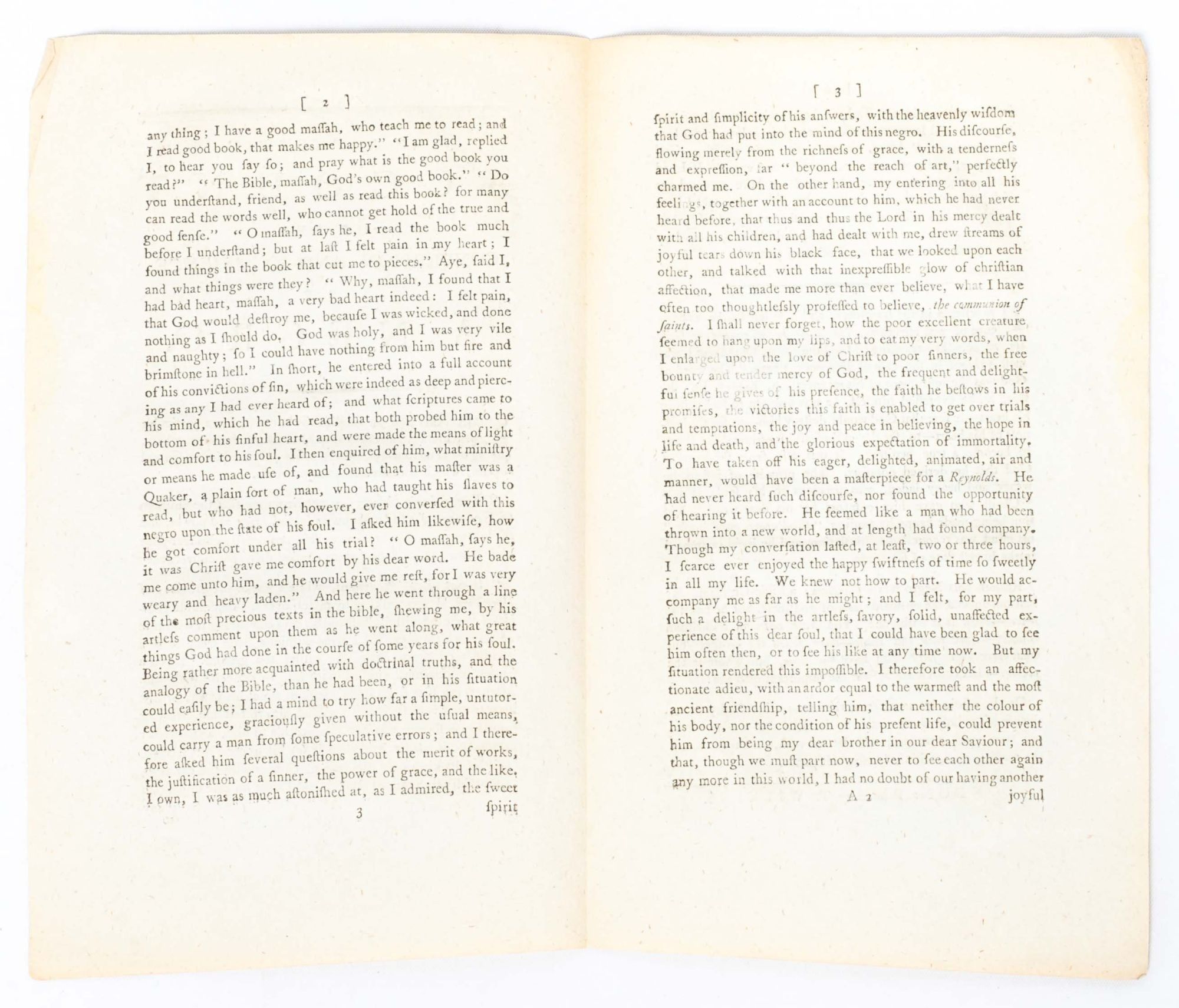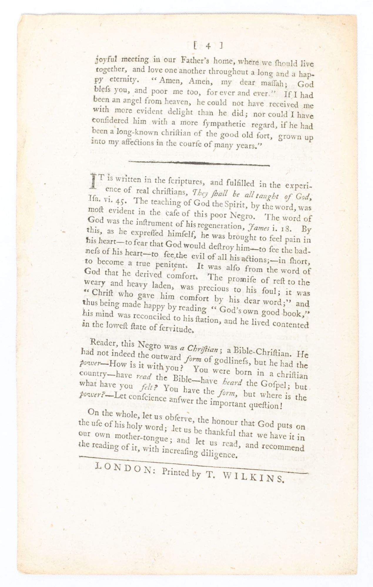 An Authentic Account records a brief encounter between a white Englishman and an enslaved Black man on a plantation in New York. Focusing their dialogue on the word of God and on salvation, the white narrator asserts that the two men could find common ground as "children of God...equally effectual with him" despite their diametrically opposed positions within the social power structure. "Neither the color of his body, nor the condition of his present life, could prevent him from being my dear brother in our dear saviour." Despite this argument for the spiritual equality of men of all races, the white narrator in An Authentic Account never questions nor seeks to subvert a power structure that would empower him while violently debasing Black people. Rather, he passively participates in the Evangelical attitude so common of the era, which considered enslavement an opportunity for saving the souls of uncivilized peoples who otherwise could not access the word of God. It was a position which abolitionist Evangelicals including William Wilberforce and Hannah More would decry as the height of hypocrisy in their own work during the period, calling upon Christians not only to see Black people as spiritual equals but also as humans deserving equal liberty and dignity.
