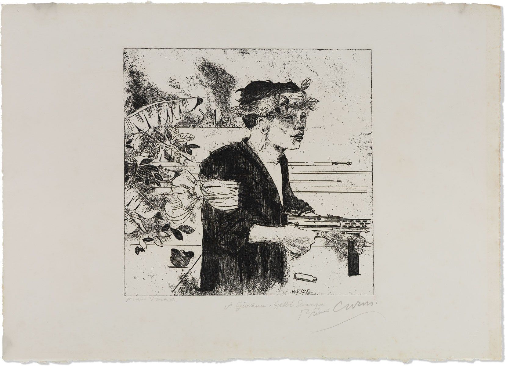 A striking image by Sicilian painter, illustrator and printmaker Bruno Caruso (1927-1918). Much of Caruso's work during the late 1960s and early 1970s was intensely political, inspired by social justice movements around the world including anti-colonial movements in Africa, the civil rights movement in the U.S., and, as here, opposition to the Vietnam War.