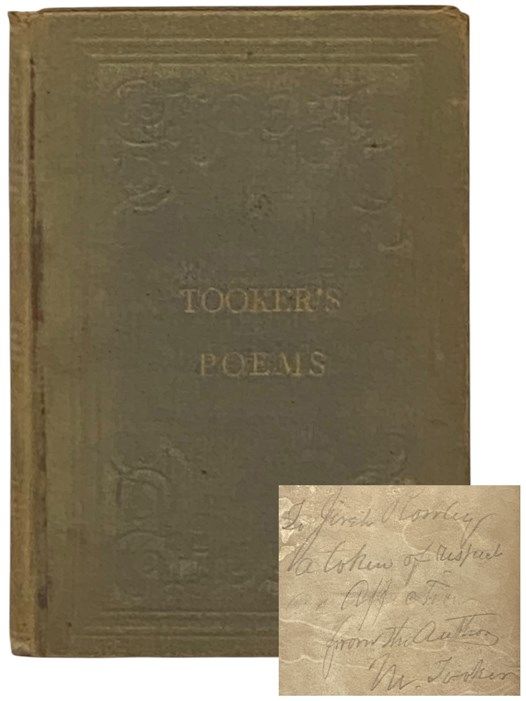Rochester: E. Darrow & Brother, 1860. First Edition. Hard Cover. Good/No Jacket. 0x0x0. Signed by author. First edition. Inscribed and signed by author in pencil on front endpaper ('To J--- Rowley, a token of respect and affection from the author, M. Tooker'). Front hinge weak, board edges faded, pages lightly foxed. 1860 Hard Cover. iii, 160 pp. Original blind-stamped cloth, gilt titles. A collection of poems, together with a sketch of the writer's life and labors, which included numerous appointments within New York State. This section includes interesting details about local political and religious history.