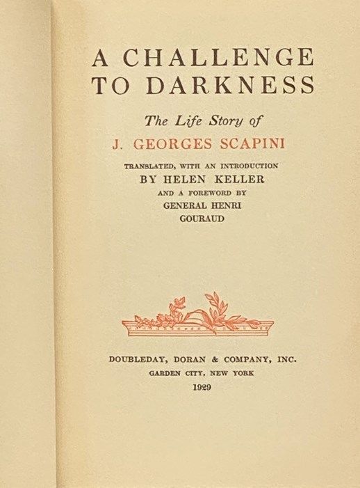 Garden City, New York: Doubleday, Doran & Company, Inc, 1929. First American Edition. Hard Cover. Very Good/Very Good. 9x6x1. First American edition. Jacket edges lightly rubbed with two tiny closed tears. 1929 Hard Cover. xx, 173, [1] pp. 8vo. Translated from the original French, with an introduction, by Helen Keller, foreword by General Henri Gouraud. "The blind hero of France, who lost his sight in the trenches, conquered his great handicap, won admittance to the bar and became a member of the Chamber of Deputies, tells the moving and dramatic story of his life.