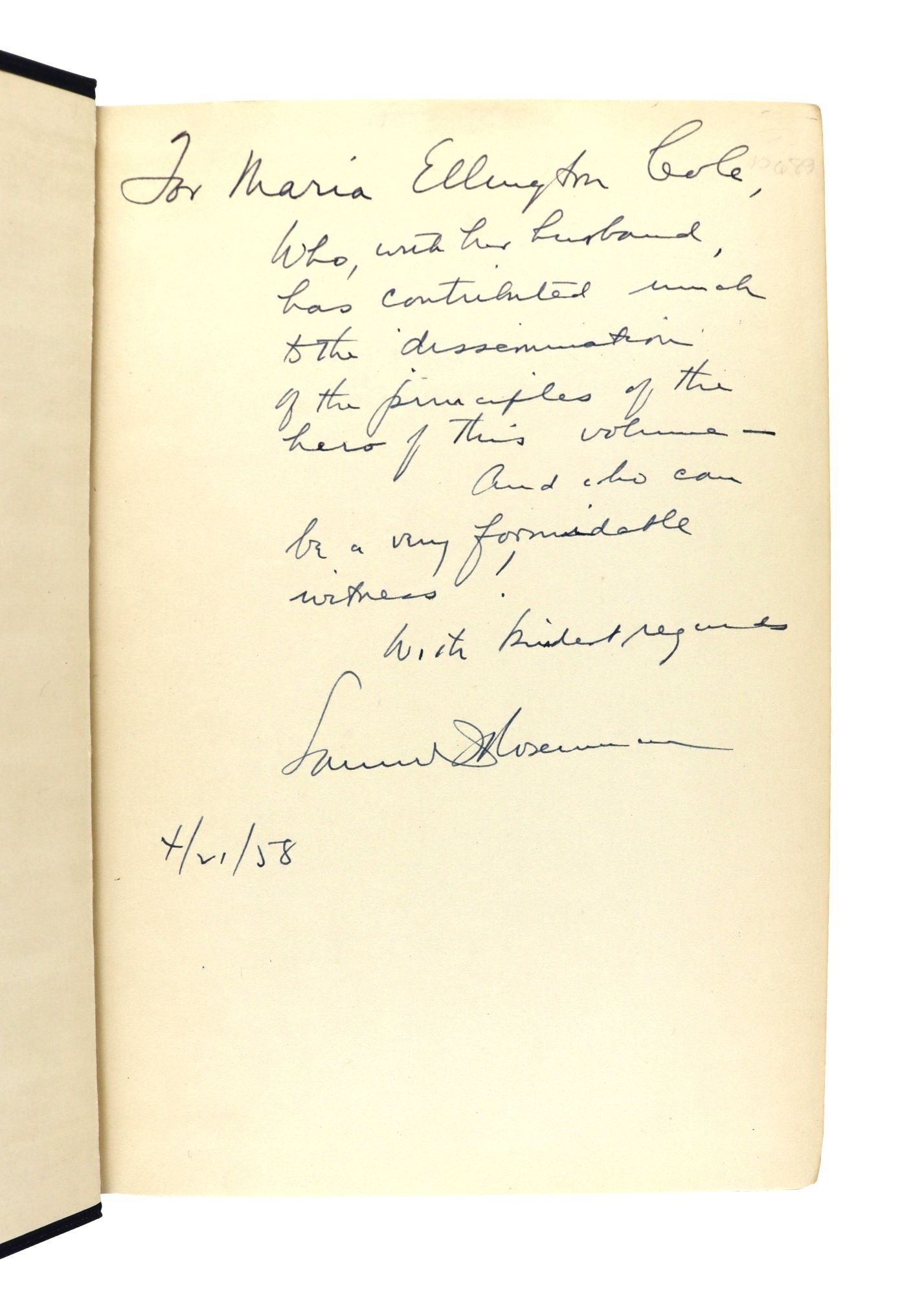Signed at front free endpaper, "To Maria Elllington Cole, Who, with her husband, has contributed much to the dissemination of the principles of the hero of this volume - and who can be a very formidable witness! With kindest regards, Samuel Rosenman." Maria Cole (née Hawkins) went by Maria Ellington following her marriage to Spurgeon Ellington, a Tuskegee Airman who died during a training flight. She worked as a jazz singer in the 40s with the likes of Duke Ellington and Count Basie, and eventually married Nat King Cole in 1948. We have yet to find what trial or situation Cole may have been a "witness" to Judge Rosenman, but nevertheless, an intriguing association copy of the judge and Democratic Party activist's memoir. Rosenman was very influential throughout the Roosevelt administration and coined the term "New Deal.