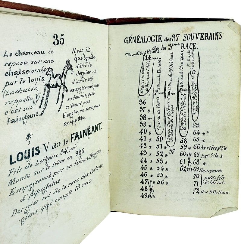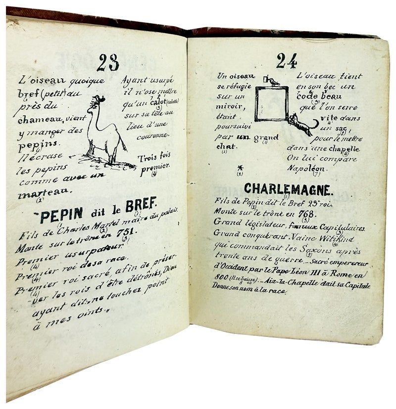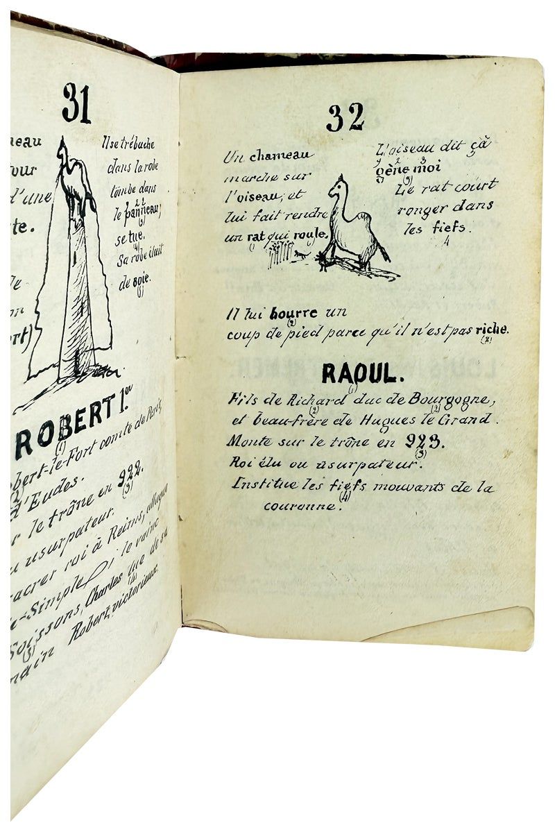 Charming (and arguably unusable) little reference work published by the widow Emilie Allevy and her two eldest sons Achille and Alcide in honor of their late husband and father Pierre Louis Allevy (1784-1842). An indefatigable and idiosyncratic educator and inventor, Pierre Louis appears in the public record as having applied for a patent for a hydroponic mechanism for rescuing fire victims; wrote up a proposal to have Napoleon's tomb be encased in a crystal ball (it was quickly rejected); and devised a system for recalling the names and dates for all the kings of France using this system of phrases, illustrations, and symbols--for example the number 1 is represented by a tower, number 2 by a waterbird, number 3 by a camel, etc.