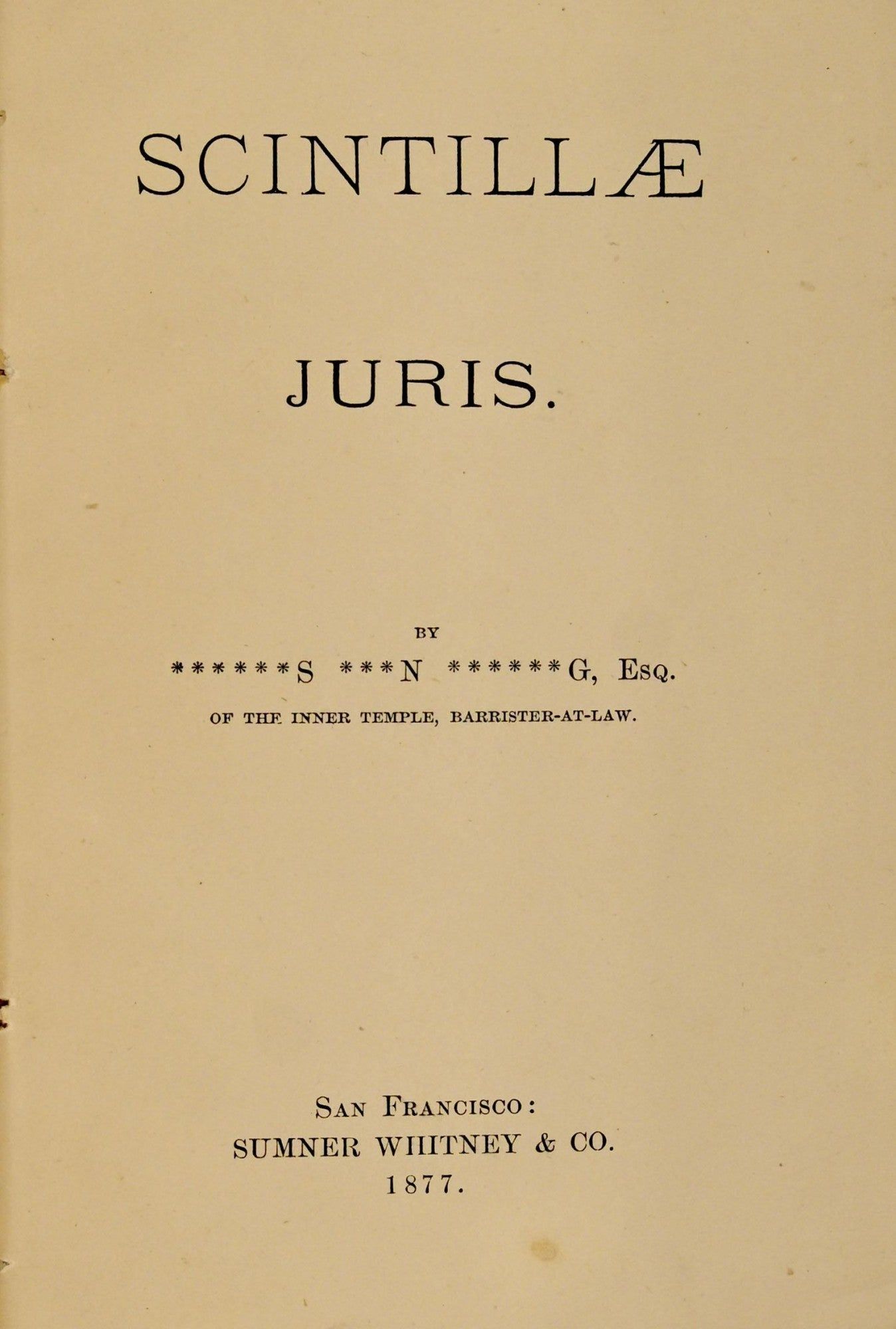 San Francisco: S. Whitney & Co, 1877. Original Wrappers. Very Good binding. 8vo; in cream-colored printed wrappers; 76 pages; the covers have tidelines, and the spine is mostly perished, though the binding is tight and secure.~~Though he often spoke on legal issues and was appointed a Justice of the High Court, the London Times averred that concerning him there was “no sign of legal eminence”. His observations were pithy: “With laws we have small concern until they have been contemned, or set at naught.” [p, 10].~~Uncommon in commerce and in institutional holdings. Very Good binding.