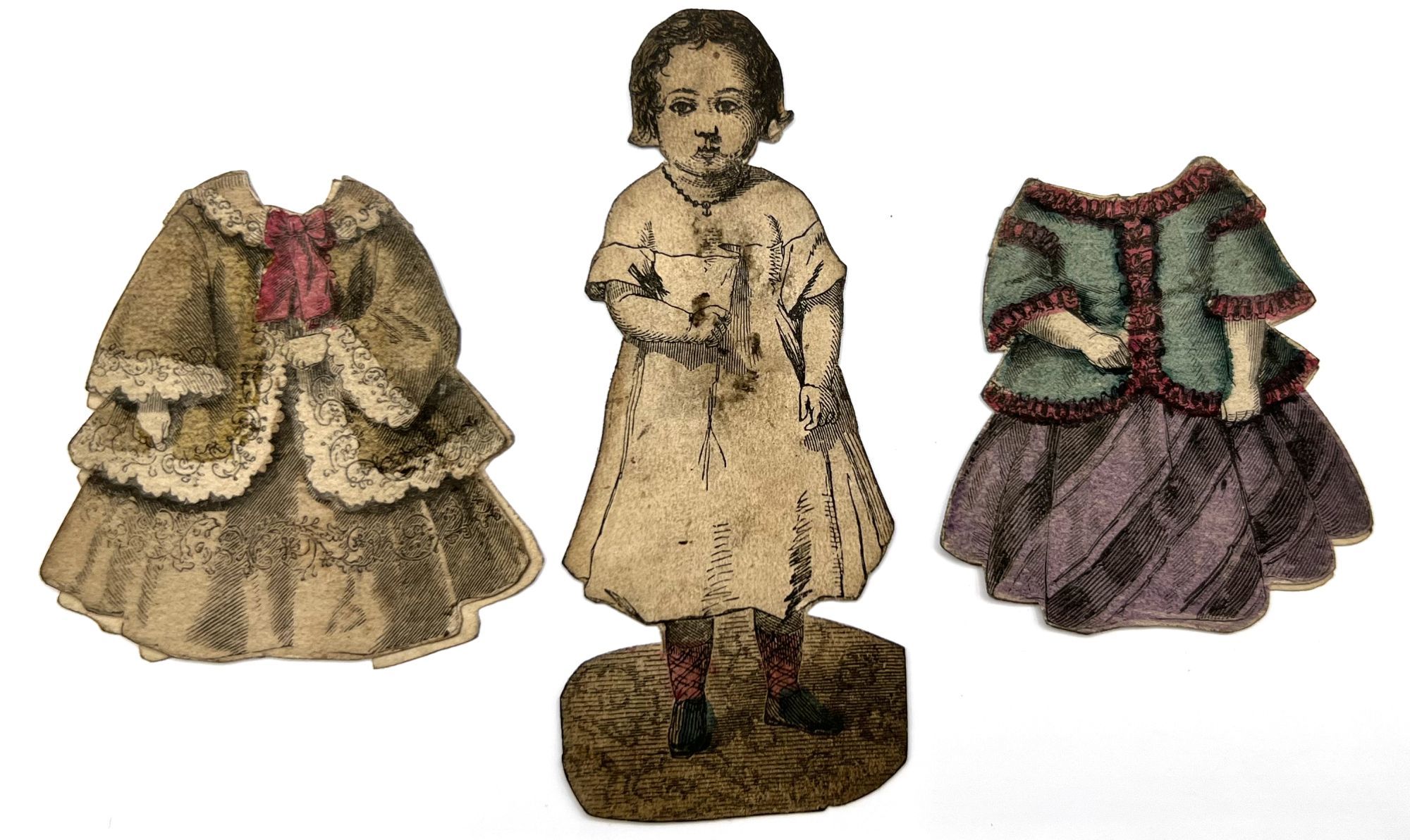 New York, New York: McLoughlin Bros, 1850. Very good. Dust- or finger-soiling. Lacks three original costumes and one head/hat, as well as the original illustrated envelope. A scarce McLoughlin Bros. paper doll with two outfits titled "The Little Pet". Published in the 1850s, it is an exact duplicate of "The Little Pet" paper doll published in 1857 by Clark, Austin & Smith "except for a fifth costume ... [that] may or may not have been originally included in Clark, Austin & Smith's printing" (Howard p.78). Each costume is printed on front only, and has a blank back to drape over the doll like an apron. This example lacks three original costumes and one head/hat, as well as the original illustrated envelope. Doll measures 3.25". Wood engraved with hand coloring. Cut. Howard No. 63.