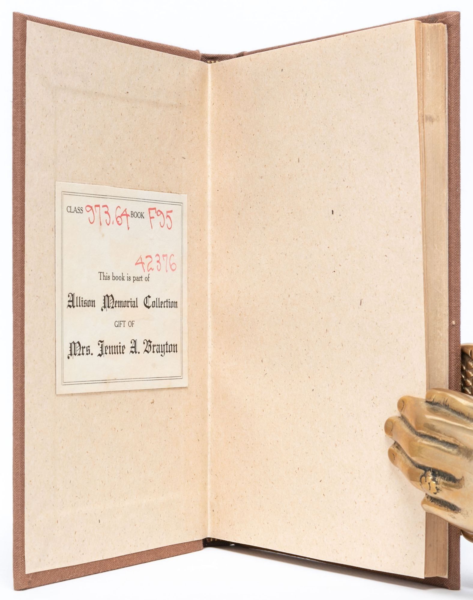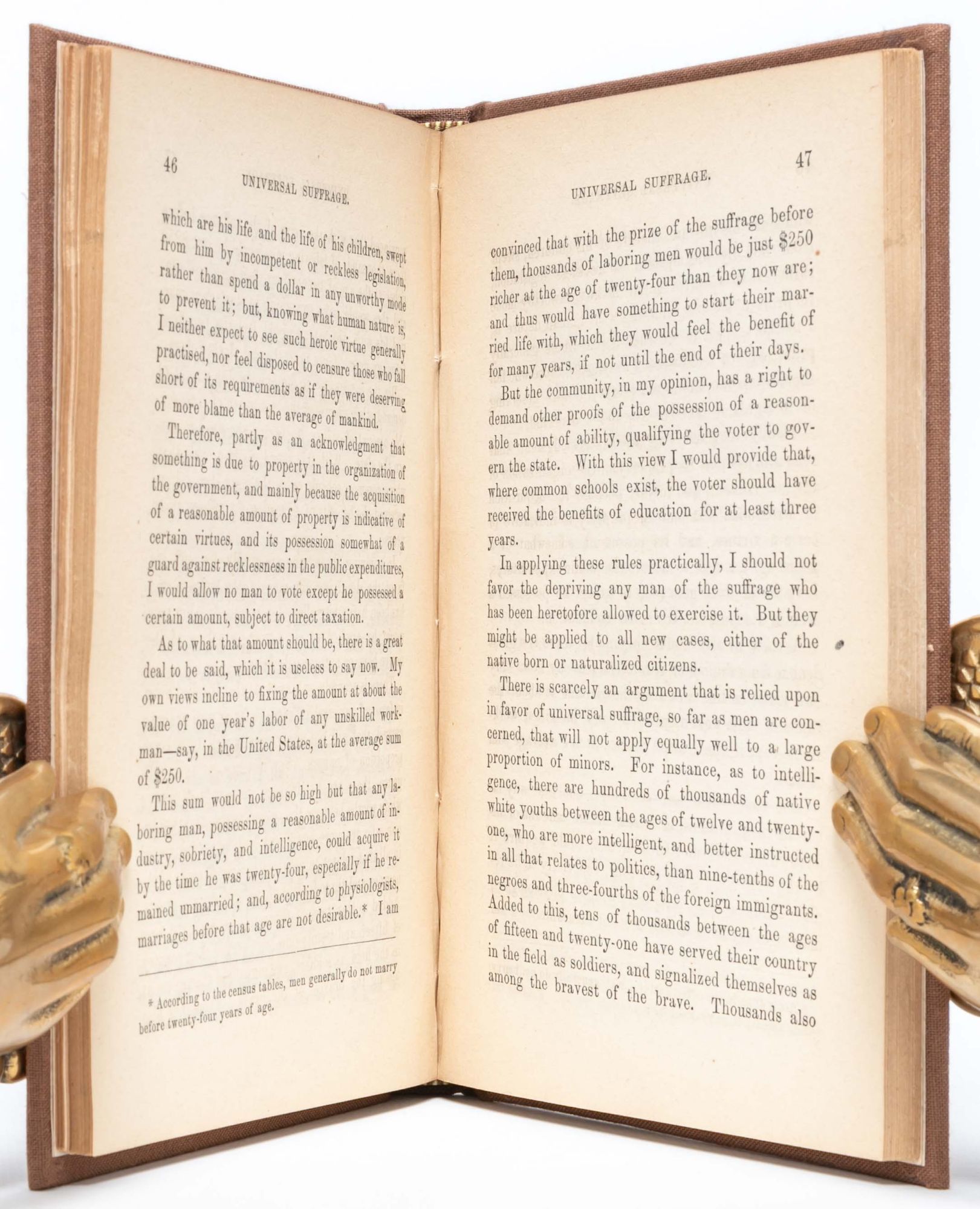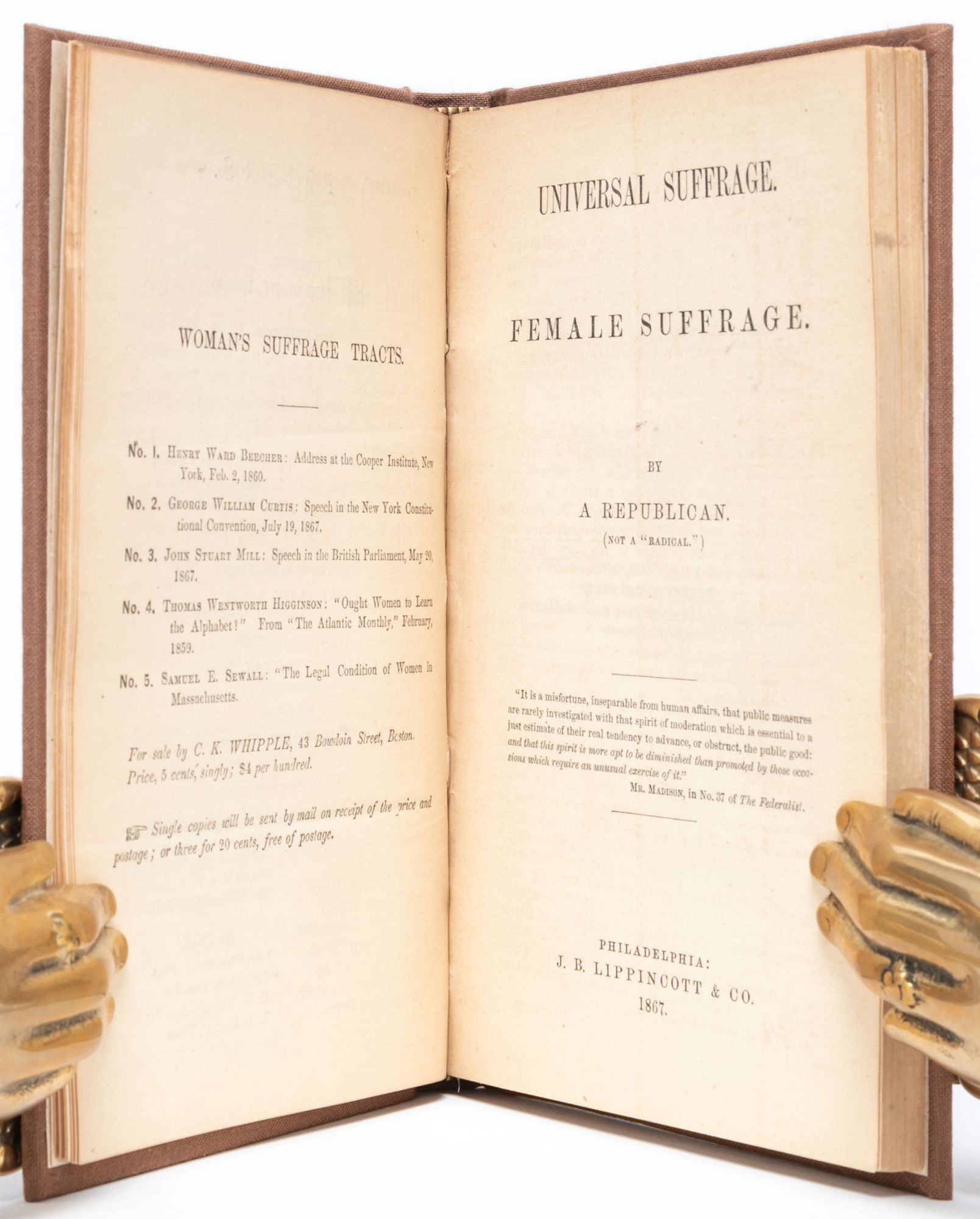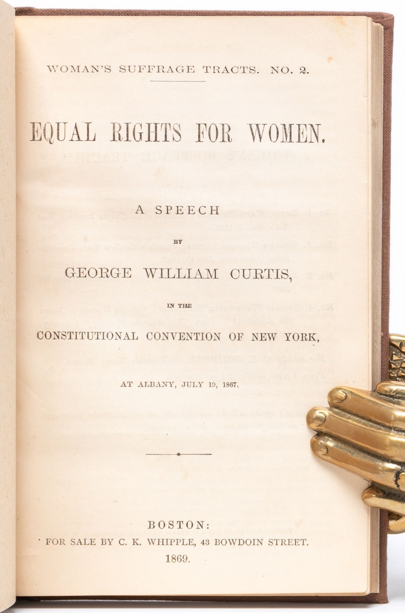 Boston [and] Philadelphia: C.K. Whipple [and] J.P. Lippincott & Co, 1869. Mixed editions. Fine. Second edition of Equal Rights for Women. A Speech by George William Curtis (Boston: C.K. Whipple, 1869) – though the first edition as part of the Woman's Suffrage Tracts series – bound with the first edition of the anonymously-published Universal Suffrage. Female Suffrage (Philadelphia: J.P. Lippincott & Co., 1867). Modern brown cloth with gilt spine. Two works bound together, twelvemo. 24, [4]; 116 pp. With a four-page New England Woman's Suffrage Association Constitution and list of officers at the end of the first work. Exceptionally fresh, Fine copy. From the library of the Iowa Republican senator William B. Allison (1829 - 1908), with bookplate to upper pastedown identifying it as part of the Allison Memorial Collection of Mrs. Jennie A. Brayton. Both of these works are scarce, these being the only examples on the market.
