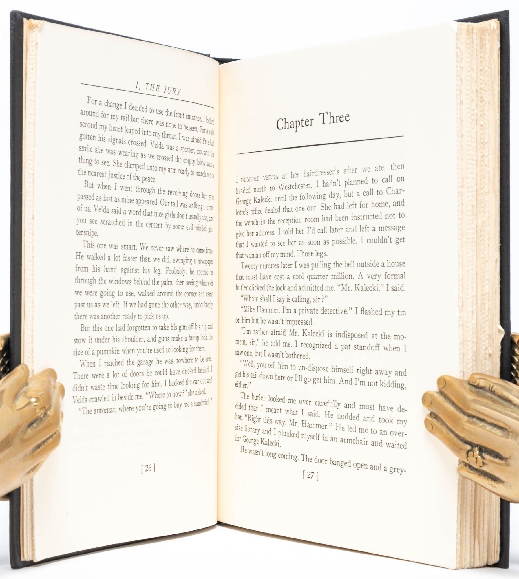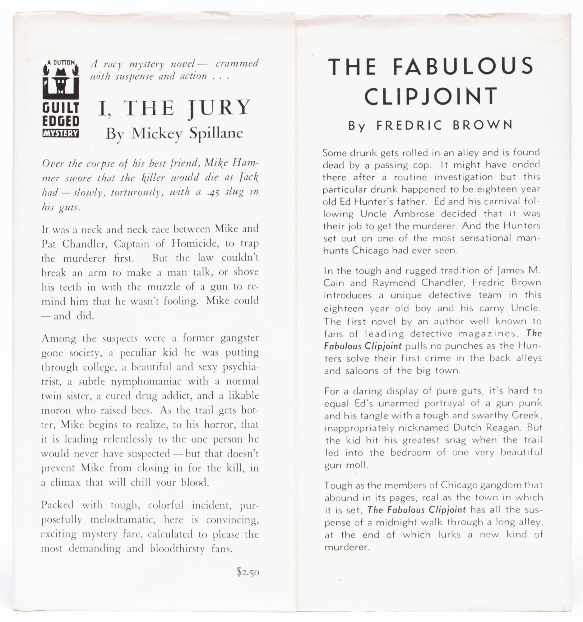 In his debut novel, Mickey Spillane introduces Mike Hammer, the hard-boiled private eye that would feature in over a dozen novels, five feature films, and several television series. I, the Jury sees Hammer uncovering a drug ring and avenging the murder of his friend Jack Williams, who saved Hammer's life during World War II. The bestselling novel was adapted for the screen twice, once in 1952 and once in 1983. Spillane (1918 - 2006), sometimes referred to as the "king of pulp fiction," was a prolific mystery author who received the Edgar Allan Poe Grand Master Award in 1995. Fine in Near Fine dust jacket.