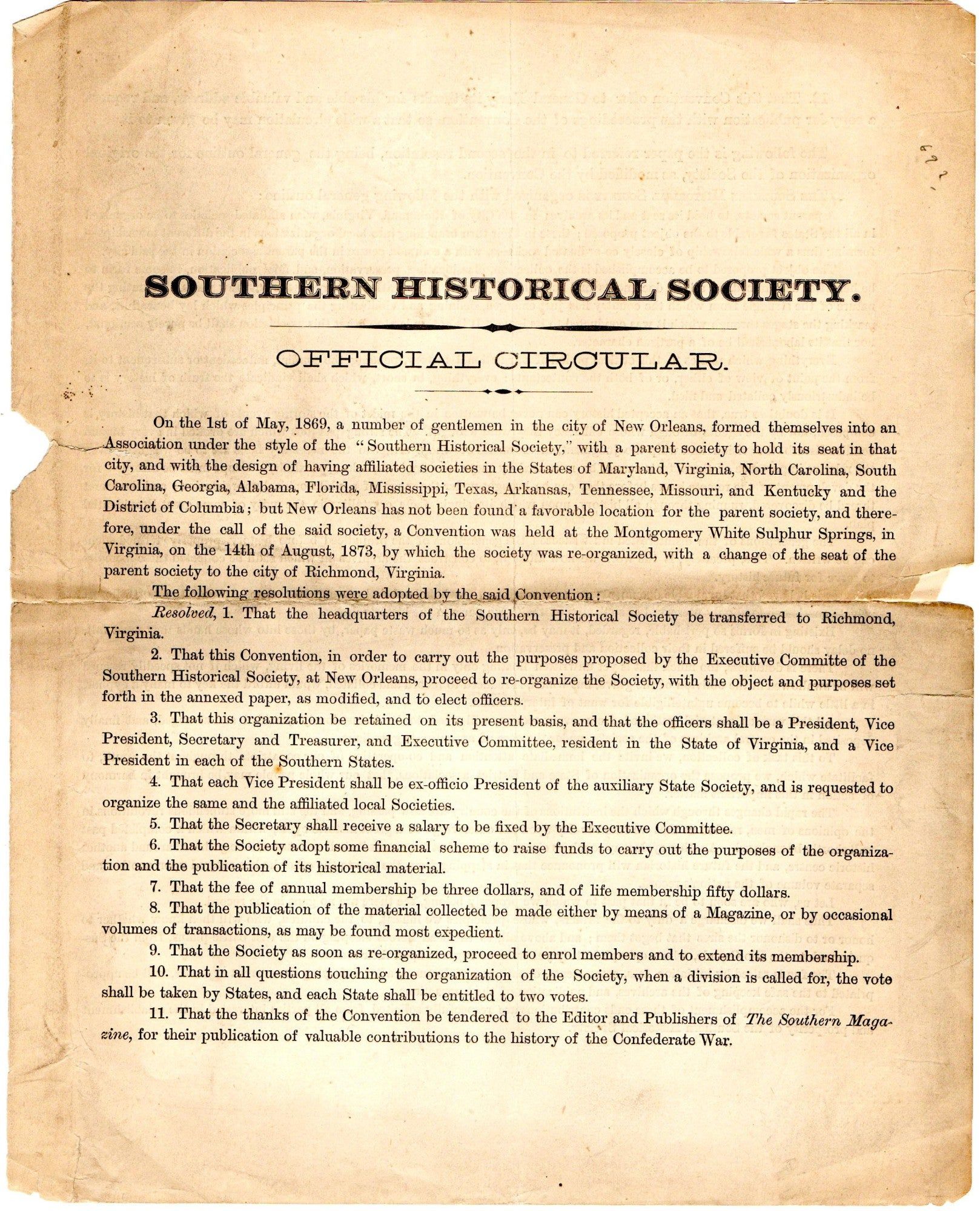 [LOST CAUSE] SOUTHERN HISTORICAL SOCIETY CIRCULAR