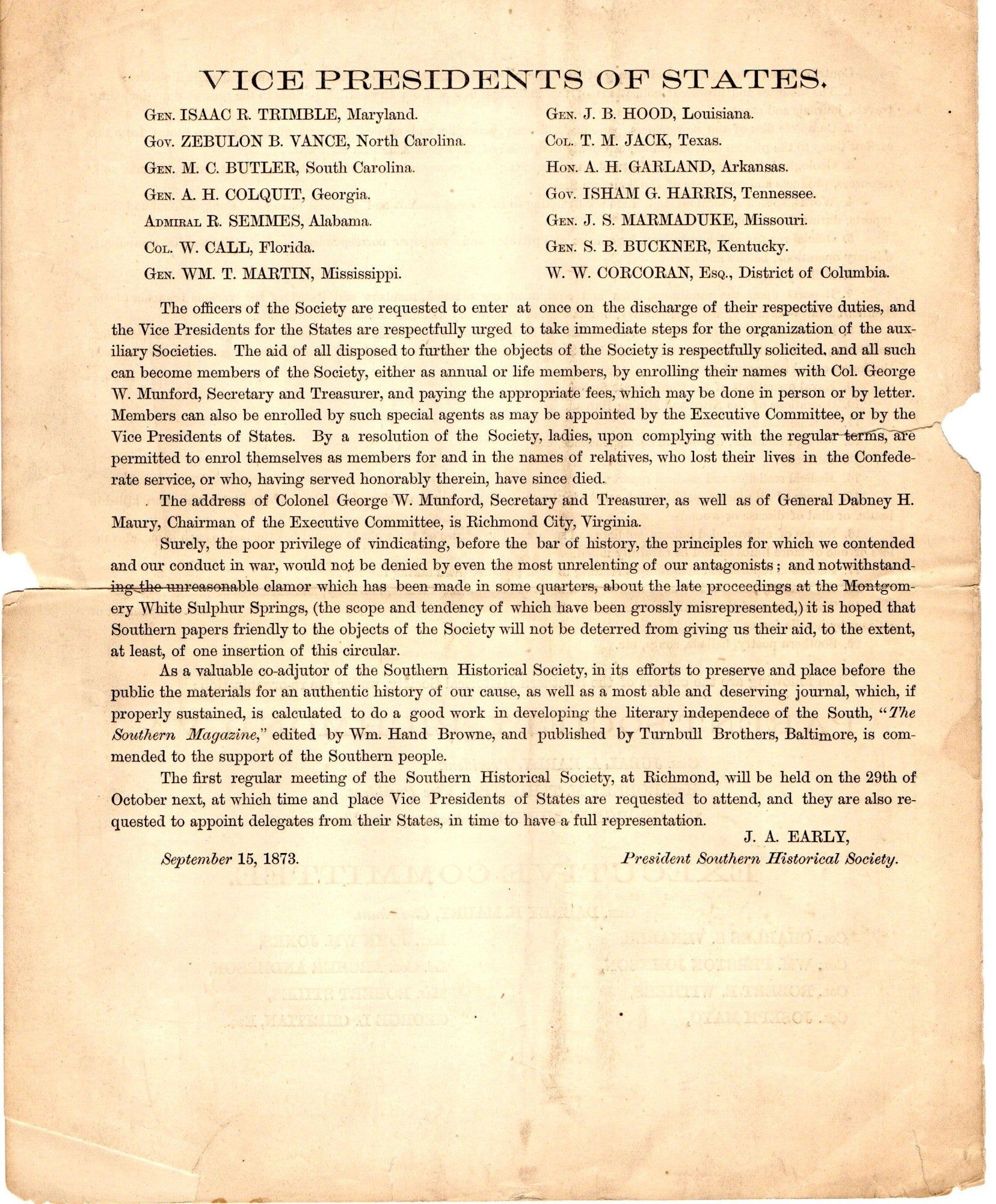 Richmond, VA, 1873. This Southern Historical Society Official Circular was written by its President, Jubal A. Early, dated September 15, 1873. Jubal Early (1816-1894) was a Confederate army officer, lawyer, and Virginia state legislator. Early was also a seminal proponent of the Lost Cause movement and a prominent white supremacist. ~~In this circular Early gives a brief history behind the formation of the Southern Historical Society and its reorganization at a convention held in Sulphur Springs, VA the summer of 1873, and its move from New Orleans to Richmond. He follows this with 12 resolutions adopted for the society at the convention and a general outline of the society, a solicitation for contributions to its library and archive, and a list of officers. Its mission is stated toward the conclusion of the circular to “preserve and place before the public the materials for an authentic history of our cause” as well as to develop the literary independence of the South. Of interest, women were explicitly allowed to join the membership, albeit in the name of their relatives who served or died in the Civil War. ~~Small loss to center binding and nibbled corners. Tear and small loss at horizontal fold. Slight discoloration with age. Pencil annotation in small writing first page. Good.~.