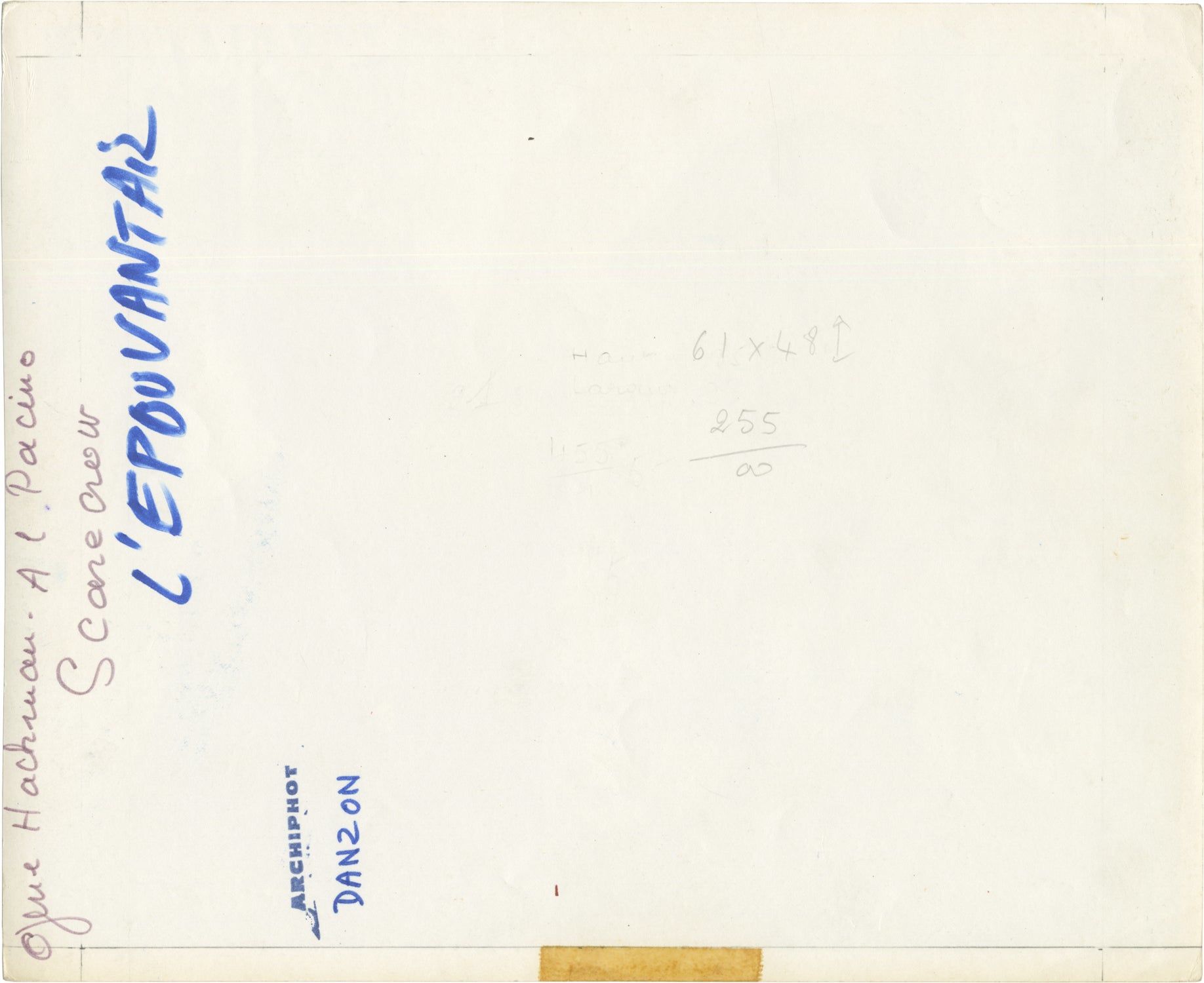 N.p.: N.p., 1973. Vintage reference photograph of actors Al Pacino and Gene Hackman on the set of the 1973 film. French press stamp on the verso, along with annotations in manuscript ink and pencil.