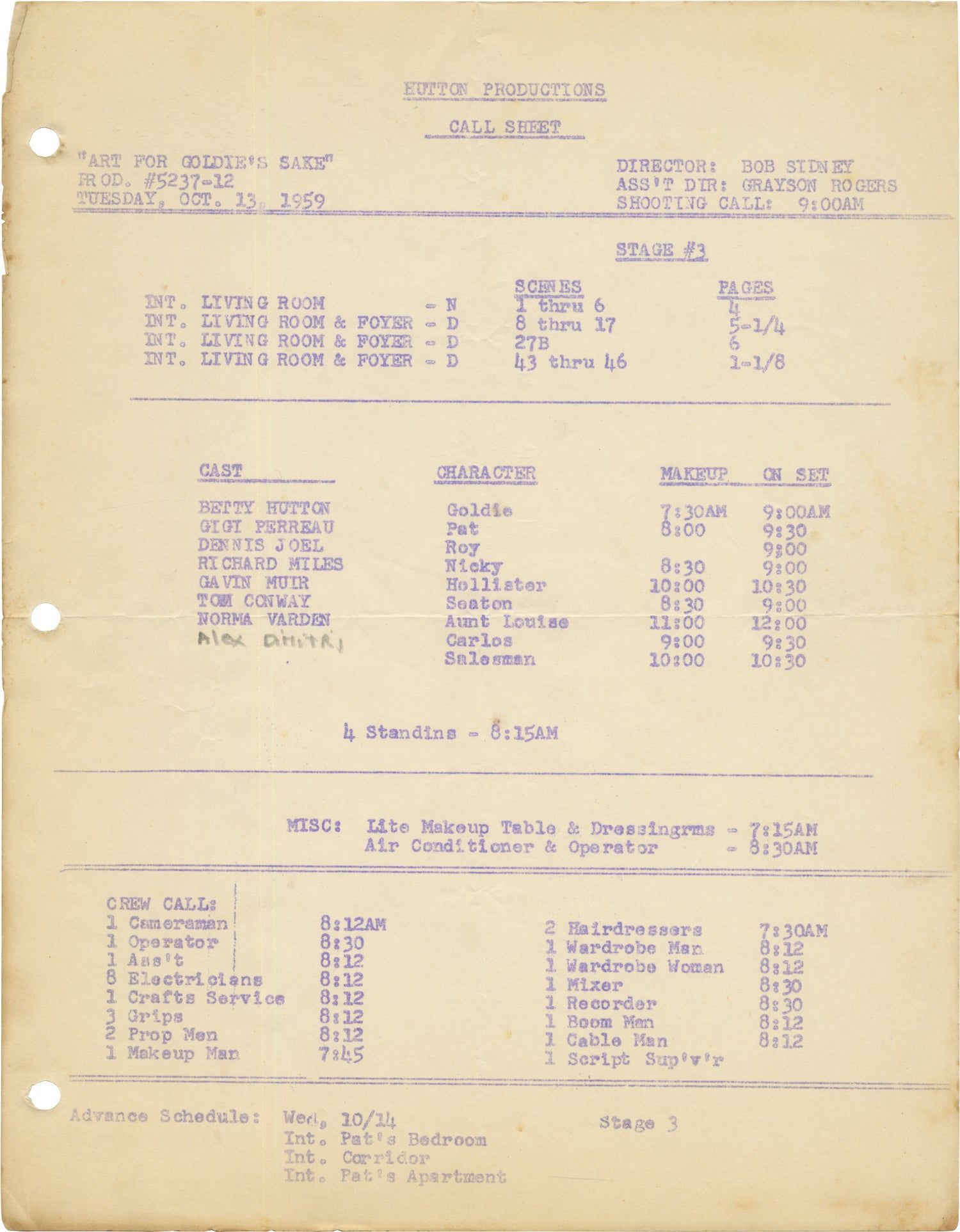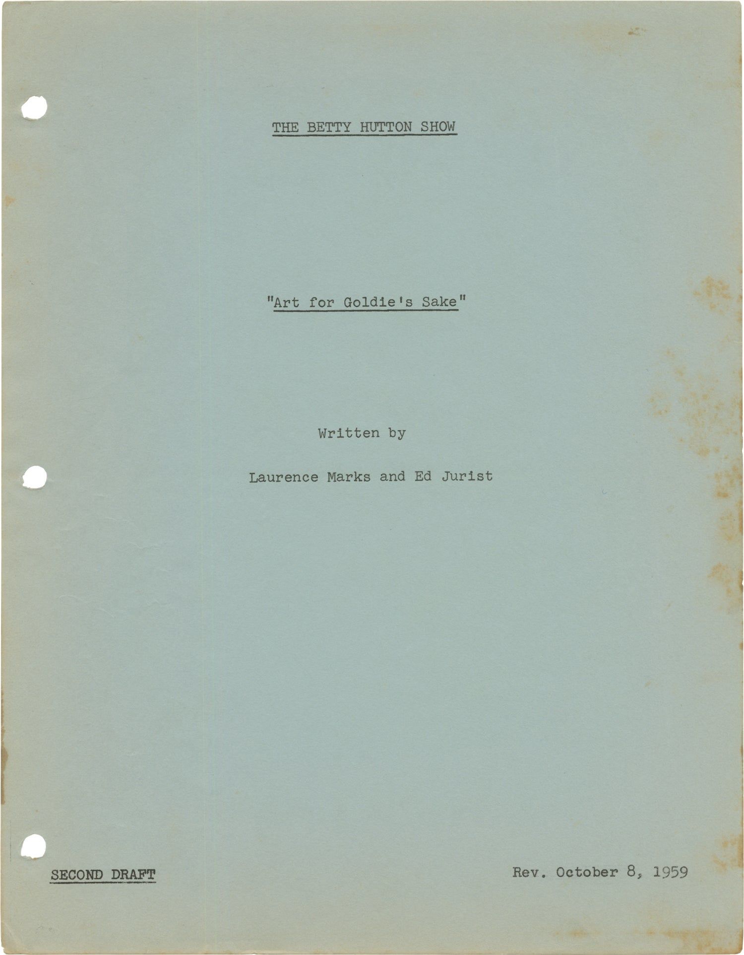 The Betty Hutton Show: Art for Goldie's Sake (Original screenplay and call sheet for the 1959 episode of the 1959-1960 CBS television series)
