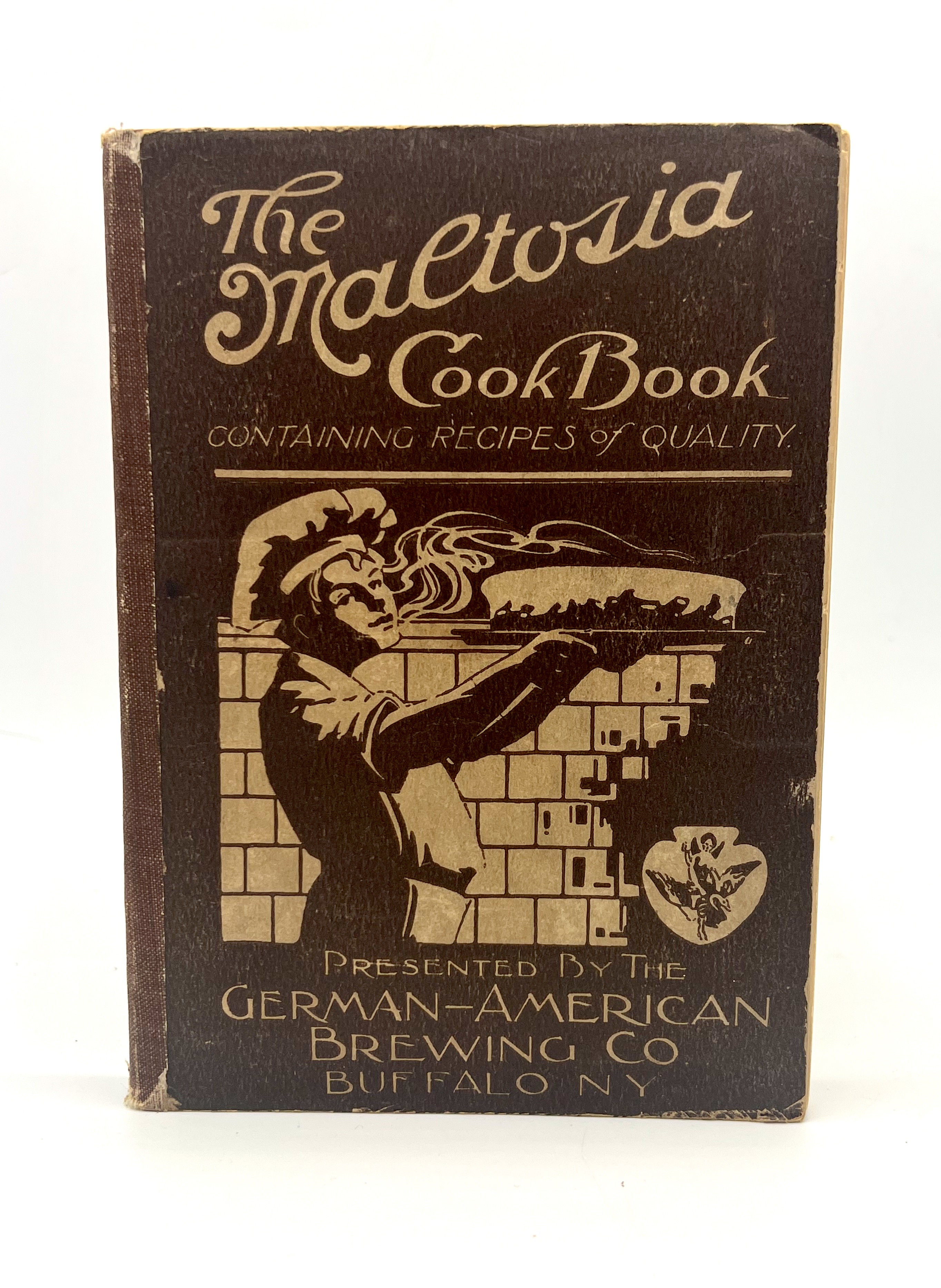Buffalo: The Great American Brewing Co. , 1912. Hardcover. Brown illustrated cloth covered boards. Very good. 224 pages. 18 x 13 cm. The German-American Brewing Company was a significant part of Buffalo, New York's rich brewing history, serving as both a cultural and social center for the city's German-American community. This cookbook has a large variety of recipes with many German favorites. With a modern brewery built in 1893, the iconic institution featured a rooftop beer garden. Unfortunately, like many of the other Buffalo's breweries, Prohibition forced these businesses to close their doors. Laid in: Handwritten recipe for Date Sticks. Recipe for Corn Salad written on verso of back cover. Interior clean, boards rubbed at edges.