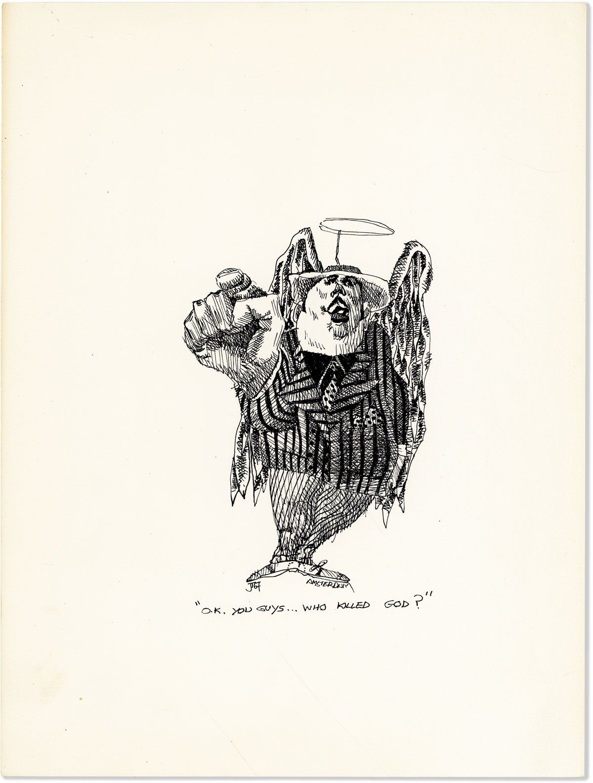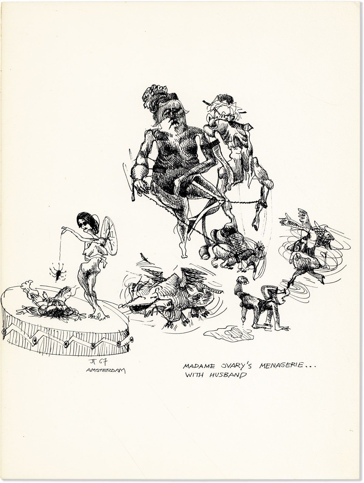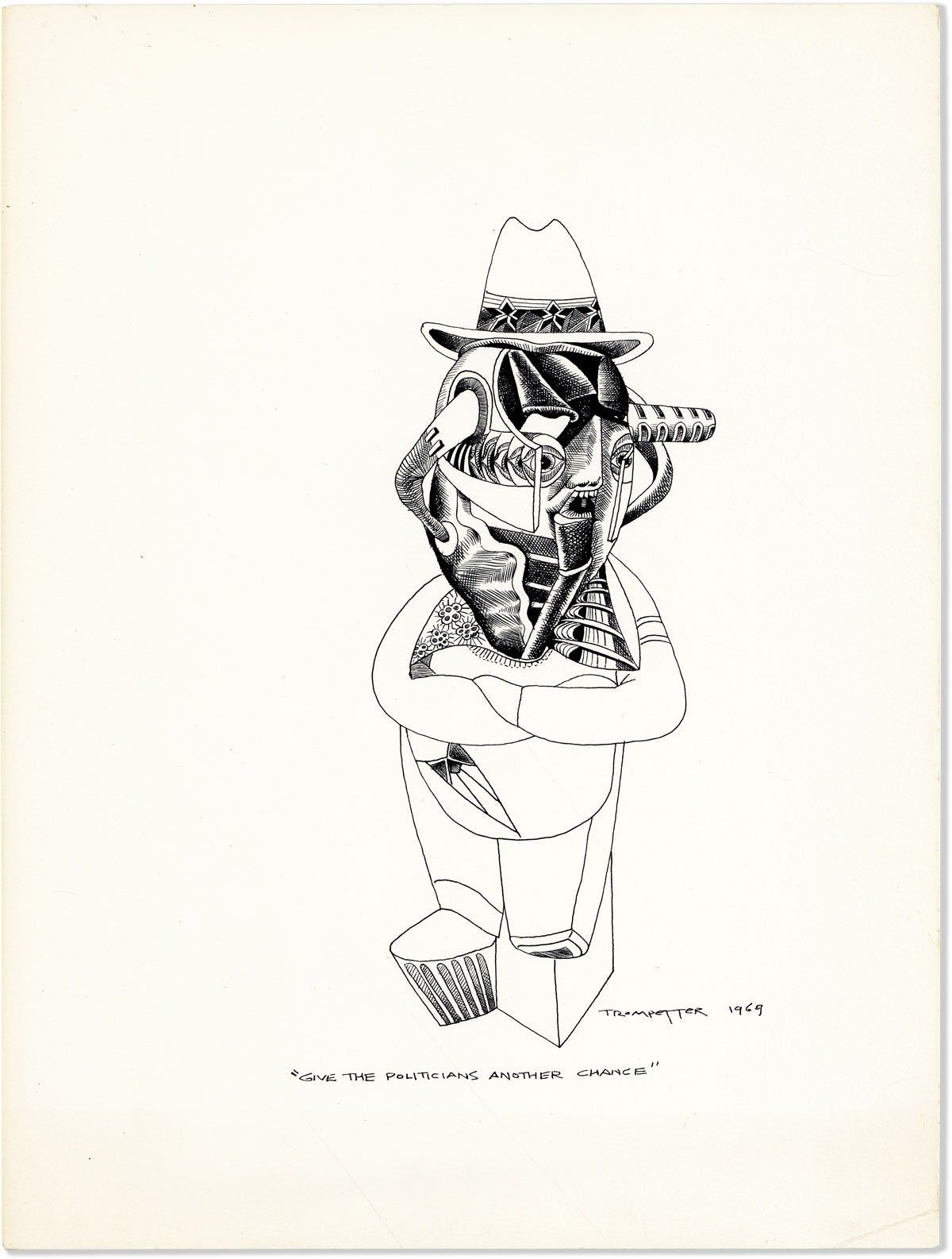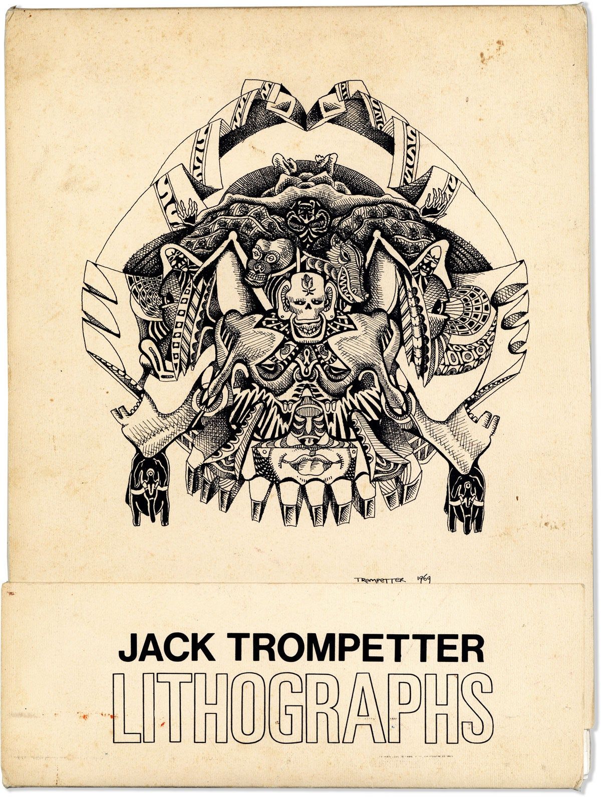 A rather enigmatic art portfolio, produced around 1969 by Massachusetts artist Jack Trompetter. Trompetter, born to Jewish parents in Amsterdam in 1942, is best-known for the striking cover art for the 1972 album "I Sing The Body Electric" by American jazz-rock fusion ensemble Weather Report. He has continued to produce artwork, much of it reflecting on current events and his childhood as a holocaust survivor. But this album of compelling, politically-themed pop-psychedelic lithographs, published we think around 1969 (when most of the pieces are dated) without a title page or introduction, appears to be a ghost: we can trace no copies in commerce, and it is entirely absent from OCLC catalogs.