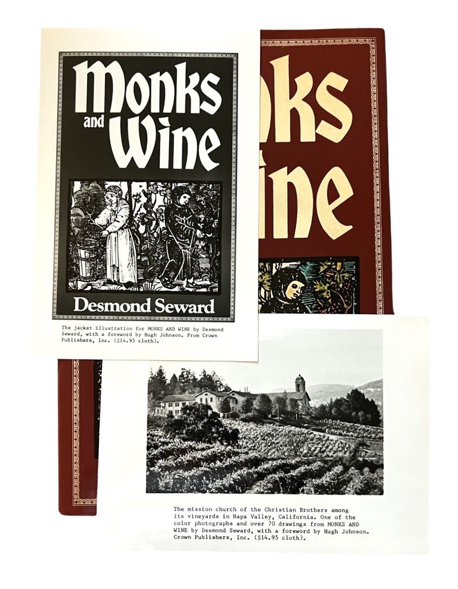 New York: Crown Publishers, Inc., 1979. Hardcover. Maroon cloth covered boards. Near fine, in near fine dust wrapper. 208 pages. 26.5 x 18.5 cm. Monks and Wine is an original, authoritative and elegant study of the one really important area of wine-making that has been almost entirely neglected to date. For well over a thousand years almost all the biggest and best vineyards were almost all the biggest and best vineyards were owned and cultivated by monks. These monastic orders most likely saved viticulture when barbarian invasions destroyed the Roman Empire. Illustrated throughout. Two publishers photos laid in. Interior and boards clean and crisp, dust wrapper lightly rubbed at edges. Covered in protective mylar.