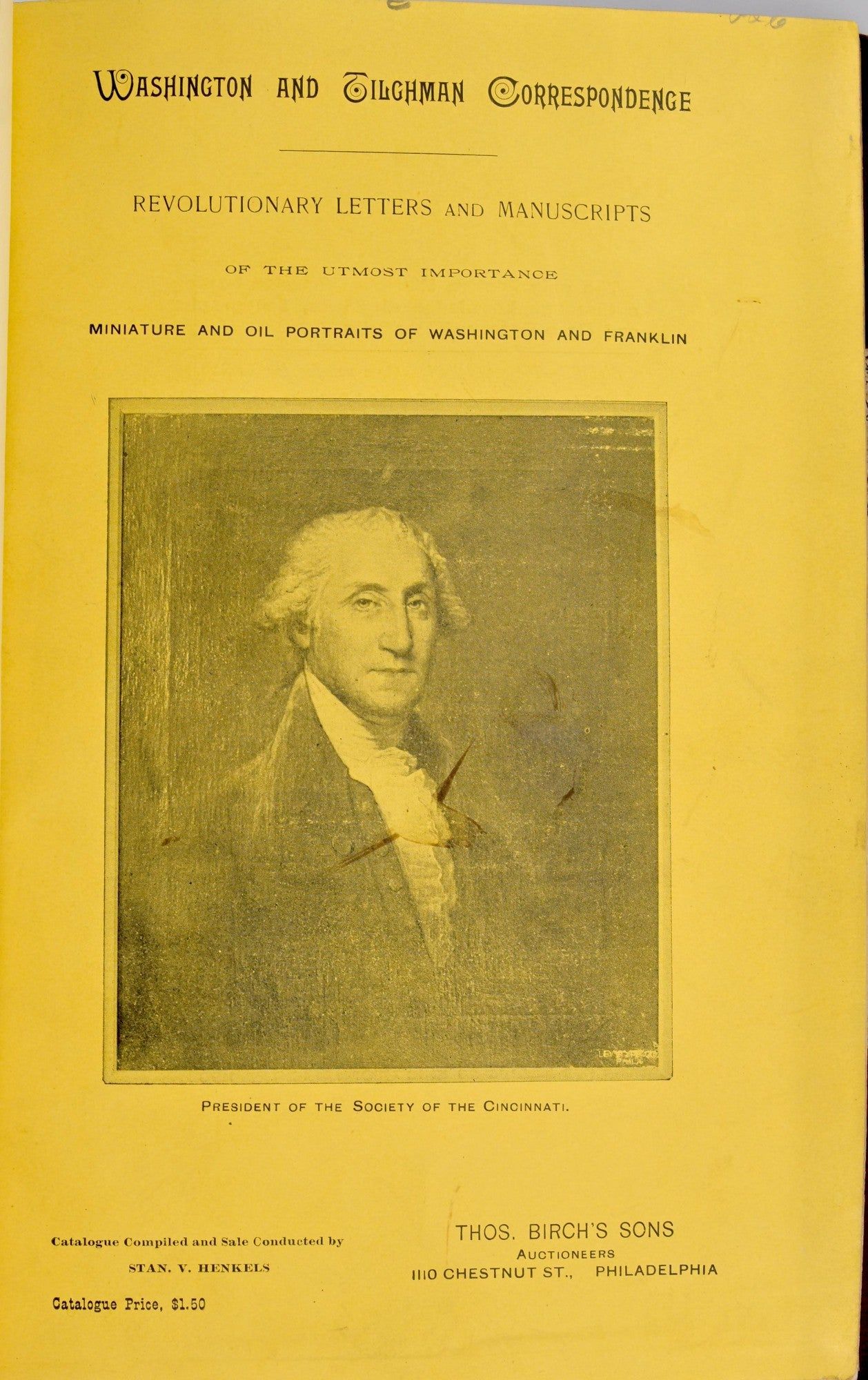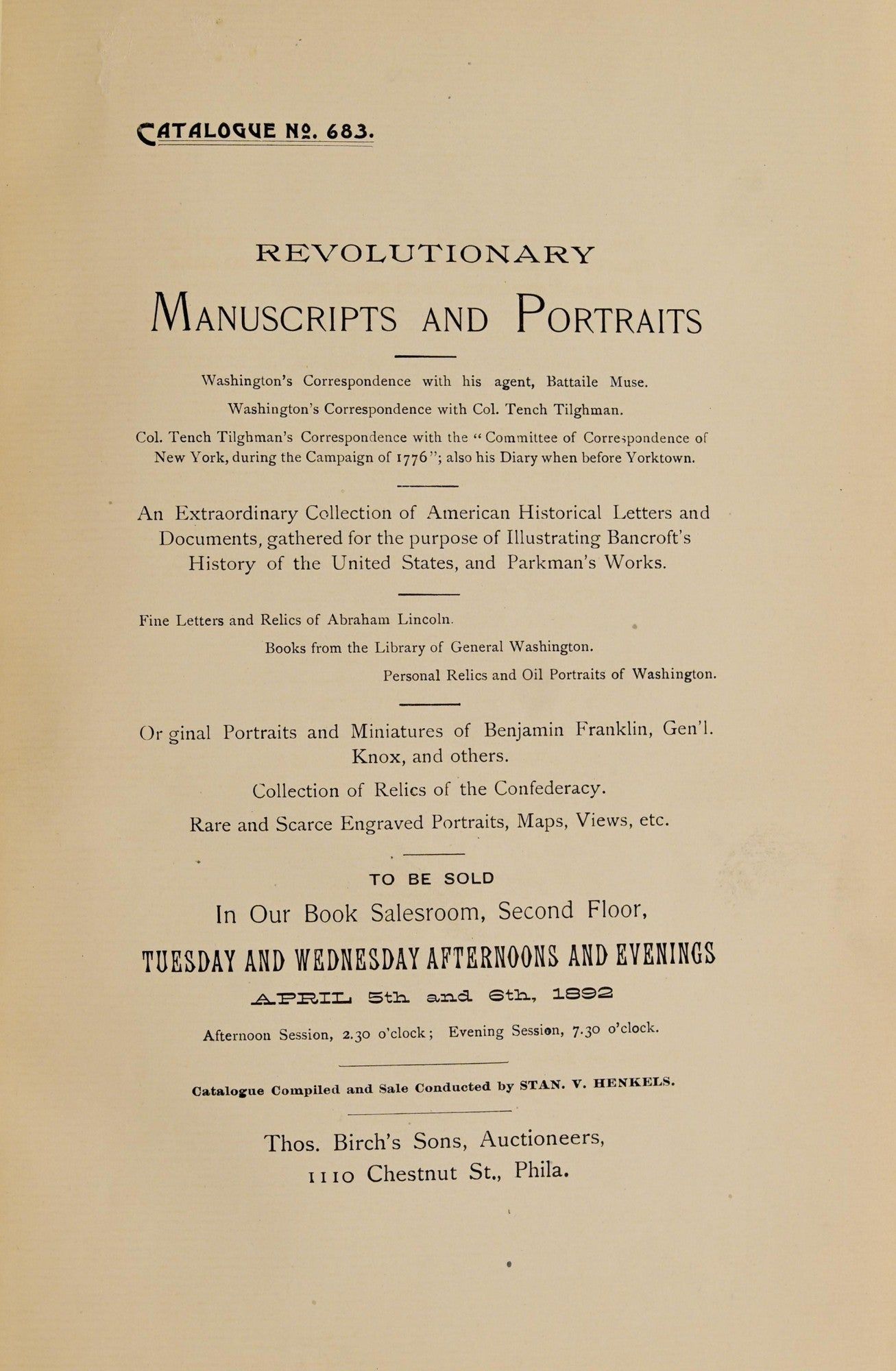 [AUCTION CATALOGUE] REVOLUTIONARY MANUSCRIPTS AND PORTRAITS. WASHINGTON’S CORRESPONDENCE WITH HIS AGENT, BATTAILE MUSE, WASHINGTON’S CORRESPONDENCE WITH COL. TENCH TILGHMAN; COL. TENCH TILGHMAN’S CORRESPONDENCE WITH THE “COMMITTEE OF CORRESPONDENCE OF NEW YORK, DURING THE CAMPAIGN OF 1774” ... TO BE SOLD ... TUESDAY AND WEDNESDAY AFTERNOONS AND EVENINGS APRIL 5th AND 6th, 1892..