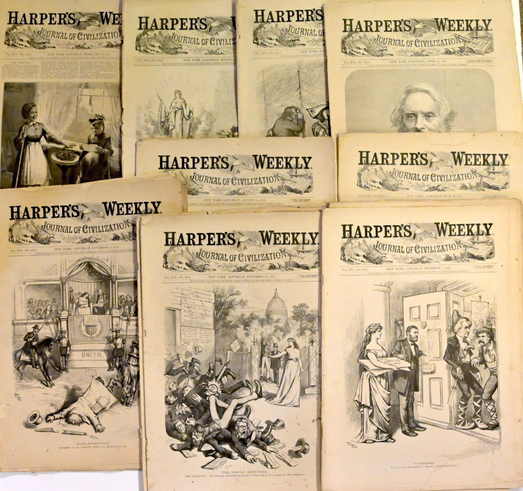 New York: Harper & Brothers, 1872. Thomas Nast. Harper's Weekly, A Journal of Civilization, the popular Republican political magazine known for its high-quality illustrations was published from 1857 to 1916 by Harper & Brothers in NYC. Eleven issues -- all from 1872 -- covering a wide range of political and social concerns of the day, such as the discovery of the lost explorer Dr. Livingstone and his famous encounter with Henry Morton Stanley, corruption in Tammany Hall in NYC, the presidential election of Ulysses S Grant, the equine flu, and the Great Boston Fire.~~Each issue contains serialized chapters of fiction from both well-known and anonymous writers. These include George Eliot’s Middlemarch, Mary Elizabeth Braddon’s “Colonel Benyon’s Entanglement”, and Wilkie Collins’ “Poor Miss Finch”. Five issues also contain supplemental issues offering further fiction and/or nonfiction reading. Three of these are from the 12-part series, London: A Pilgrimage, by Gustave Doer and Blanchard Jerrold. ~~Worn at edges and bindings to varying degrees. The July 13th and supplement to Nov. 30th are both uncut. Occasional tears to main body. Overall good. ~.