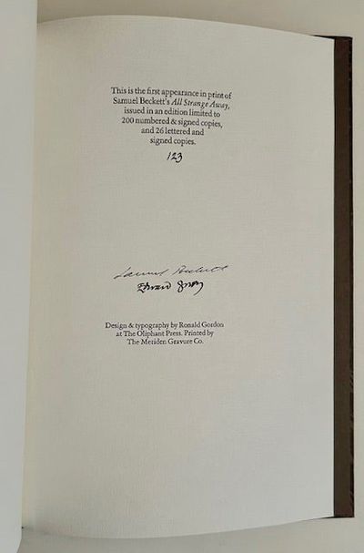New York: Gotham Book Mart, 1976. Decorative Boards. Fine. Edward Gorey. An all-but-immaculate copy of this 1976 Samuel Beckett/Edward Gorey signed/limited. #123 OF 200 COPIES SIGNED BY BOTH BECKETT AND GOREY at the limitation. Clean and Near Fine to Fine in its leather-backed pictorial chocolate boards. Thin quarto, wonderfully illustrated along the margins by the maestro Gorey. Also includes a very sharp, Near Fine example of the publisher's unprinted slipcase, with just a touch of light rubbing to the bottom-edges. The maiden title in the "Gotham Book Mart Master Series", edited by the legendary Andreas Brown, the owner of the Gotham Book Mart.