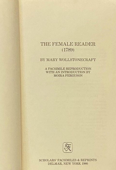 Delmar: Scholars' Facsimiles & Reprints, 1980. Hard Cover. Near Fine/No Jacket. 6x1x9. Edges lightly foxed, otherwise an excellent copy. 1980 Hard Cover. xxxiii, [1], [i]-xx, 394, [2] pp. 8vo. 1980 facsimile of the 1789 edition, with a new introduction by Moira Ferguson. An anthology of prose and verse "For the improvement of young women," by one of the thinkers foundational to feminism as we know it today. It includes selections from Voltaire, Shakespeare, Milton, Hume, Swift, etc., etc. This work preceded her groundbreaking work A Vindication of the Rights of Women, which argued that women were not naturally inferior to men. This was the culmination of a number of works, including The Female Reader, which focused on expressing the importance of education for women.
