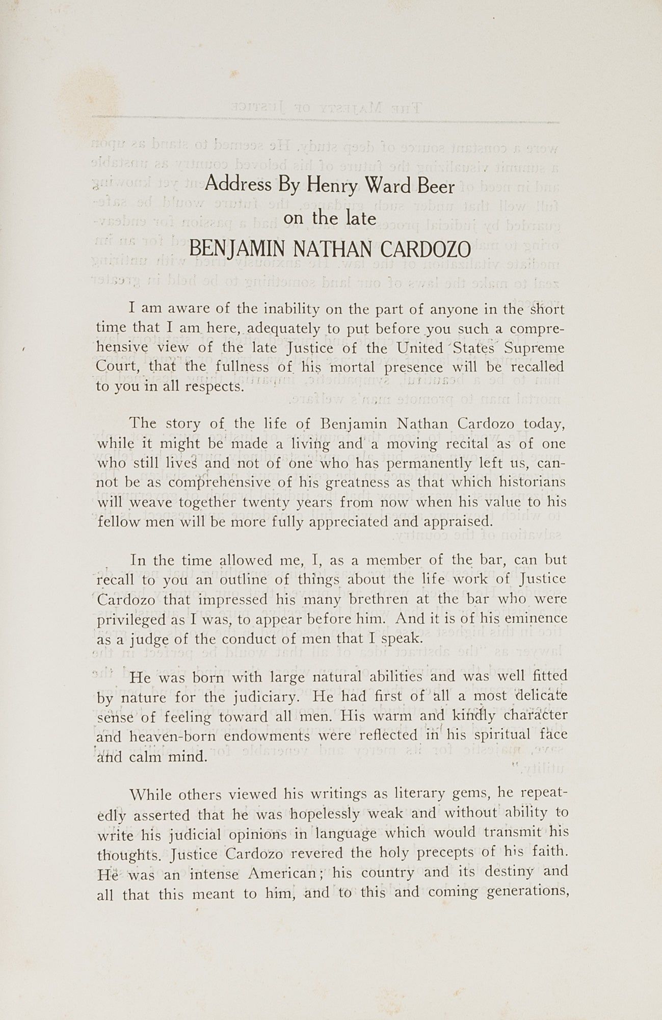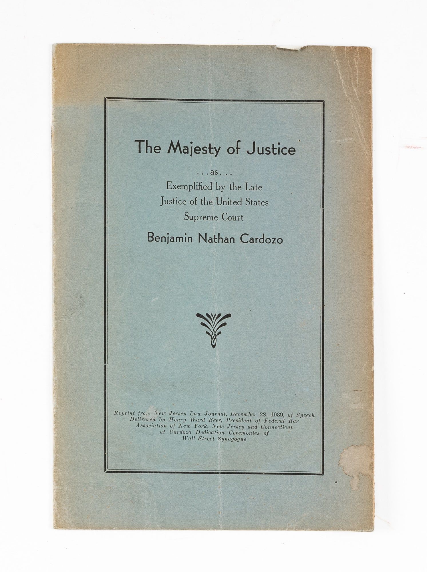 1939. [Beer, Henry Ward (1881-1970). The Majesty of Justice as Exemplified by the Late Justice of the United States Supreme Court Benjamin Nathan Cardozo (Cover title). Address by Henry Ward Beer on the Late Benjamin Nathan Cardozo. Reprint from New Jersey Law Journal, December 28, 1939. [5]. Light blue faded printed wrappers, center crease, light wear. $45. * The address is a commemoration and tribute to Justice Benjamin Nathan Cardozo, who died in 1938 after serving six years on the Supreme Court. Beer delivered the address at the Cardozo Dedication Ceremonies, which took place in 1939 at the Wall Street Synagogue. Henry Ward Beer was President of the Federal Bar Association of New York, New Jersey and Connecticut for more than two decades, and delivered this address in 1939 at the Cardozo Dedication Ceremonies at the Wall Street Synagogue. Beer was a graduate of Brooklyn Law School where he taught, served as an assistant United States Attorney before his appointment in 1919 as a special assistant attorney general. In the 1920's he served as a special attorney for the Federal Trade Commission. Later, he wrote The Federal Trade Law and Practice, and was recognized as an expert on Federal trade, trust and copyright law.