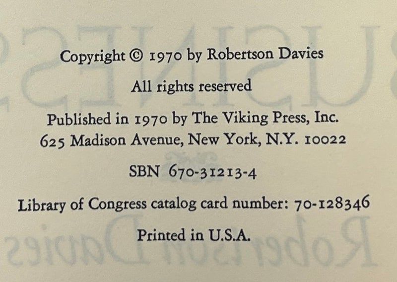 New York: Viking Press, 1970. First Edition. Hardcover. Very Good/Fine. Very Good in an about Fine jacket, unclipped ($6.95), lightly bumped at the edges, Doubleday price sticker on the back panel. Quarter brown cloth with yellow paper on the boards, some red splotches. Square and firmly bound with a soiled yellow topstain, clean internally. The first novel in Davies's acclaimed Deptford Trilogy.