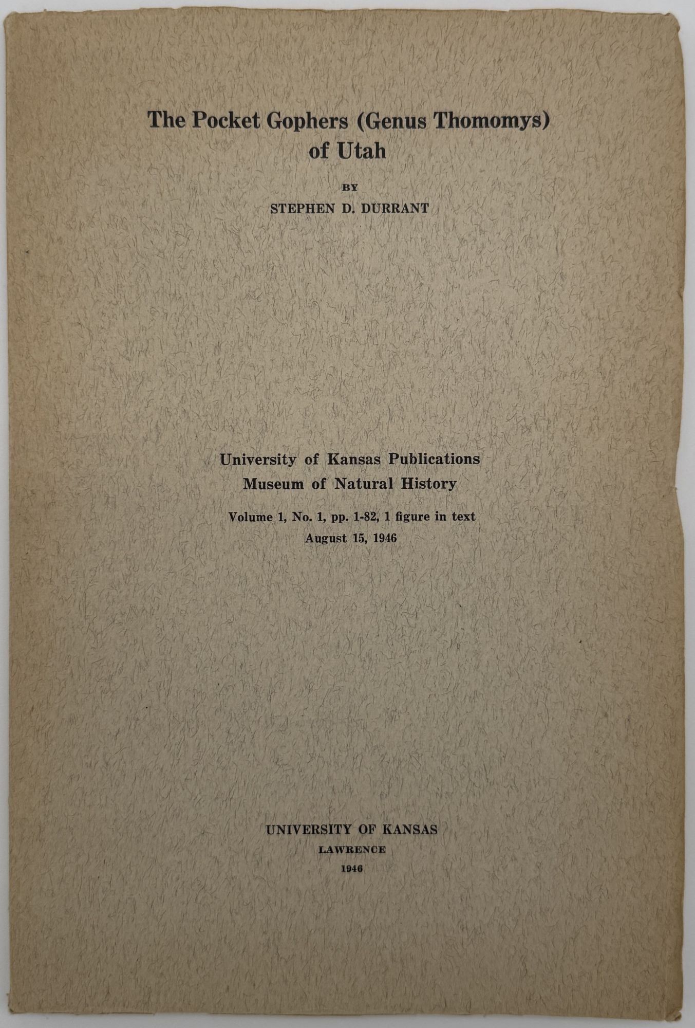 Lawrence, Kansas: University of Kansas, 1946. First edition. Paperback. Good. 82 pp. Octavo [23 cm]; Paper wraps over stapled textblock. Edges are rubbed and bumped, resulting in creased covers enveloping the textblock. Rear cover exhibits two larger creases towards out edge. Cover and textblock are sunned towards the outer edges, the text block less so. All text remains clear and bright. Volume 1, No. 1, pp. 1-82, 1 figure in text. Published by the University of Kansas Museum of Natural History, August 15, 1946. An interesting case study of the Thomomys species, with extensive bibliographical sources, experiements and diagnoses, and a page of adult male and adult female measurements.