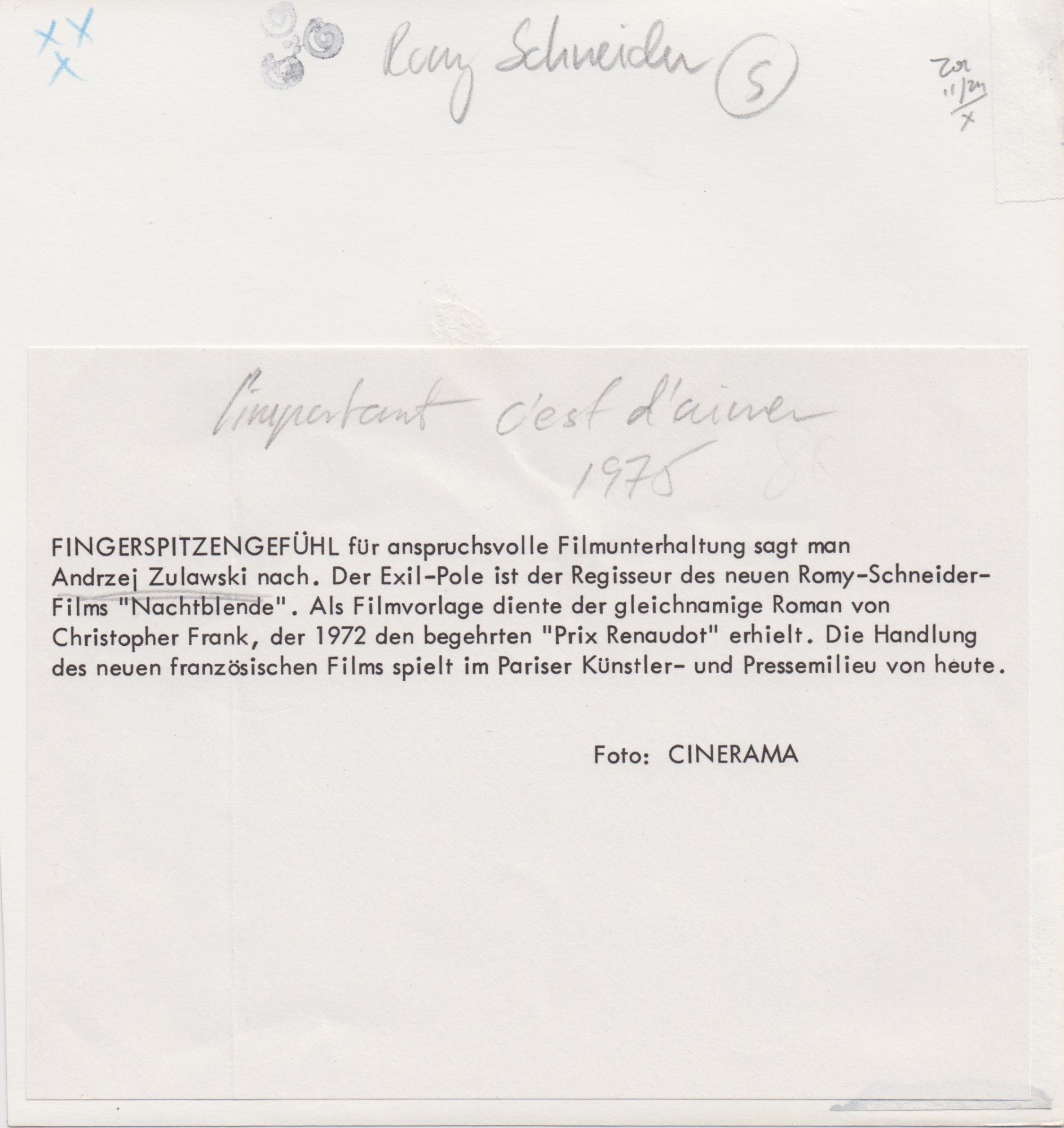 New York: Cinerama, 1975. Vintage borderless reference photograph from the 1975 film, showing director Andrzej Zulawski and actress Romy Schneider on the set. Printed mimeo snipe in German on the verso.