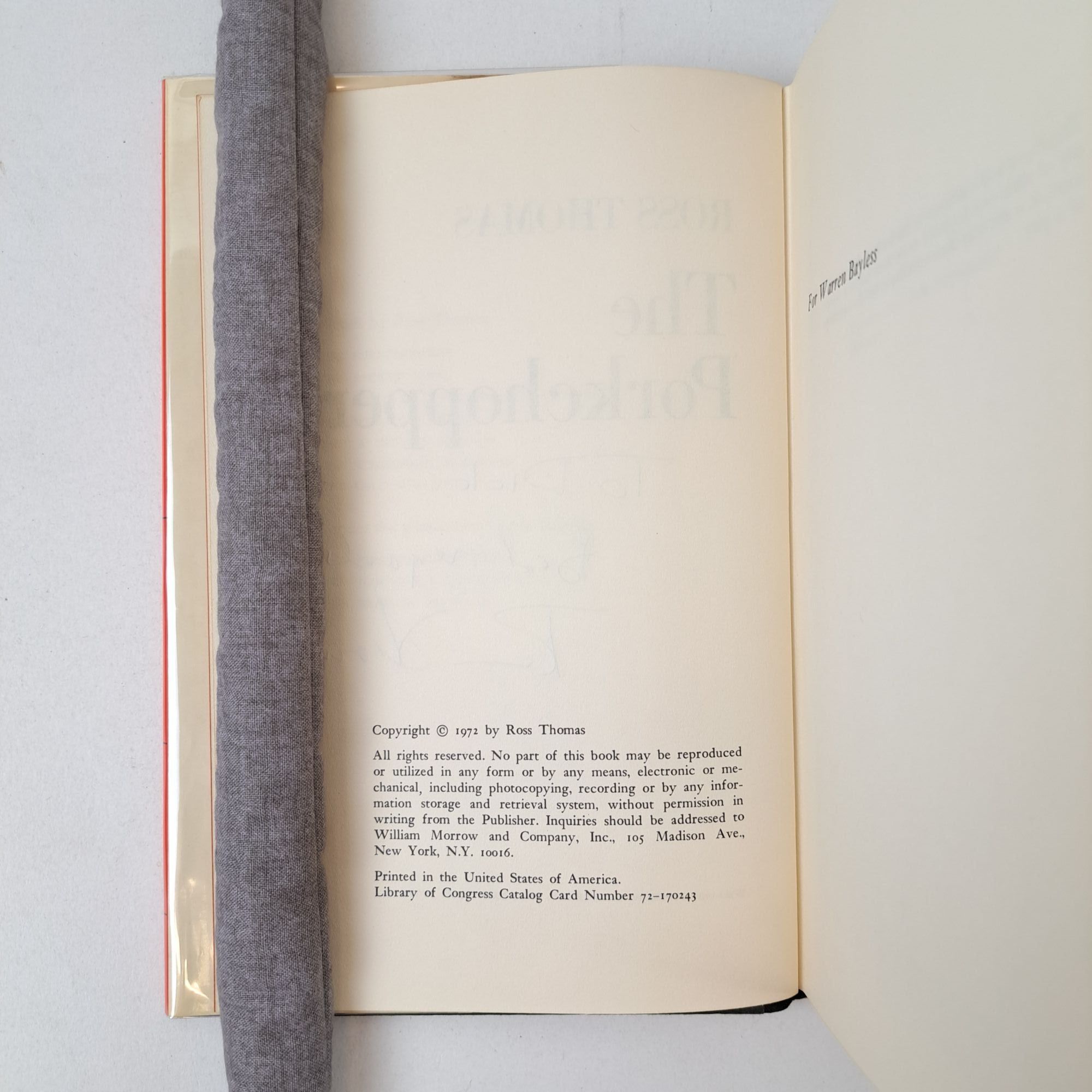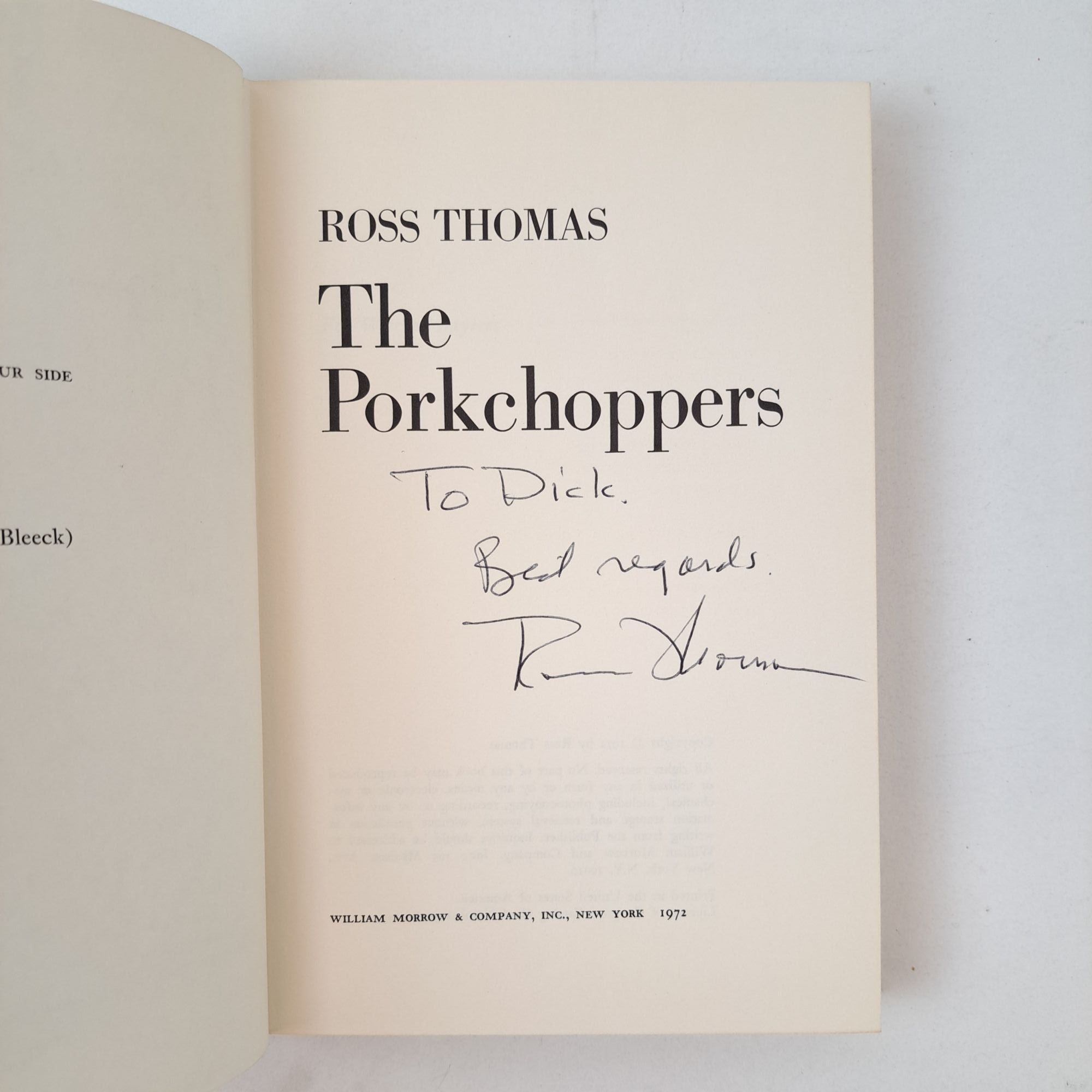New York, New York: William Morrow & Company, Inc, 1972. First Edition. Hardcover. Octavo, 246 pages. In Very Good minus condition with Very Good minus condition dust jacket. Spine is red with white lettering. Dust jacket protected by mylar covering, price uncut: "$6.95" on front flap, has mild age-toning along rear cover and flaps, mild shelving wear along extremities and faint liquid staining along spine tail and front tail joint. Boards have mild shelving wear along extremities, mild general sun-fading along covers, and moderate denting along spine tail; spine moderately cocked. Textblock edges have mild age-toning and light smudging along head and fore edges. Inscribed "To Dick, best regards" by Ross Thomas on title page. Shelved Room C. 1397733. Special Collections.