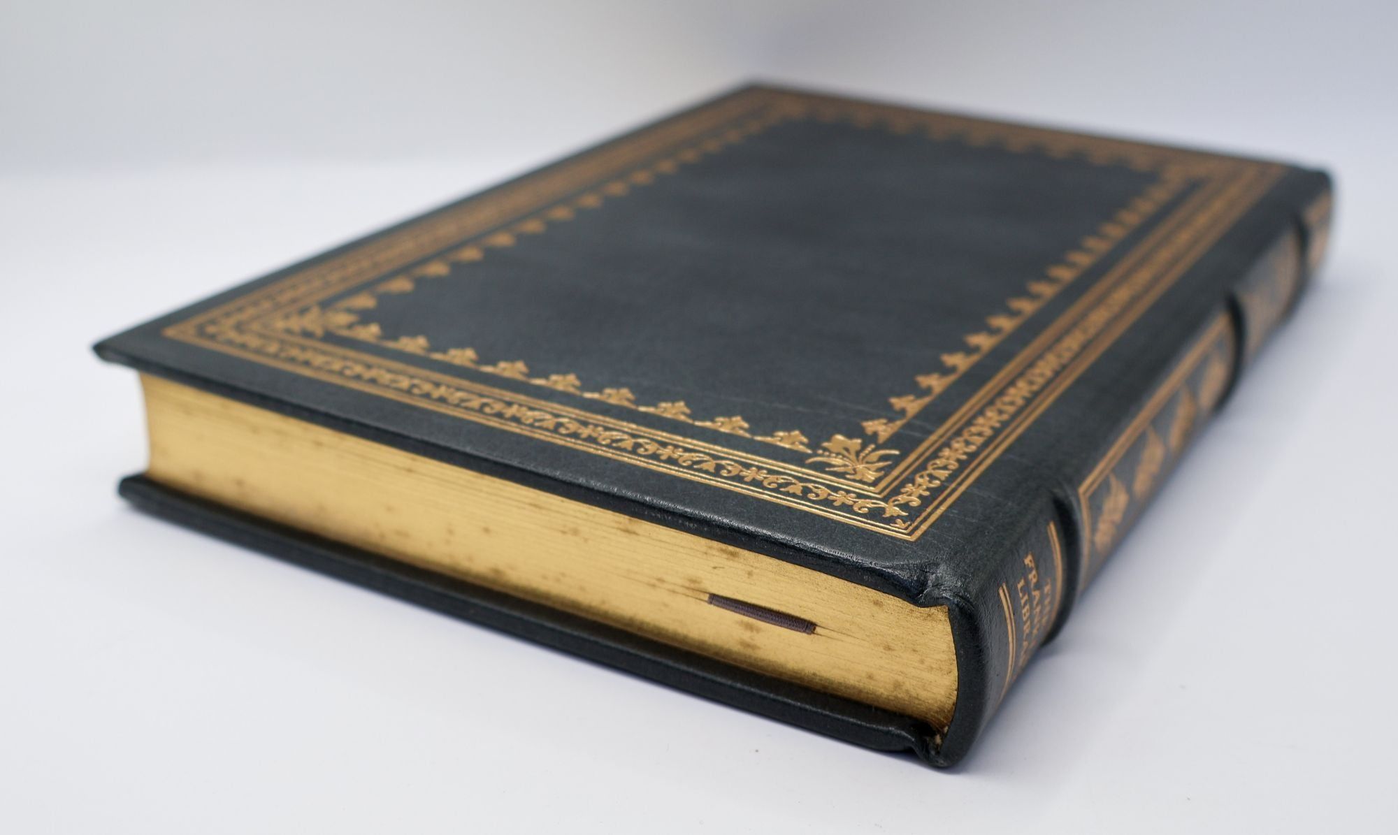 Bound in full gray leather with gilt lettering and decoration to spine; all edges gilt; moire silk endpapers; satin ribbon bookmark. Mild shelf wear, including foxing to text block; interior pages clean.