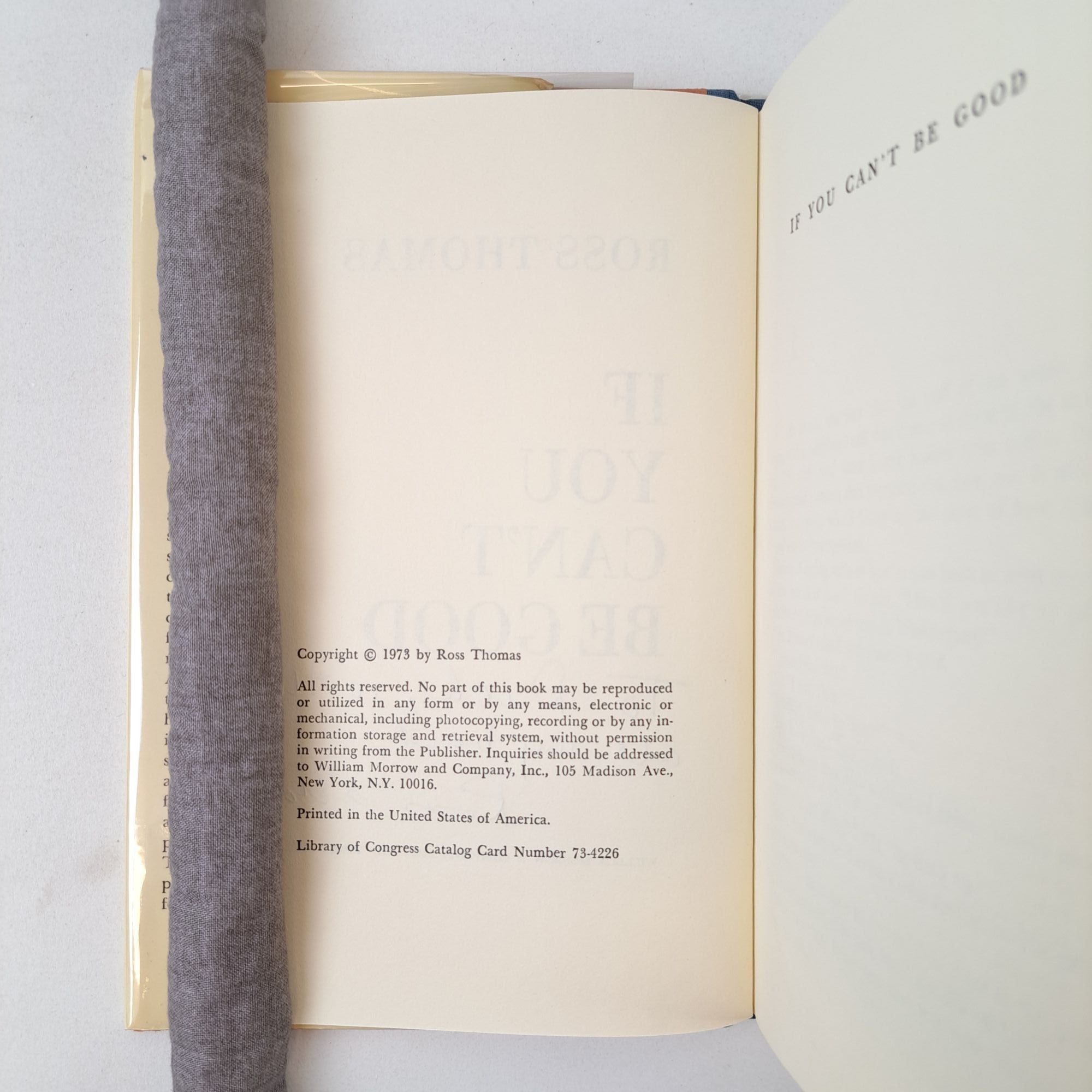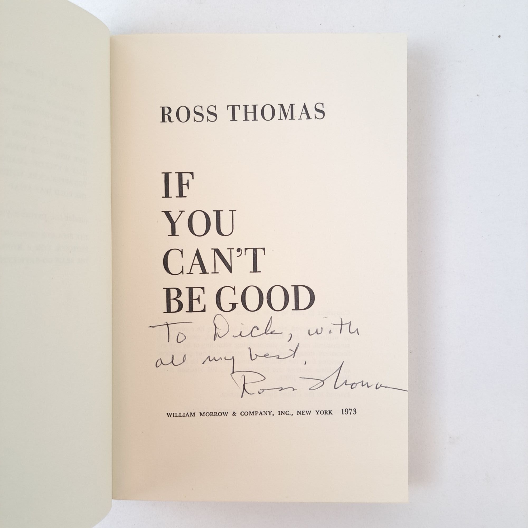 New York, New York: William Morrow & Company, Inc, 1973. First Edition. Hardcover. Octavo, 249 pages. In Very Good minus condition with Very Good minus condition dust jacket. Spine is cream with black and blue lettering. Dust jacket protected by mylar covering, price uncut: "$6.95" on front flap, has mild general soiling and scuffing, mild sun-fading along spine. Boards have mild shelving wear and discoloration along extremities; spine moderately cocked. Text block edges have mild smudging, dark grey smudge along tail edge. Inscribed "To Dick, with all my best," by Ross Thomas. Shelved Room C. 1397767. Special Collections.