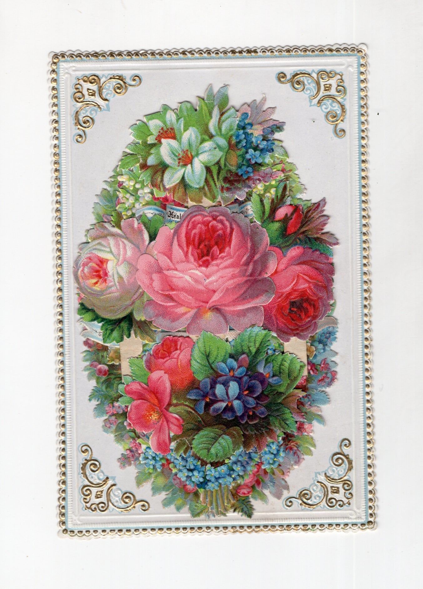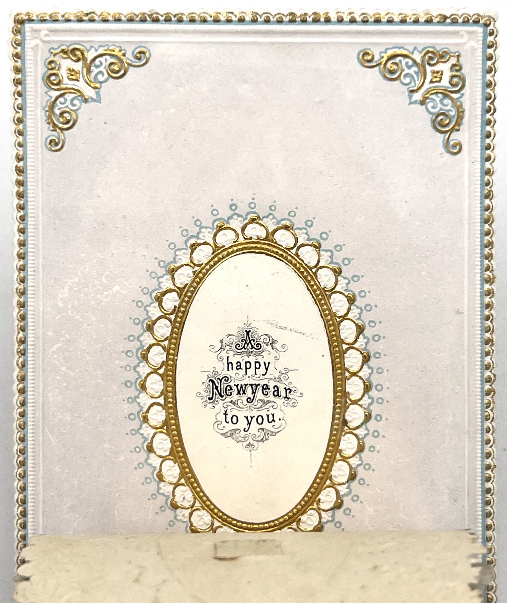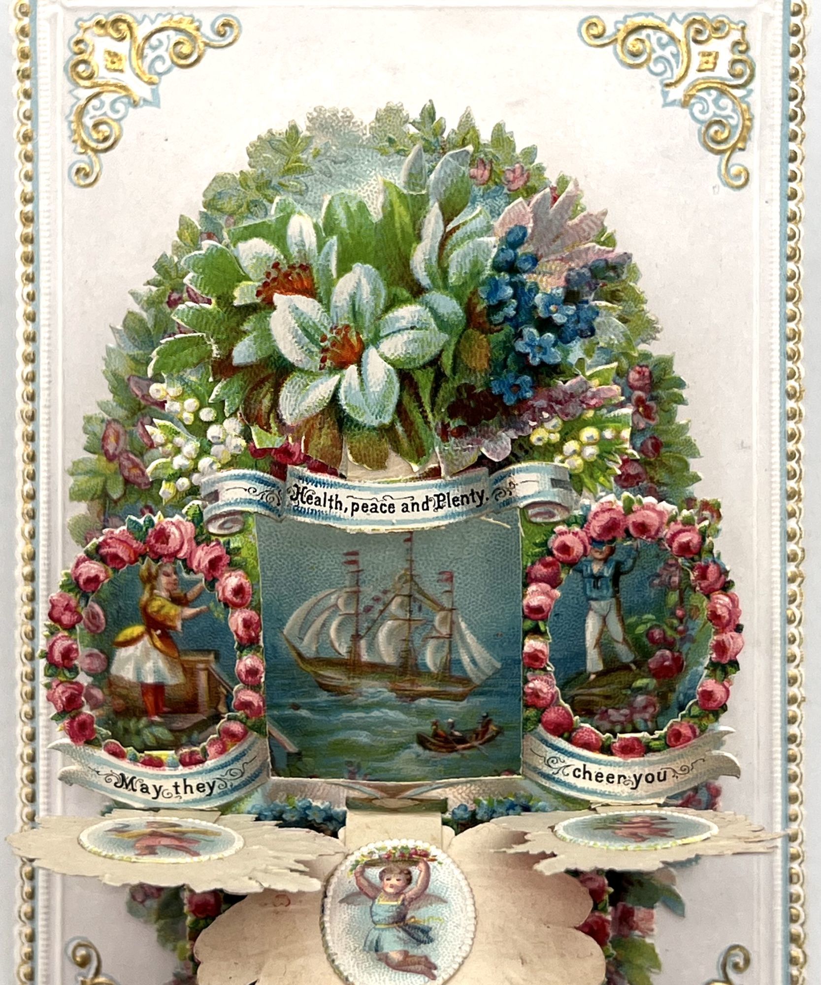 England, 1880. Very good to near-fine. Staining on back, a couple nicks.. A very visually attractive card made from layered Victorian scrap and paper tabs. When the bottom scrap is lifted, it reveals a wintry scene with two praying children and an angel. When the same scrap is pulled vertically downwards instead of up, tabs pull the other scraps to reveal a ship flanked by a woman seeing off her sailor lover. Beneath this scrap is yet another greeting: "A Happy New Year to You". Measures approx. 5" by 3.25