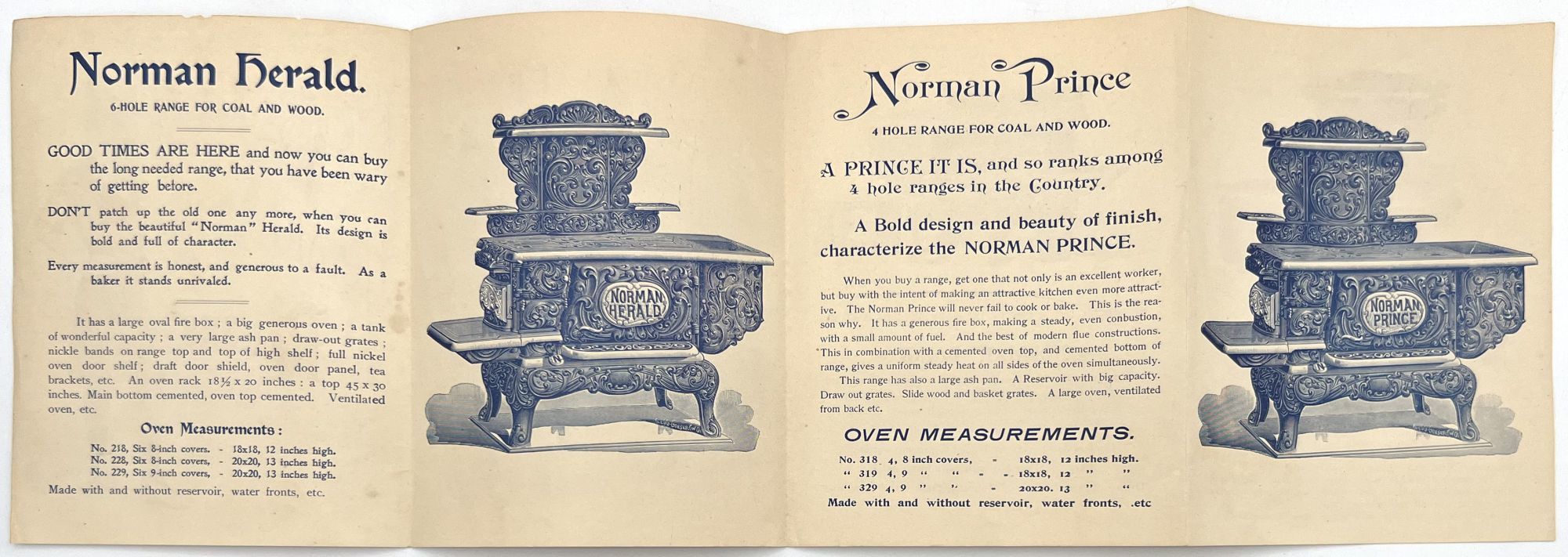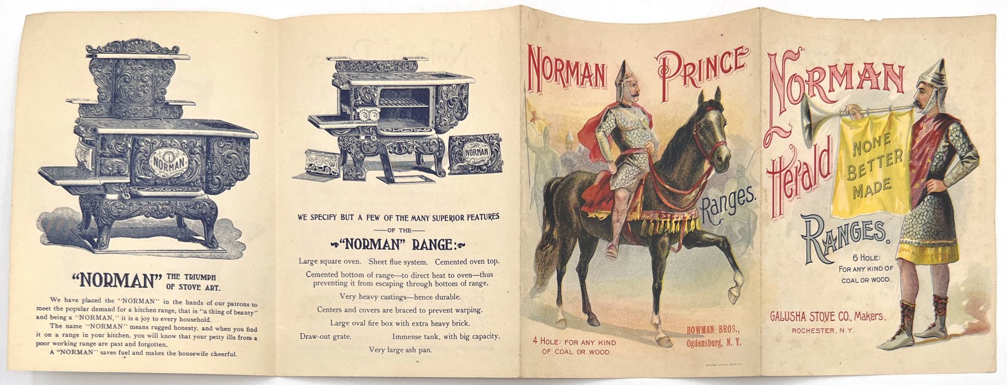 Rochester, New York: Galusha Stove Co, 1890. Very good. Toned, a couple short tears.. None Better Made": an illustrated advertising pamphlet for Norman Herald Ranges, featuring an image of a trumpeting Norman on the front. Markets the ovens and stoves to upper-middle class families, offering measurements, illustrations, and descriptions of the products' durability and large capacity. Folding pamphlet measures approx. 6" by 4.5" folded, and 6" by 18" unfolded.