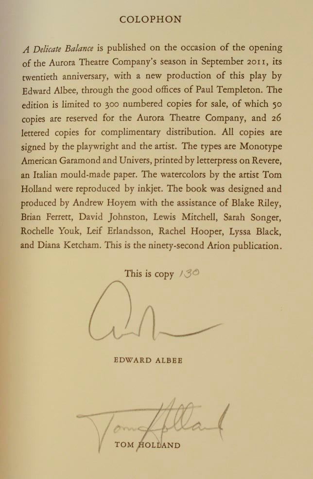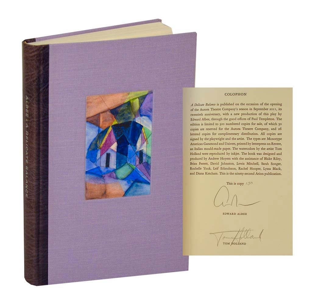 San Francisco, CA: Arion Press, 2011. Limited edition. Hardcover. 169 pages. Number 130 of 300 copies with the types Monotype American Garamond and Univers printed letterpress on Revere, an Italian mould-made paper. The ninety second publication of the Arion Press. Features an introduction by David Littlejohn and color illustrations by Tom Holland. A fine copy in cloth boards with purple goatskin spine. No dust jacket as issued. Signed by both Albee and Holland on the colophon page. An attractive edition of this Pulitzer Prize winning play by Albee.