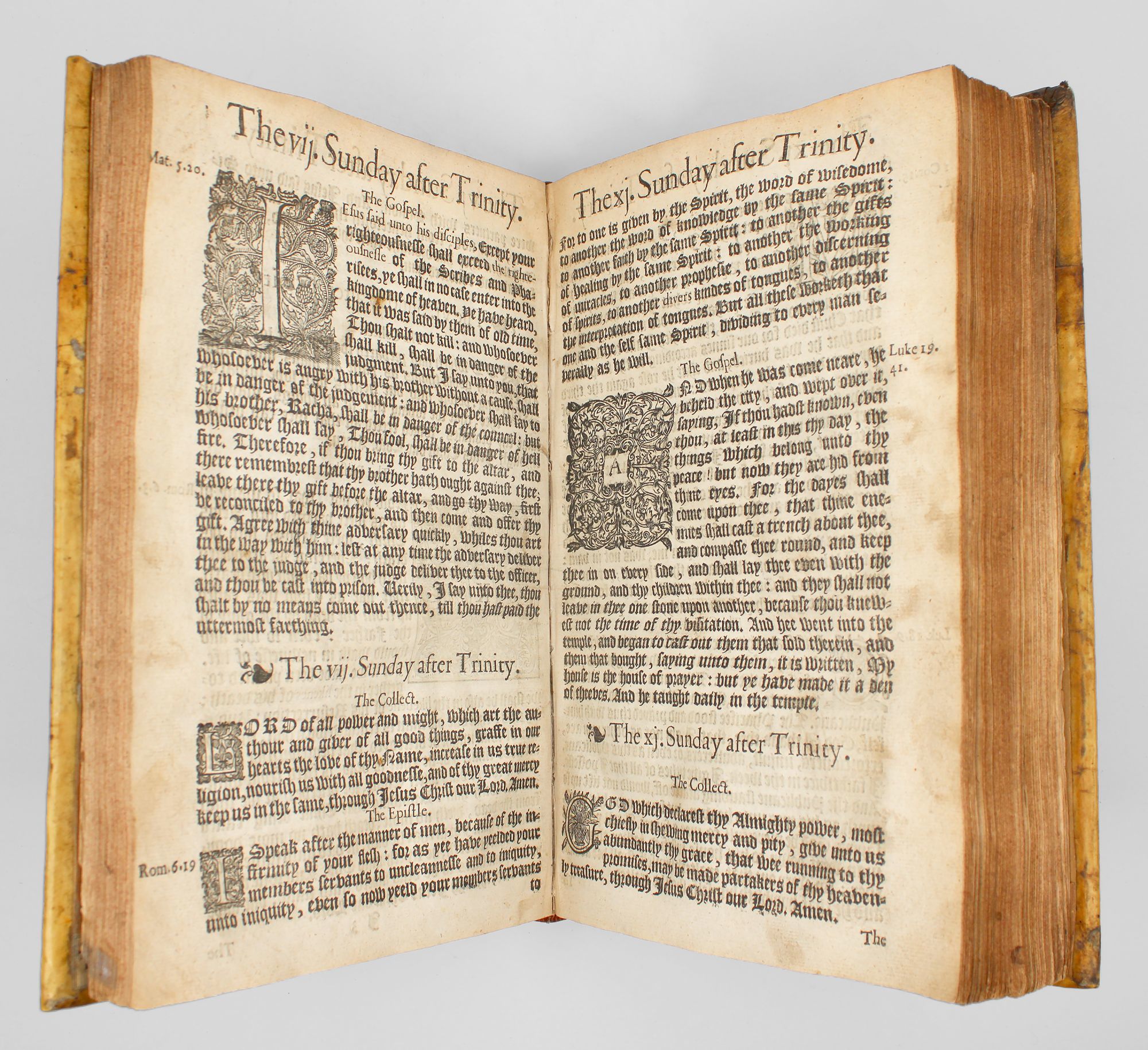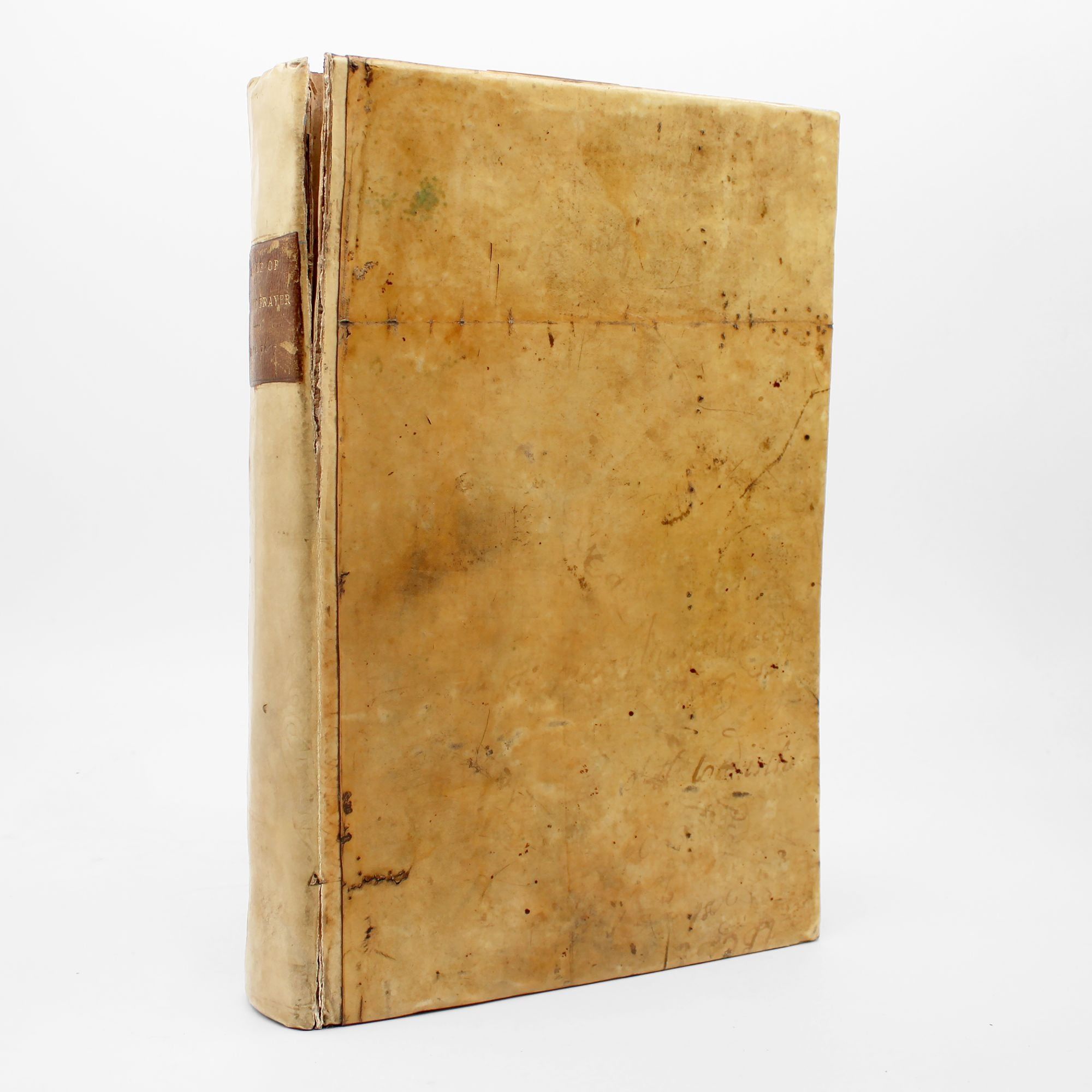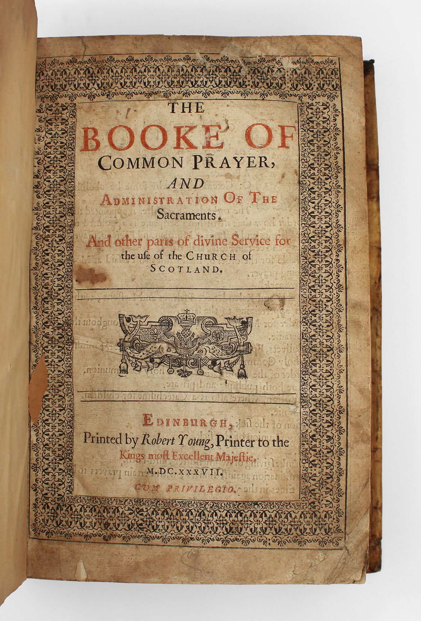 Edinburgh: Robert Young, 1637. First edition. Title page within ornamental border, title page and calendar printed in red and black; ornamental initials. Psalter with musical notation. Pp. [446 of 456]; [2], 147, [1]. Leaf hh3 in setting 3. Lacking E3 (duplicate of D3 present), I4-5 excised, O1 excised, lacking O4-5. 1 vols. 4to. Old vellum, rebacked. Bookseller's ticket of Thomas Baker, London. Front joint split at top; old paper repairs; blank verso of last leaf of Psalms with juvenile pen starts. First edition. Title page within ornamental border, title page and calendar printed in red and black; ornamental initials. Psalter with musical notation. Pp. [446 of 456]; [2], 147, [1]. Leaf hh3 in setting 3. Lacking E3 (duplicate of D3 present), I4-5 excised, O1 excised, lacking O4-5. 1 vols. 4to. First edition of Archbishop Laud's version of the Book of Common Prayer for Scottish churches, the imposition of which provoked Scotland into open rebellion against Charles I, leading to the drawing up of the National Covenant and feeding into the British Civil Wars. The book became know as Laud’s Liturgy. This copy lacking as usual “Certain Godlie Prayers” (two leaves), for these were rigidly suppressed; bound with a copy of The Psalmes of King David: translated by King James (London: Thomas Harper, 1636). ESTC: S101893; Griffiths 1637.9; see Donaldson, The Making of the Scottish Prayer Book (1954). General Theological Seminary (bookplates