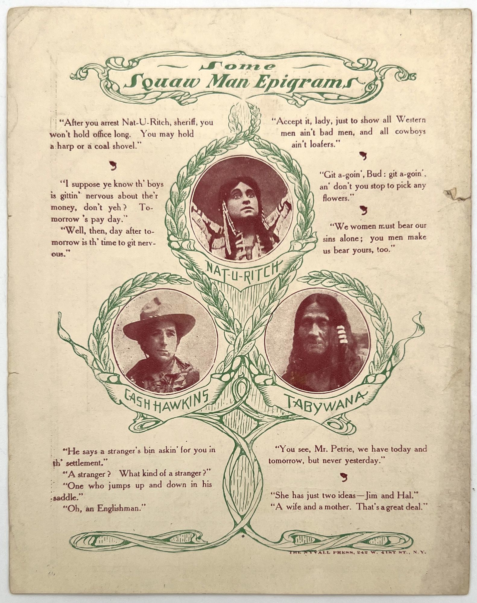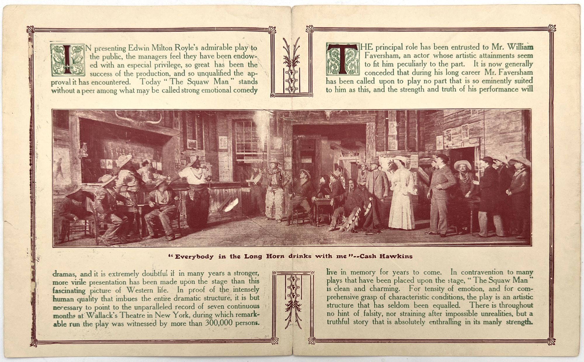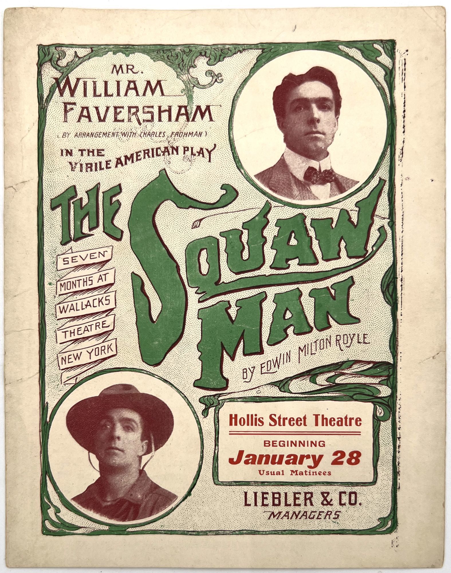 [Boston, Massachusetts]: Hollis Street Theatre, 1906. Promotional pamphlet for the Boston run of "The Squaw Man", a 1905 Western stage play written by Edwin Milton Royle and starring William Faversham in the starring role. The basic premise follows an English Captain who buys a ranch in the American Old West, and falls in love with the daughter of a Native American leader. The marriage causes social strife, and ultimately leads to her death. He returns to England with his child and marries a British woman. The story was tremendously popular with the American public, and led to numerous adaptations (a book, a musical, and several Cecil B. DeMille films). The present pamphlet markets the play several months after it premiered in New York, as a "Virile American Play" and a "strong emotional comedy drama". Includes a brief pitch, and a photograph of the cast in costume during one of the scenes. The back of the pamphlet features quotes from some of the characters. Illus. bifolium printed in green and red (7" by 5.5").