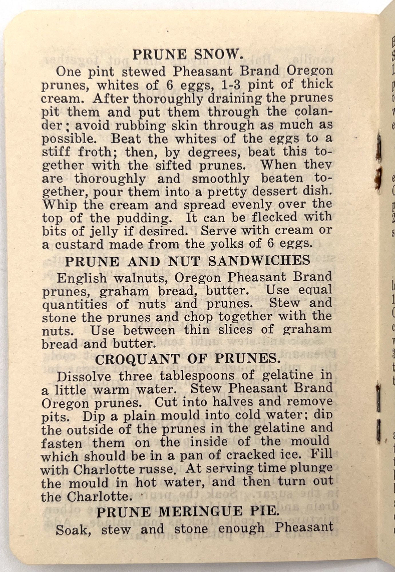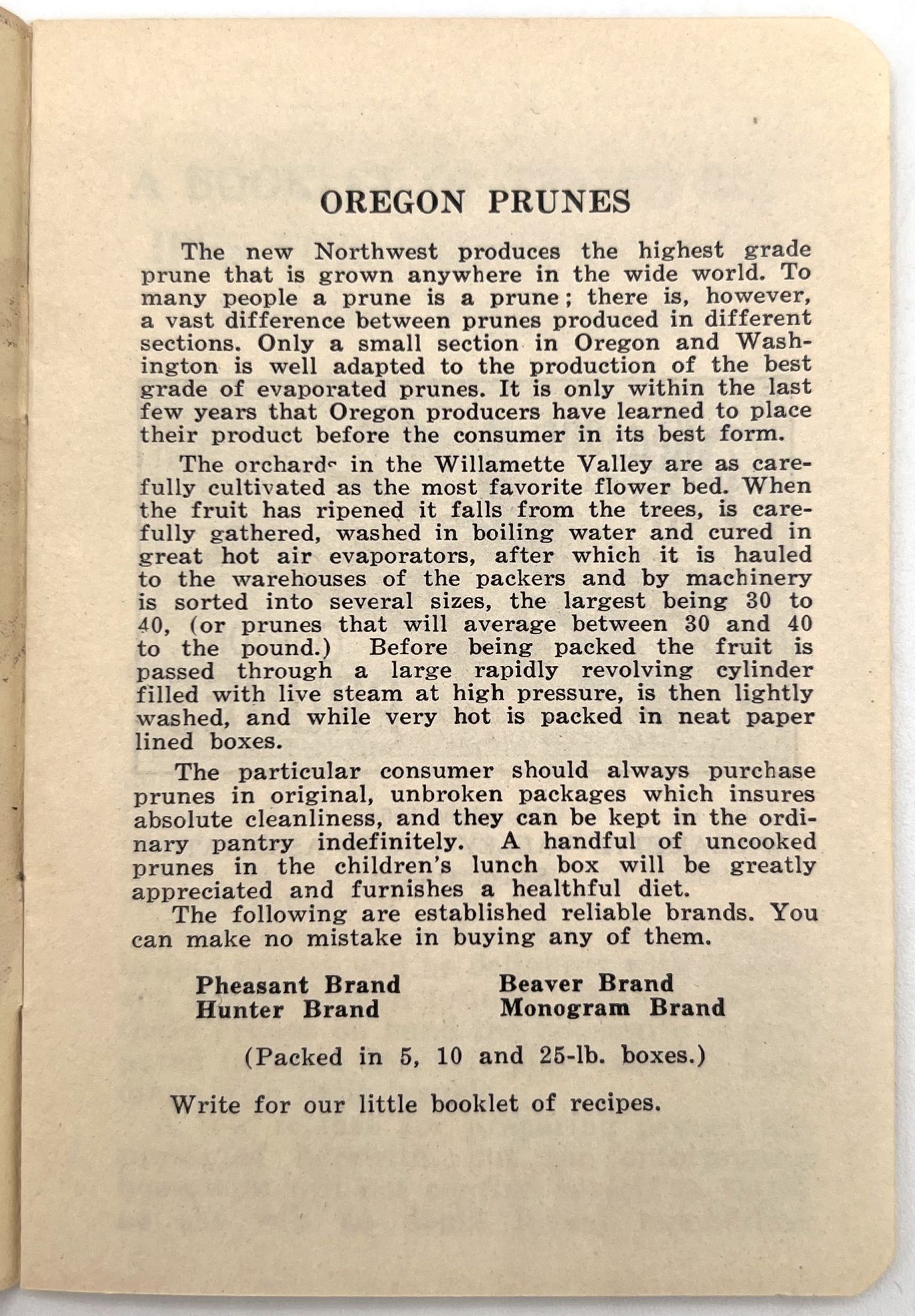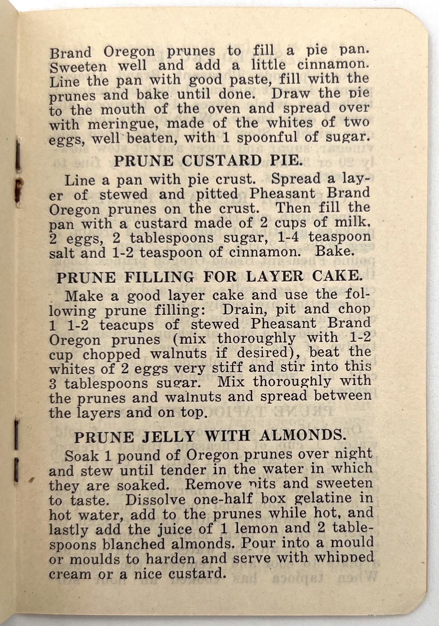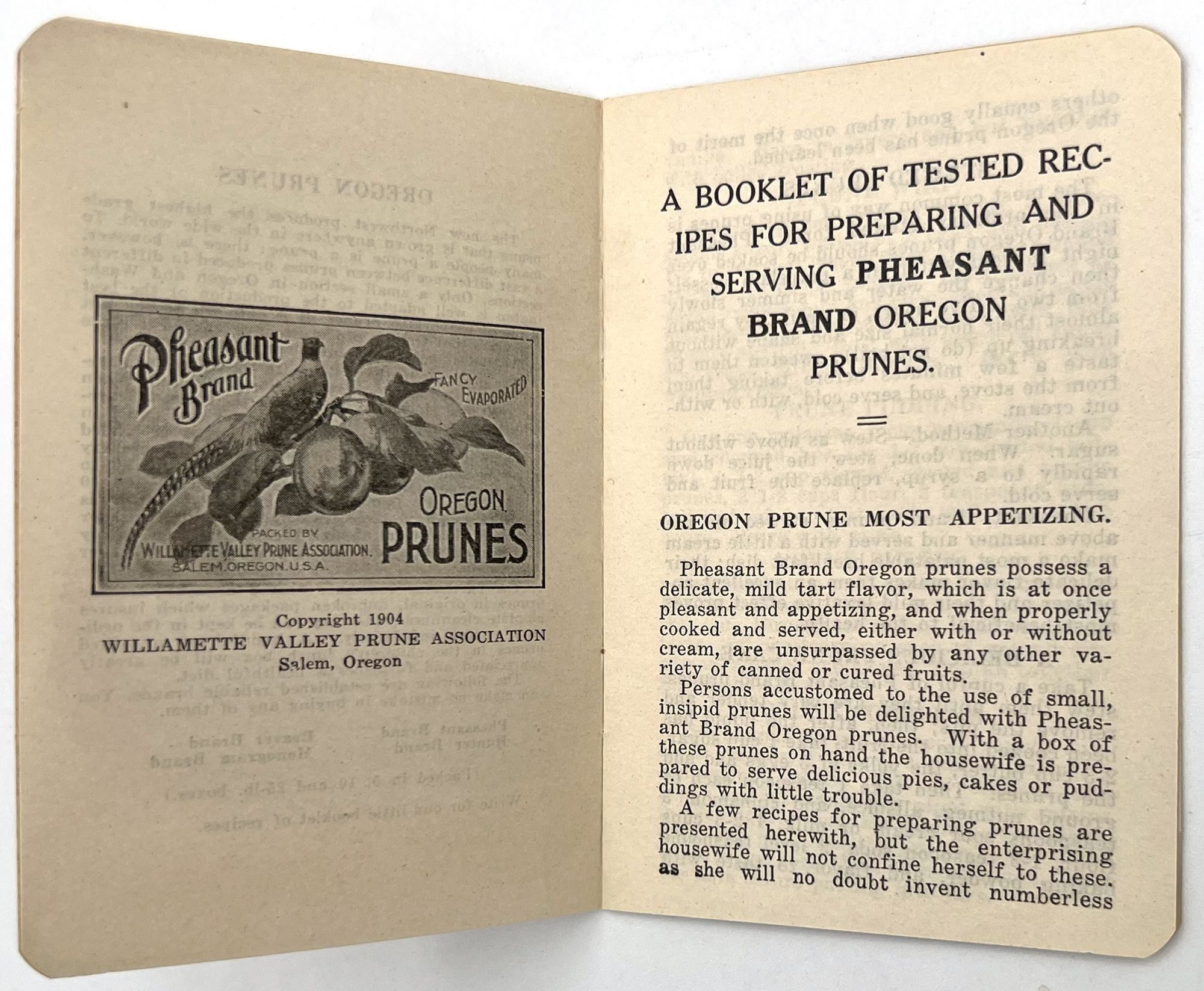 Salem, Oregon: Willamette Valley Prune Association, 1909. Very good to near-fine. Minor rust staining from staples.. An attractively designed booklet of recipes using Oregon prunes, promoting the fruit as an essential part of a nutritious diet for the whole family: "A handful of uncooked prunes in the children's lunch box will be greatly appreciated and furnishes a healthful diet". Contains over twenty recipes, ranging from Prune Pudding to Prune Short Cake, with some Loganberry recipes as well. Single vol. (4.75" by 3.25"), pp. [12], stapled in original illus. wrps with image of plums on branch.