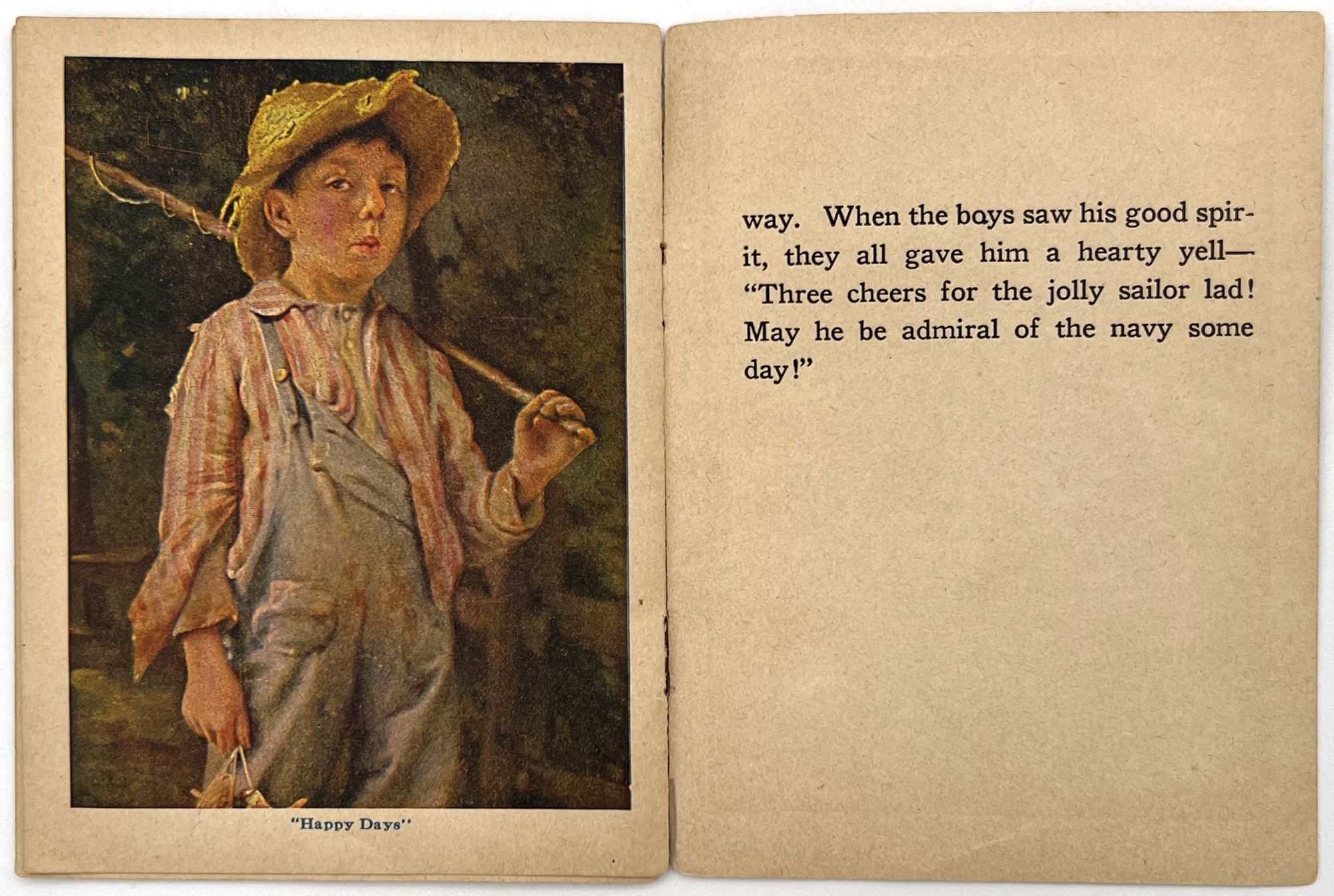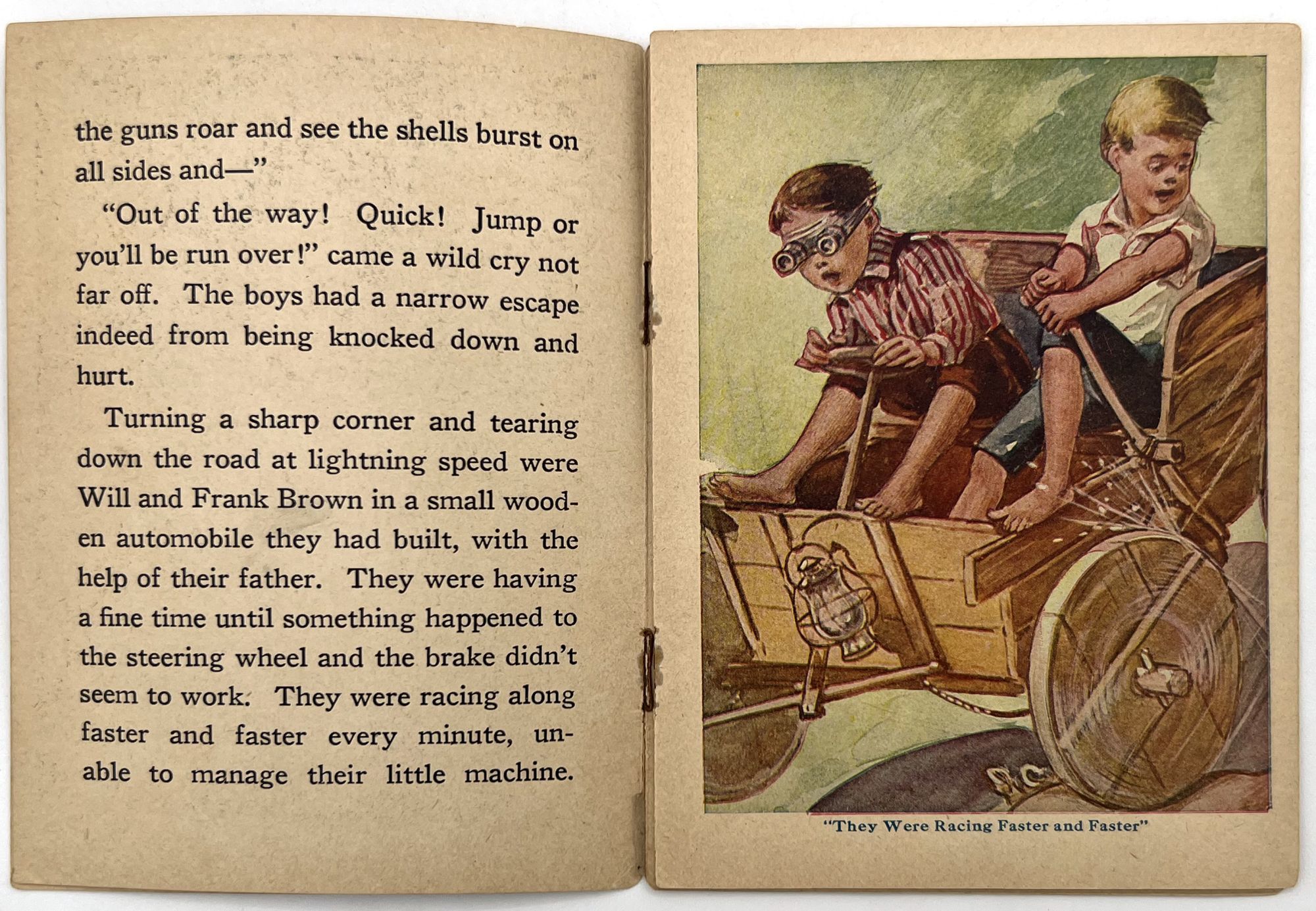 Chicago, Illinois: American Colortype Co, 1920. Fair. Toning, short tears, rust staining from staples, leaves loose as a result. Modern tape repairs.. A color-illustrated booklet for children telling a meandering story of "boys being boys": playing soldier, racing homemade automobiles, and fishing. Makes a point of showing the boys as aspiring to be in the military when they grow up. Provides a good example of how gender roles permeated most aspects of life at this time, including (especially?) while children are at play. Single vol. (5.25" by 4"), pp. [12], illus., in original illus. self wrps depicting boy laying on grass.