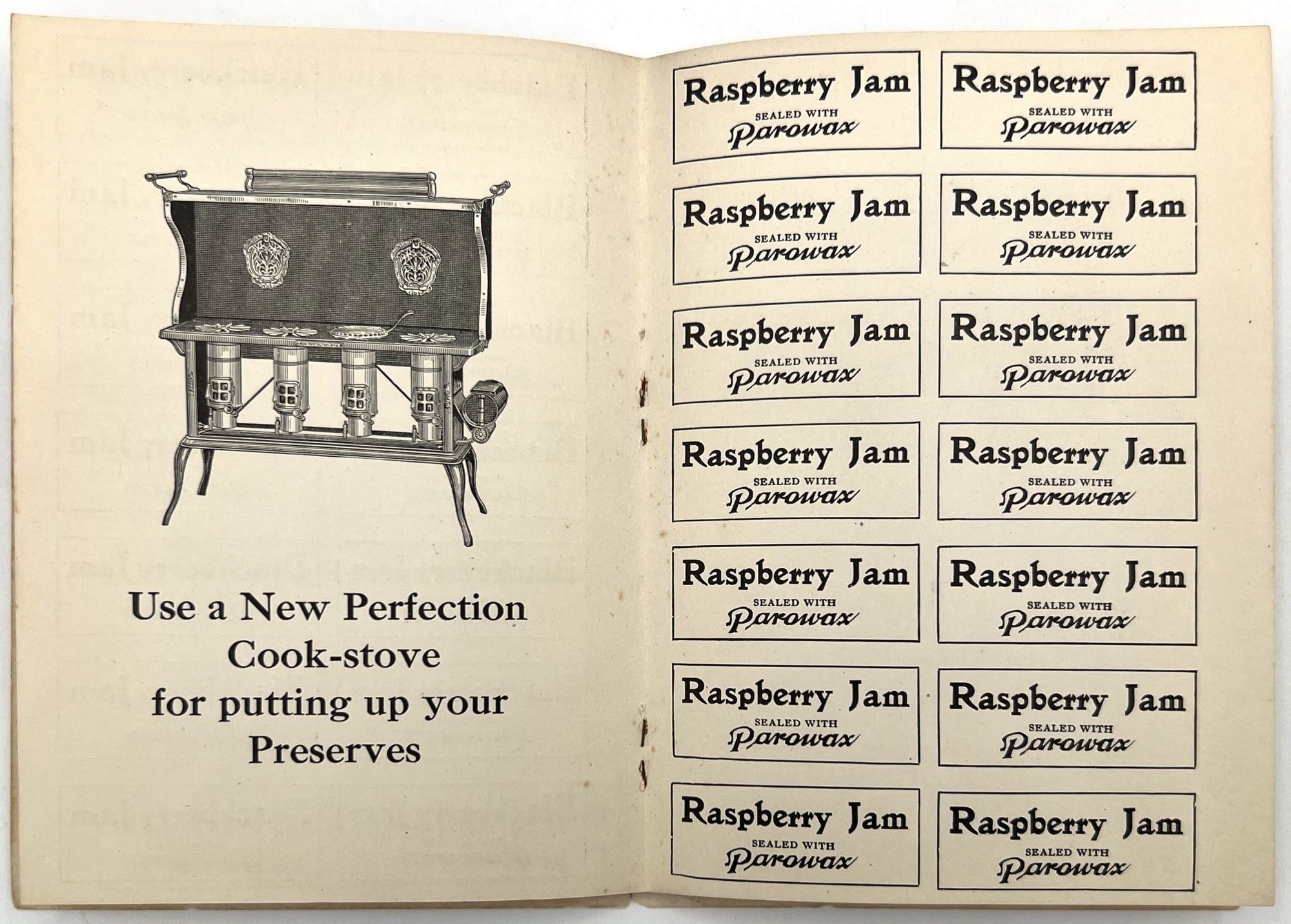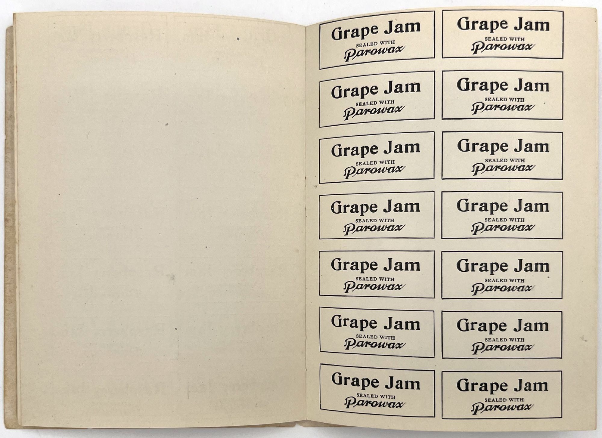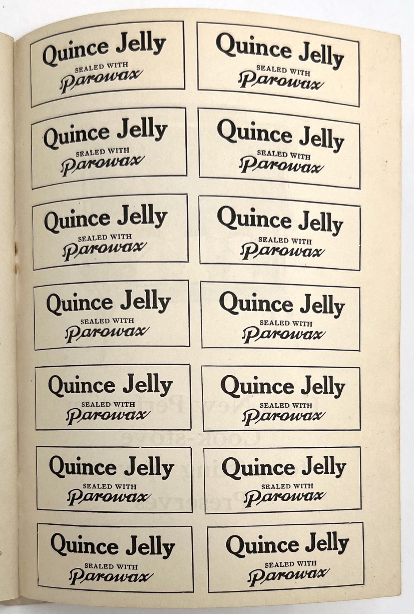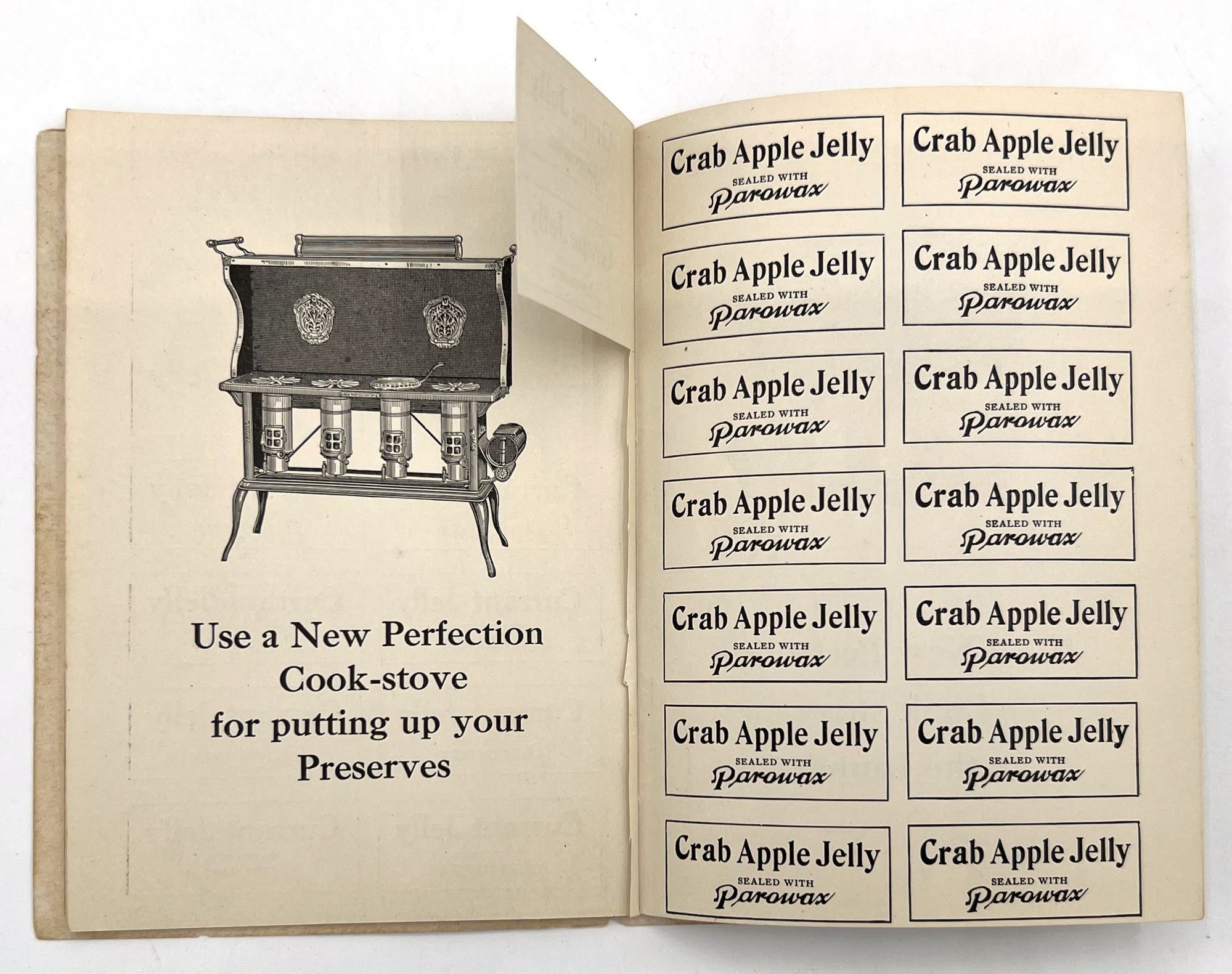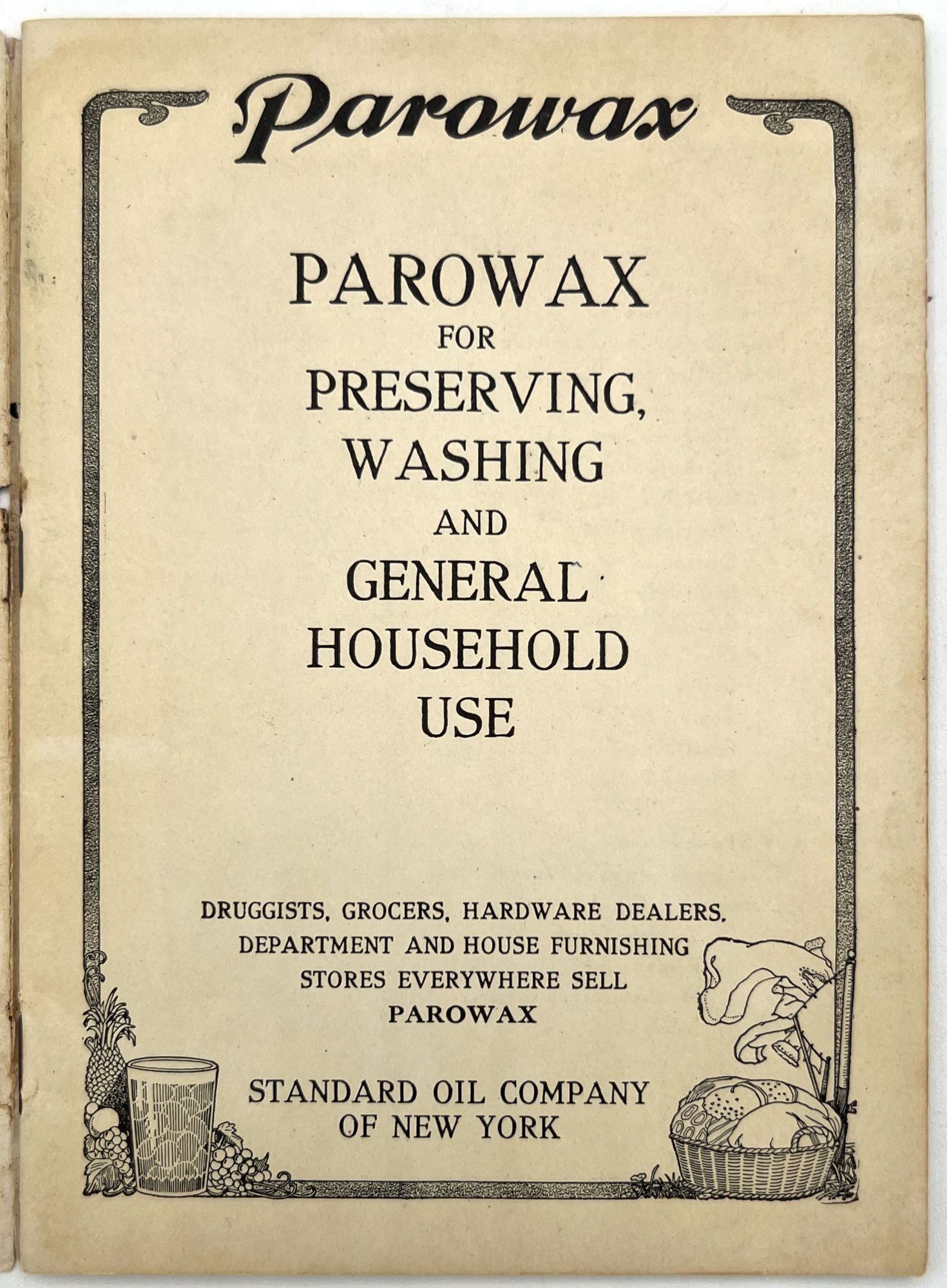 New York, New York: Standard Oil Company of New York, 1915. Fair. Text block loose, short tears, light spotting, about a dozen labels cut out and lacking.. Promotional booklet for Parowax, a brand of "clean and wholesome" paraffin wax sold to homemakers for sealing jam and jelly jars. Marketed as a multi-use product, with additional uses in "washing and general household use". Includes recipes for different jams and jellies, as well as several pages of printed labels to cut out and use on the jars. Single vol. (6" by 4.5"), pp. 14, [18], in original illus. wrps with image of beautiful young housewife using the wax to preserve jams.