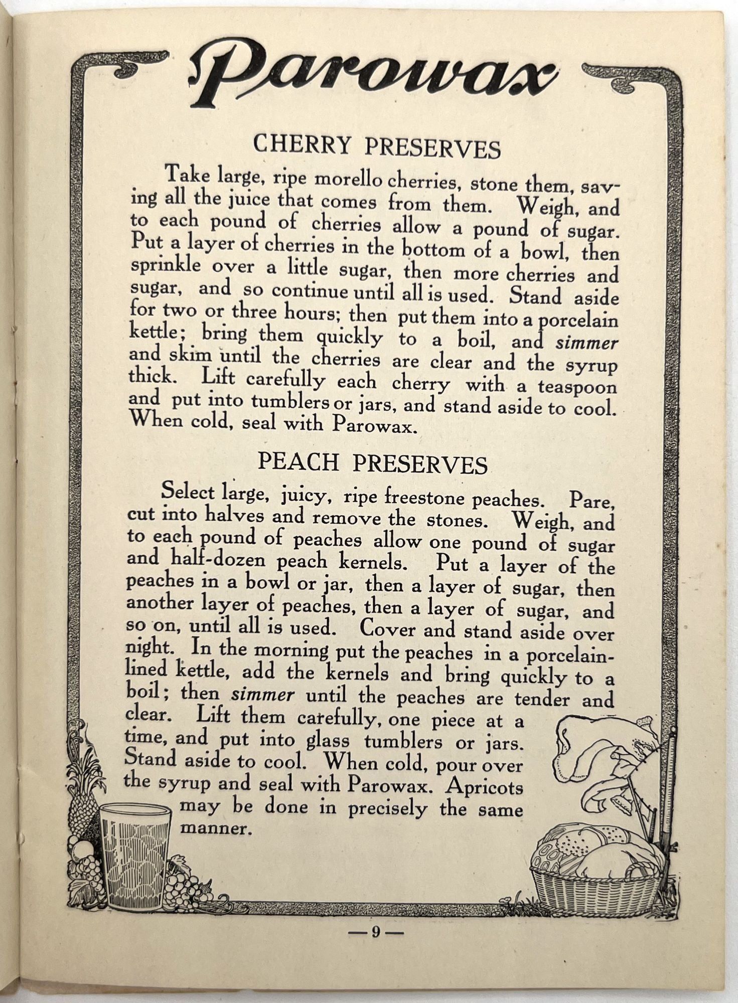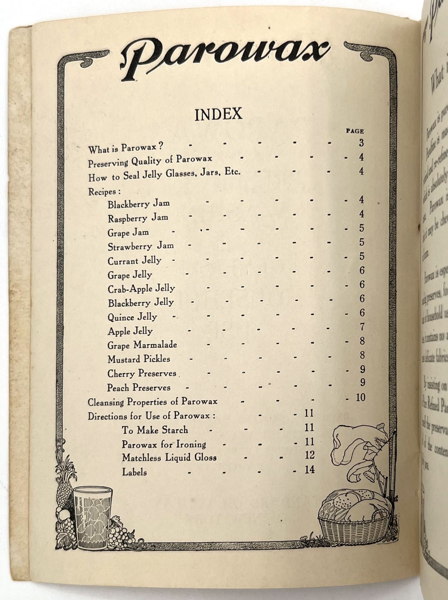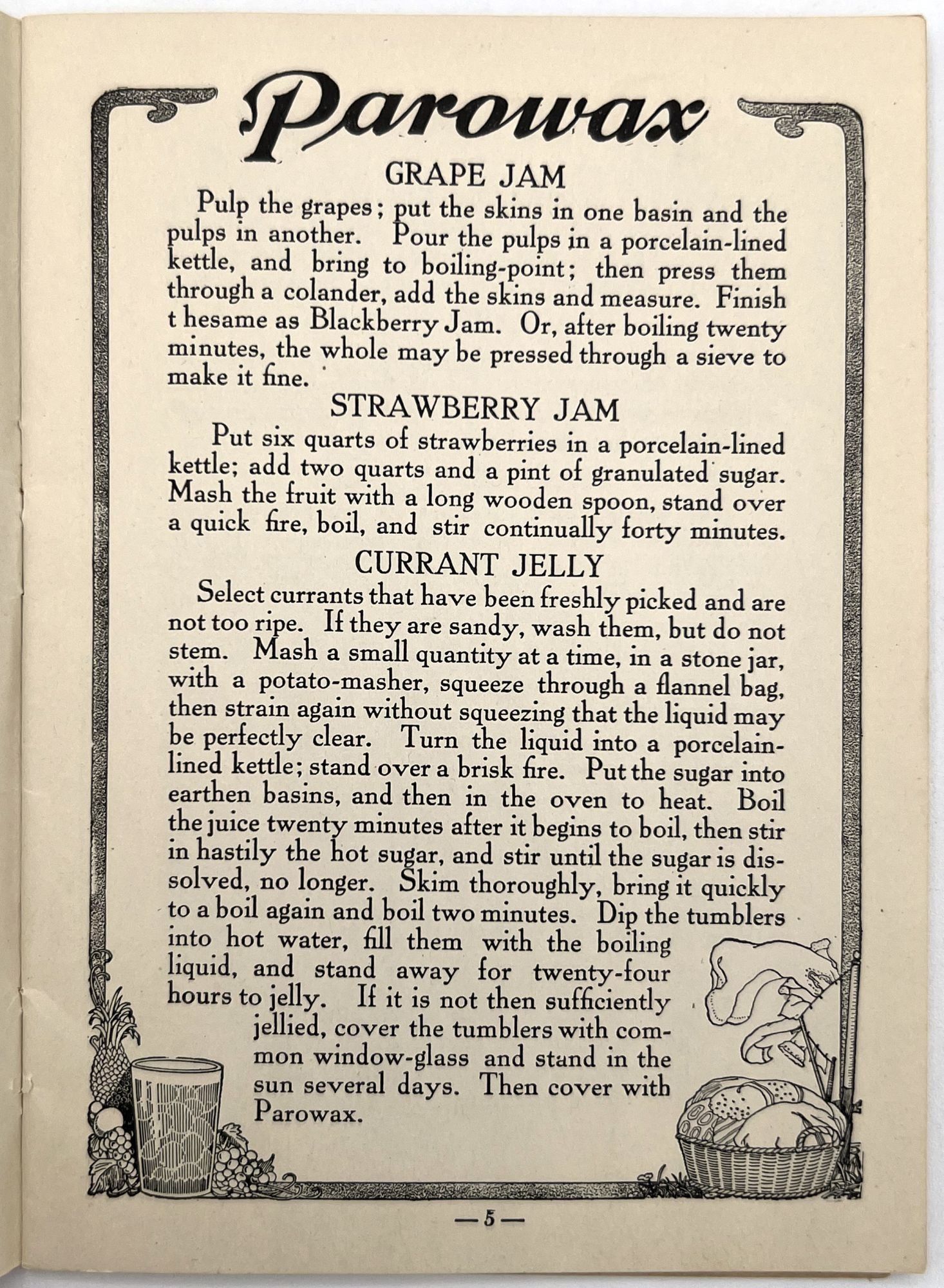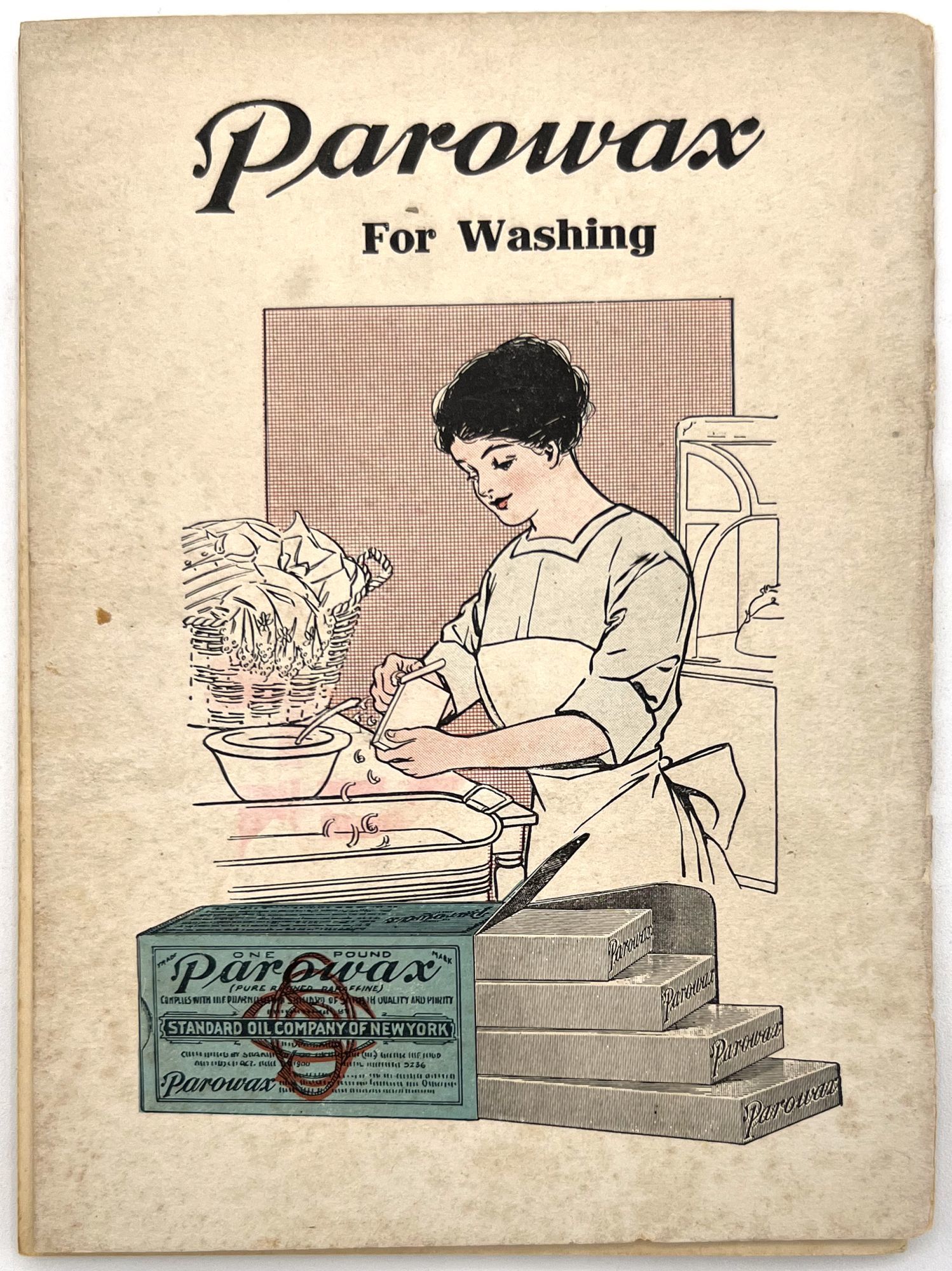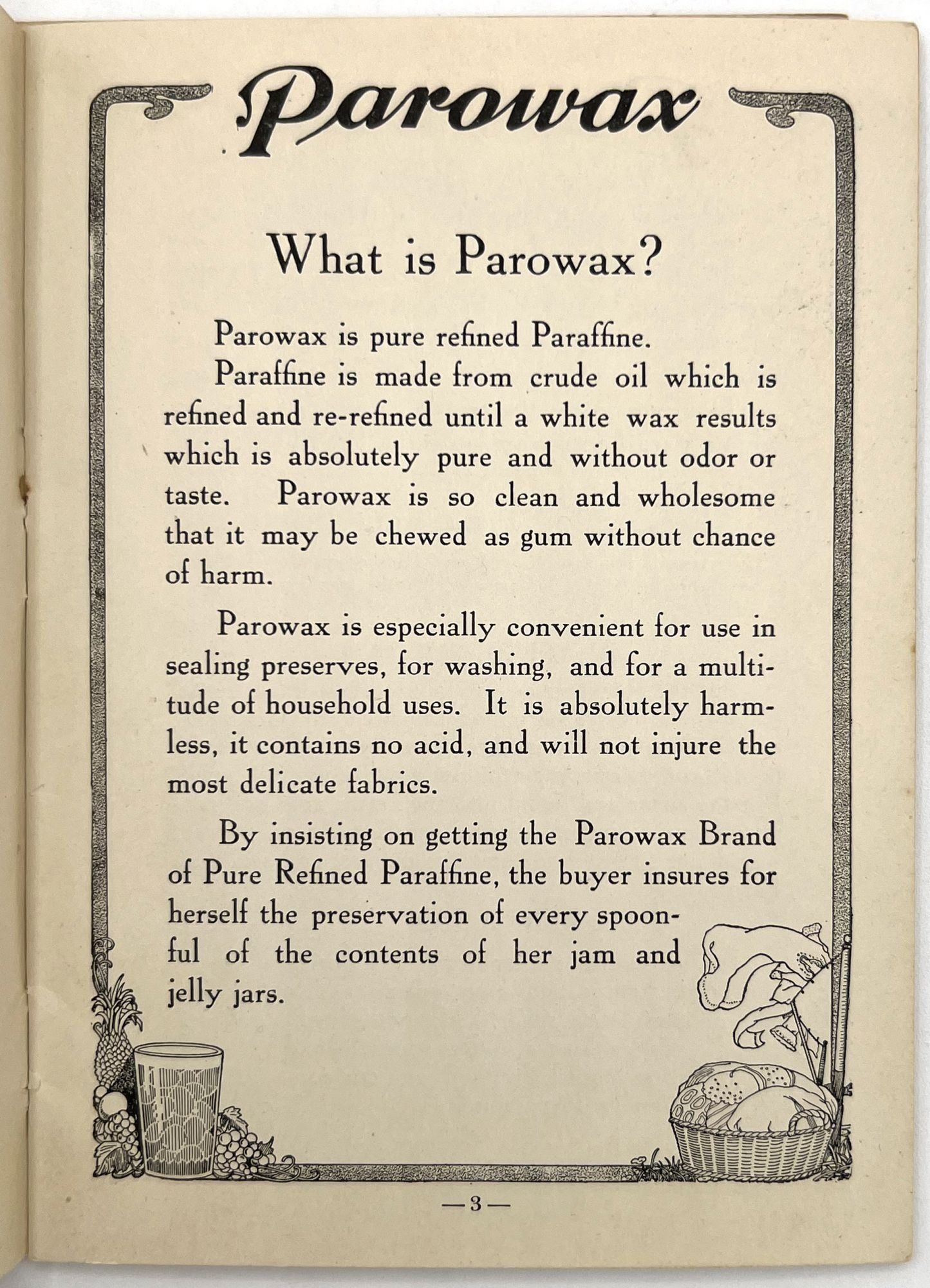 New York, New York: Standard Oil Company of New York, 1915. Fair. Text block loose, short tears, light spotting, about a dozen labels cut out and lacking.. Promotional booklet for Parowax, a brand of "clean and wholesome" paraffin wax sold to homemakers for sealing jam and jelly jars. Marketed as a multi-use product, with additional uses in "washing and general household use". Includes recipes for different jams and jellies, as well as several pages of printed labels to cut out and use on the jars. Single vol. (6" by 4.5"), pp. 14, [18], in original illus. wrps with image of beautiful young housewife using the wax to preserve jams.
