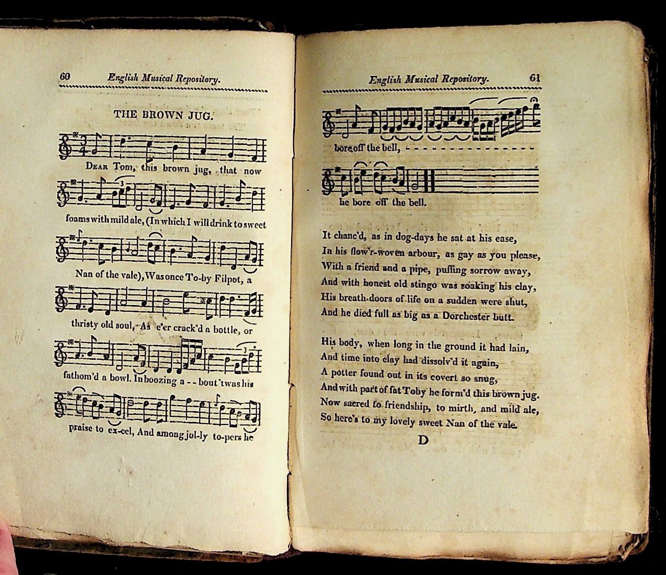London: B. Crosby and Co, 1800. Hardcover. Very Good. Hardcover. No date. An uncommon English song book with lyrics and musical scores. Bound in light blue paper covered boards with black printed title and ads to covers. This book has been amateurly repaired with a strip of antiquated dark brown leather covering the spine and boards. A hand written paper title label is on the spine. Heavy wear and rubbing to spine and boards. Several splits to binding along interior; although, the binding remains secure. Frontispiece and engraved title page. Minor soiling and foxing throughout. 292 pages. MUS/050625.