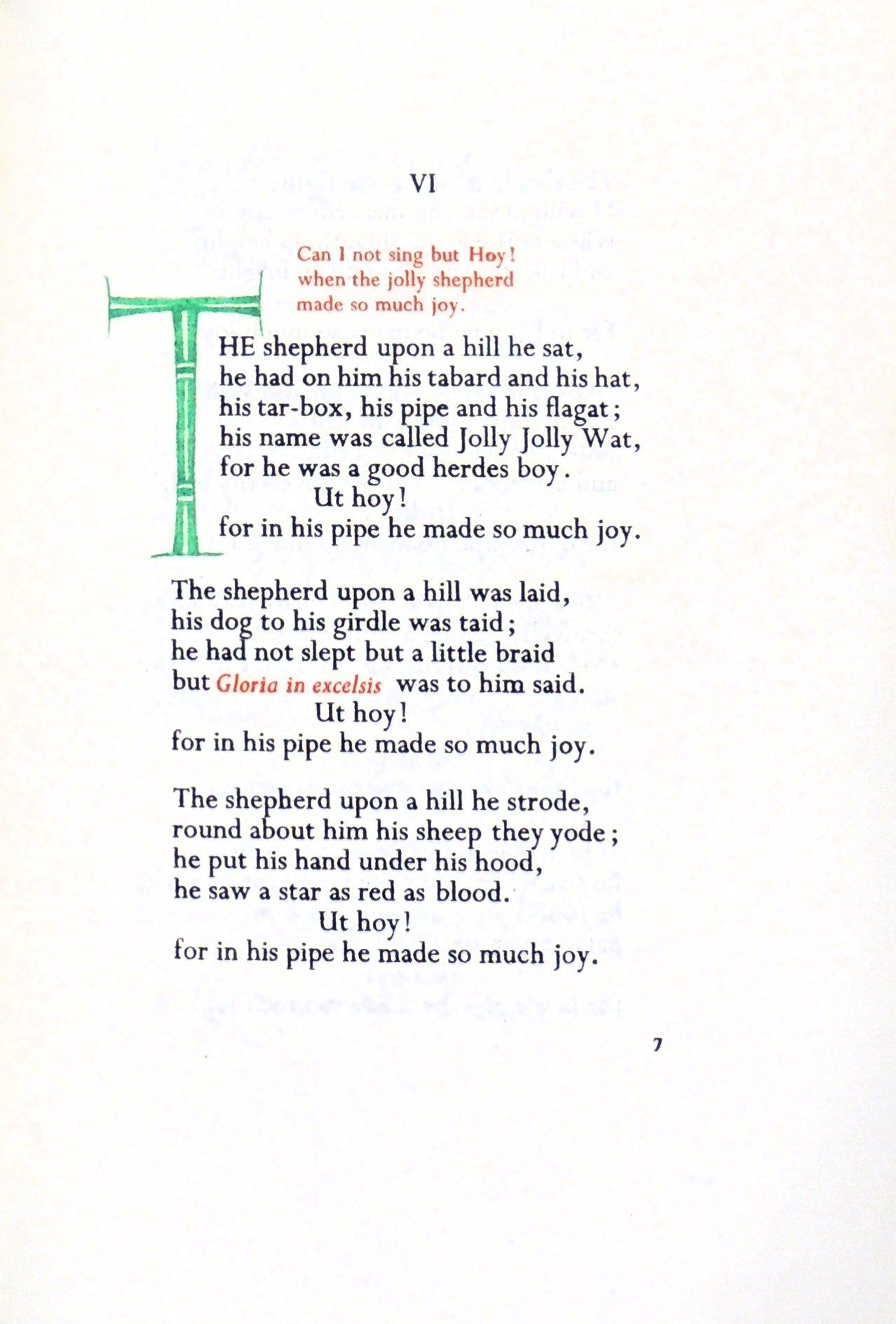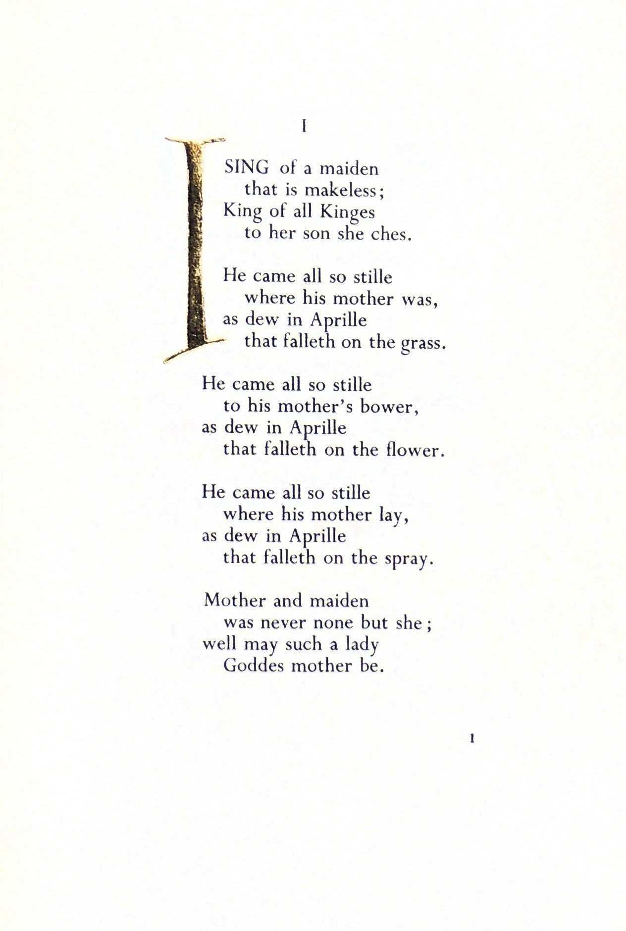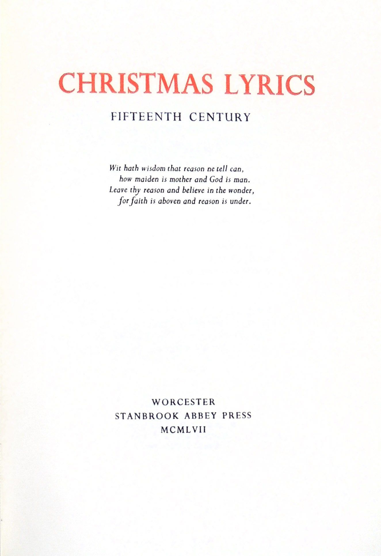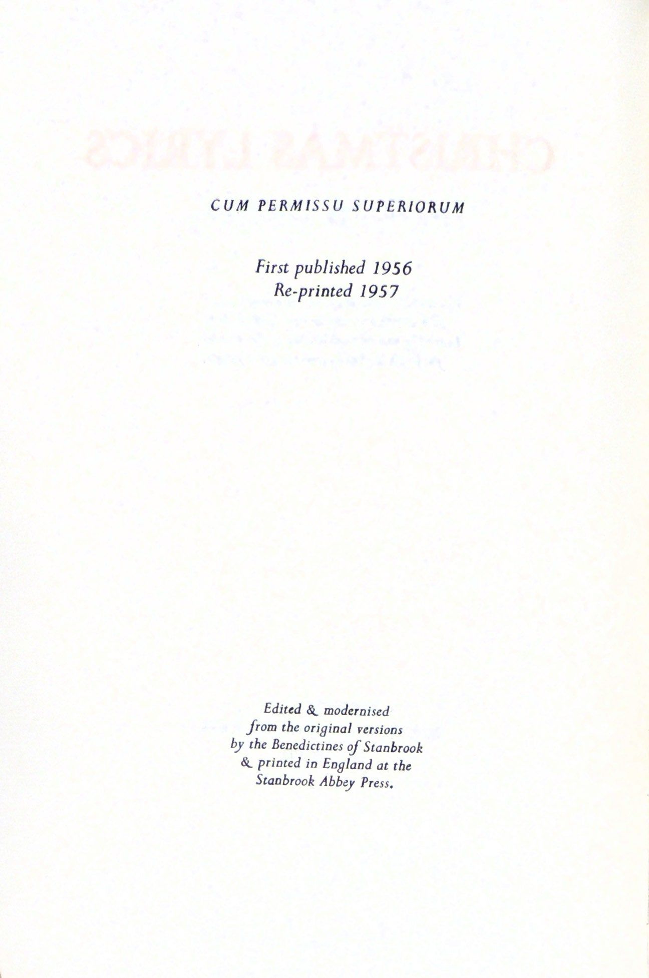 Worcester: Stanbrook Abbey Press, 1957. Fine. A finely printed collection of 15 poems printed for Christmas. First printed in 1956, this is a reissue from the following year. The lyrics are edited and modernized from the original versions by the Benedictines of Stanbrook & printed in England at the Stanbrook Abbey Press. The poems within "span the whole mystery of God-made-man from the Annunciation to the Passion and beyond to the Blessed Eucharist and the mystical union of Christ with man's soul and the Church. The poems have been transcribed into modern English except where an archaic word is necessary for the rhyme or where the sense is clear from the context. A simple glossary together with the sources will be found in the Appendix" (preface).