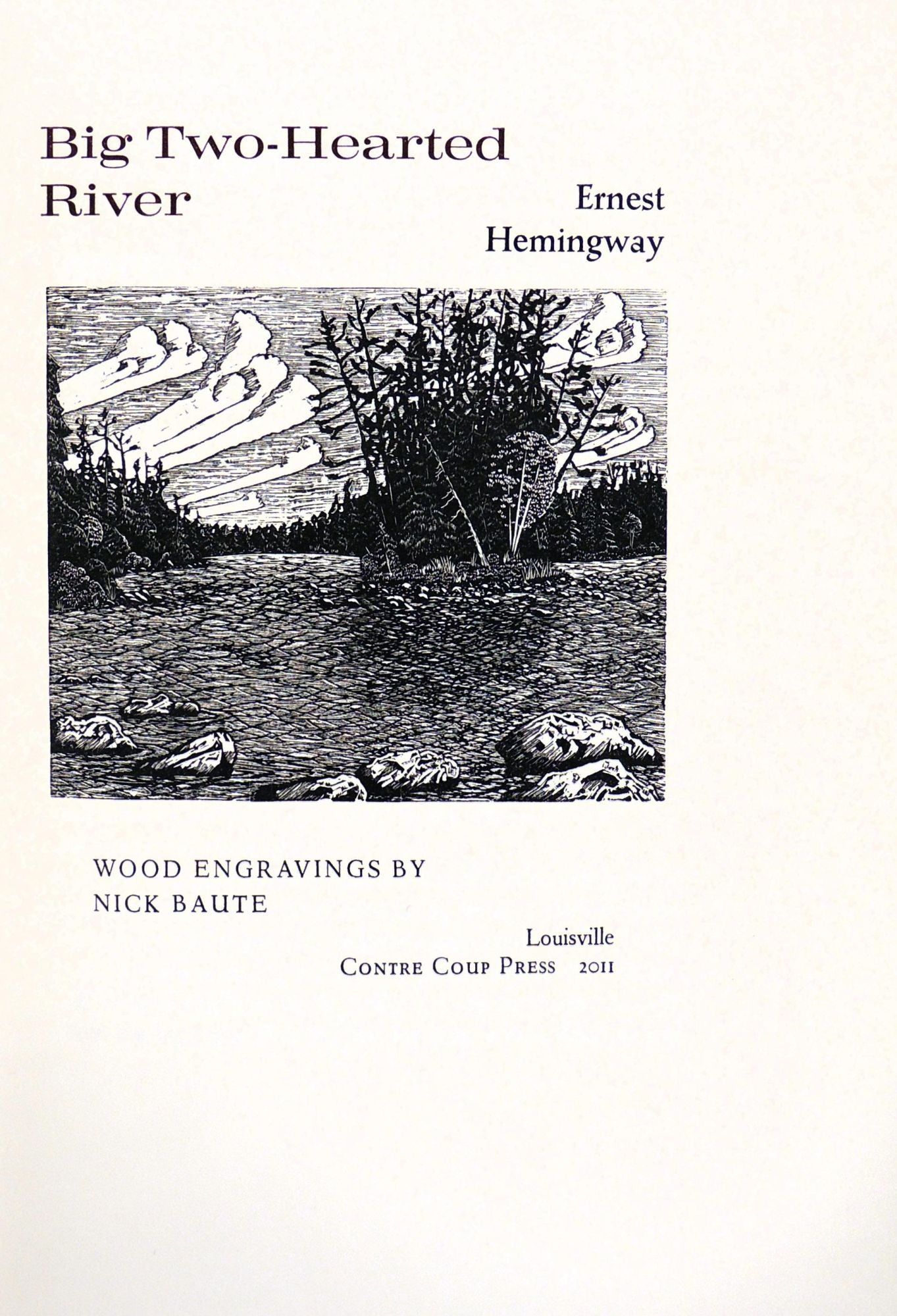 Louisville, KY: Contre Coup Press, 2011. Hardcover. Fine. Hardcover. One of 24 copies. Signed by the illustrator on the colophon. This is a particularly fine press production of one of Hemingway's stories and is uncommon in commerce, with OCLC showing only seven copies. It is one of the more elaborate works of Tim Hawley's now defunct Contre Coup Press, a fine press publisher specializing in limited edition books and broadsides, often created on vintage printing equipment. This edition includes a previously unpublished 8 page afterword. The press was run by Timothy Hawley for its entirety and known for its beautiful typography and unique typographic interpretations of rare manuscripts. The vintage printing equipment utilized included the Vandercook SP20 and hand set typography using various vintage typefaces. The press's books often featured typographic interpretations of rare manuscripts or literary works, such as this, one of Hemingway's finest Nick Adams stories. It was inspired by his affinity for nature and need for solace after returning from World War I. It was written in 1924, when Hemingway was just 25 years old and originally published in 1925 in the author's collection of stories, In Our Time. The creator of the engraved illustrations was Nick Baute. He is the owner and operator of the Hound Dog Press in Louisville, KY. In operation since 2008, HDP specializes in custom invitations, greeting cards, stationery, posters, art prints, and design. All work is produced on vintage letterpress equipment that ranges from 1892-1960, and they continue to hand-set metal and wood and hand carve wood and linoleum blocks to illustrate their prints.