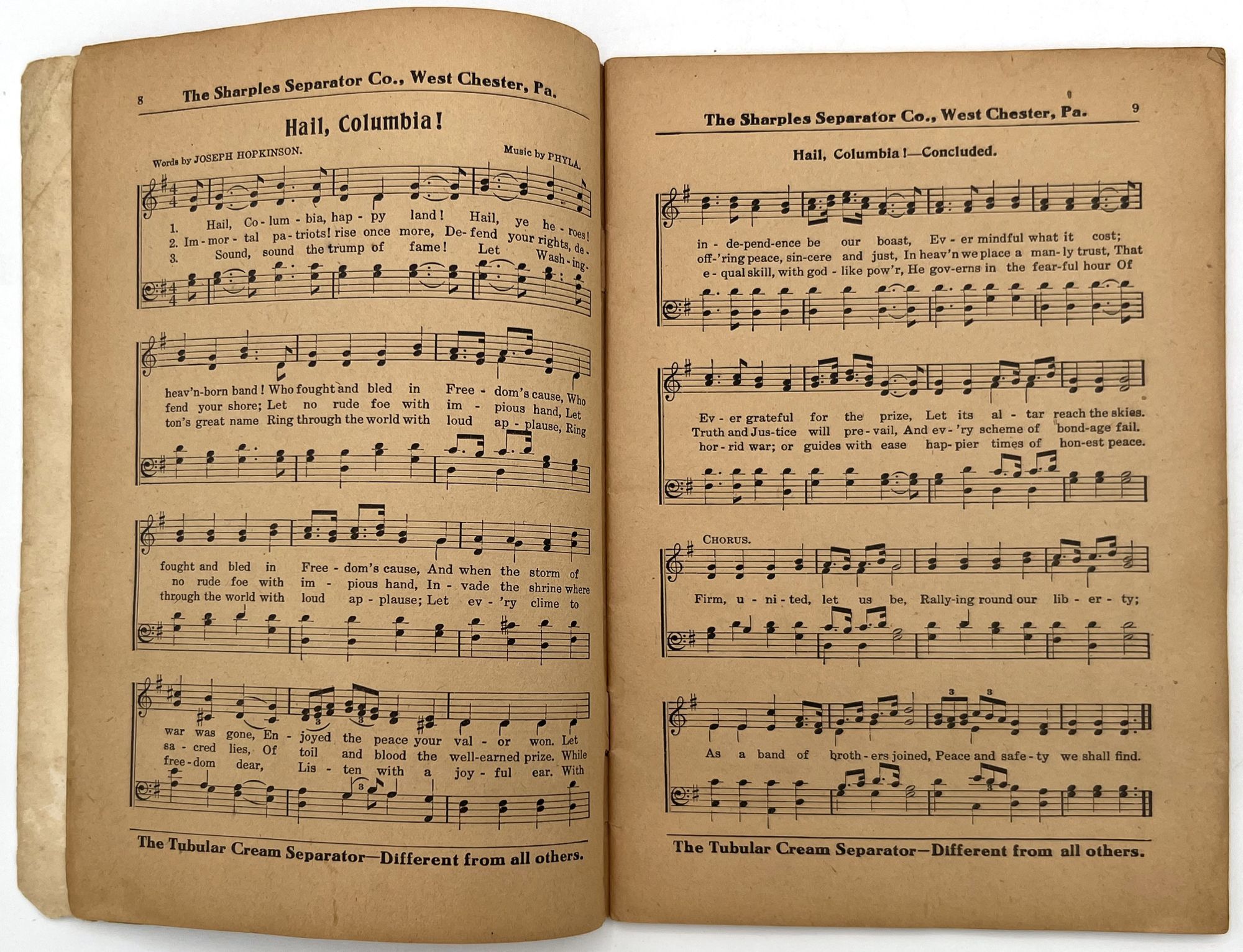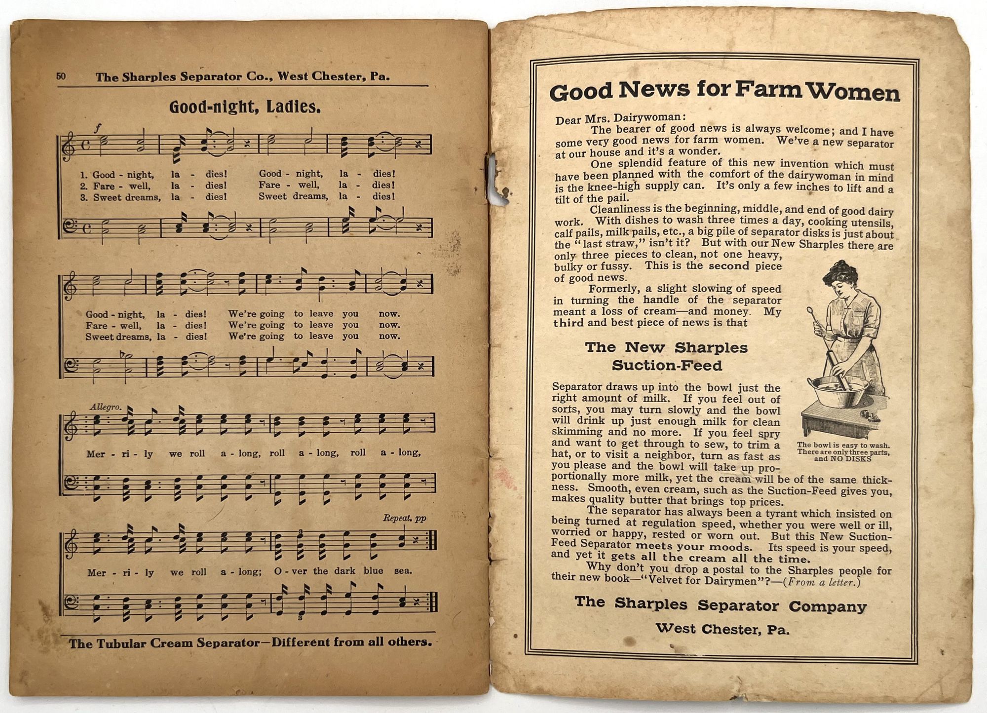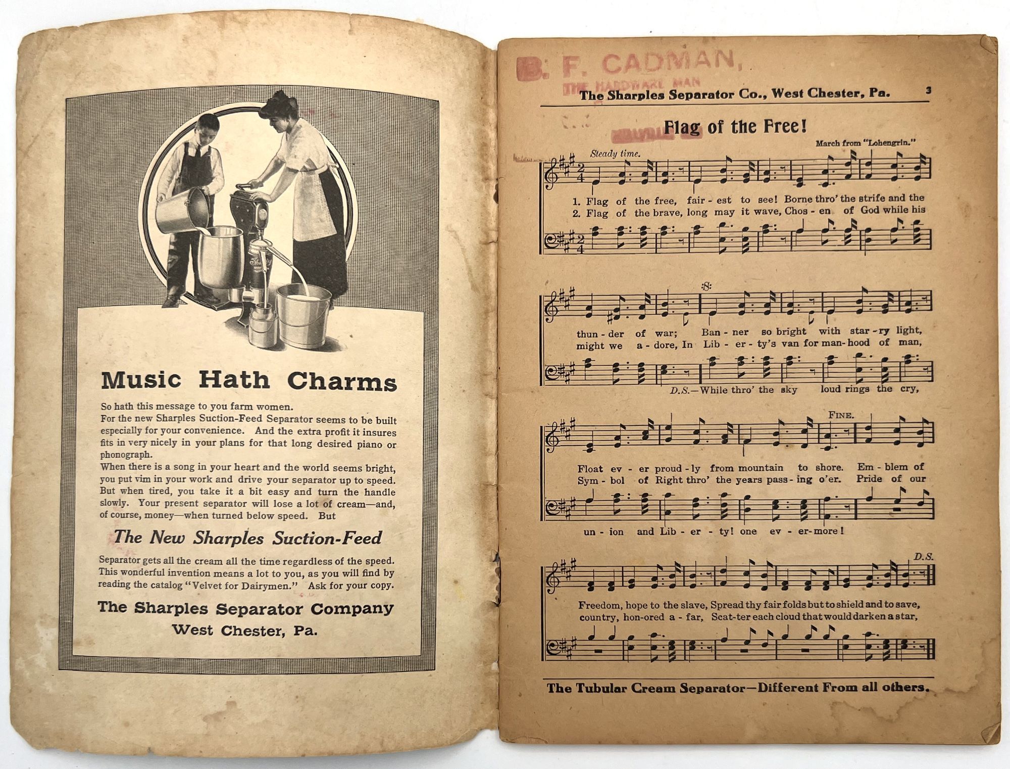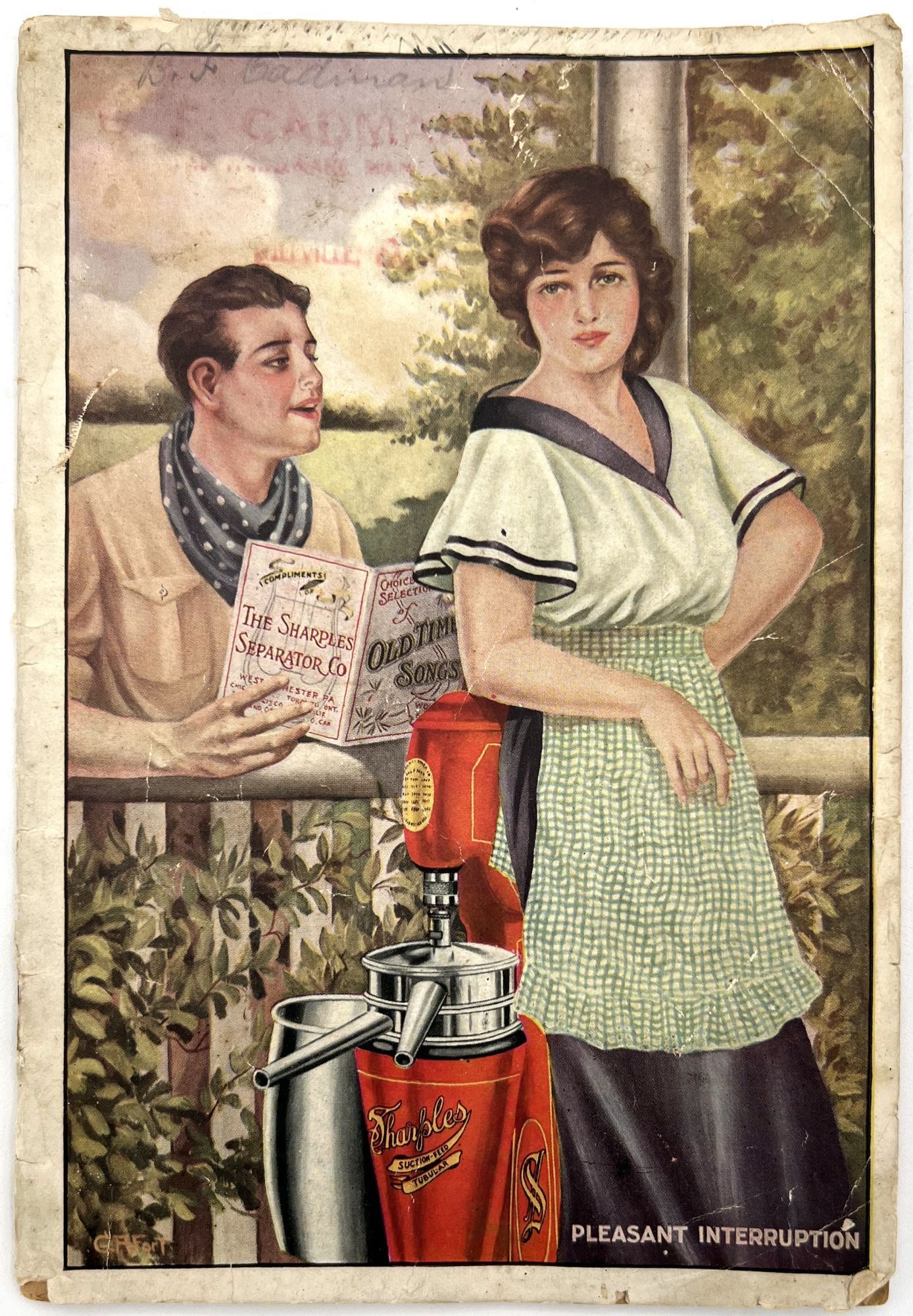 West Chester, Pennsylvania: The Sharples Separator Co, 1905. Poor to fair. Lacking at least one leaf. Toned with short tears, dust soiling, stains.. A book of songs, including lyrics and music, issued to market the Sharples brand cream separator to American families. Includes nearly 50 pages of patriotic and other popular tunes to play on piano and sing with friends and family. Features a charming illustration on the upper cover titled "Pleasant Interruption", in which a beautiful young woman in an apron leans against her cream separator machine while a young man courts her over the porch railing. A nice example of how companies marketed to American families by appealing to their love of communal music-making and traditional family values. Single vol. (8.5" by 5.75"), pp. 3-50, in original illus. wrps. This copy lacking at least one leaf. Pencil ownership inscription to upper wrapper. Ink stamps to upper wrapper and p.3.