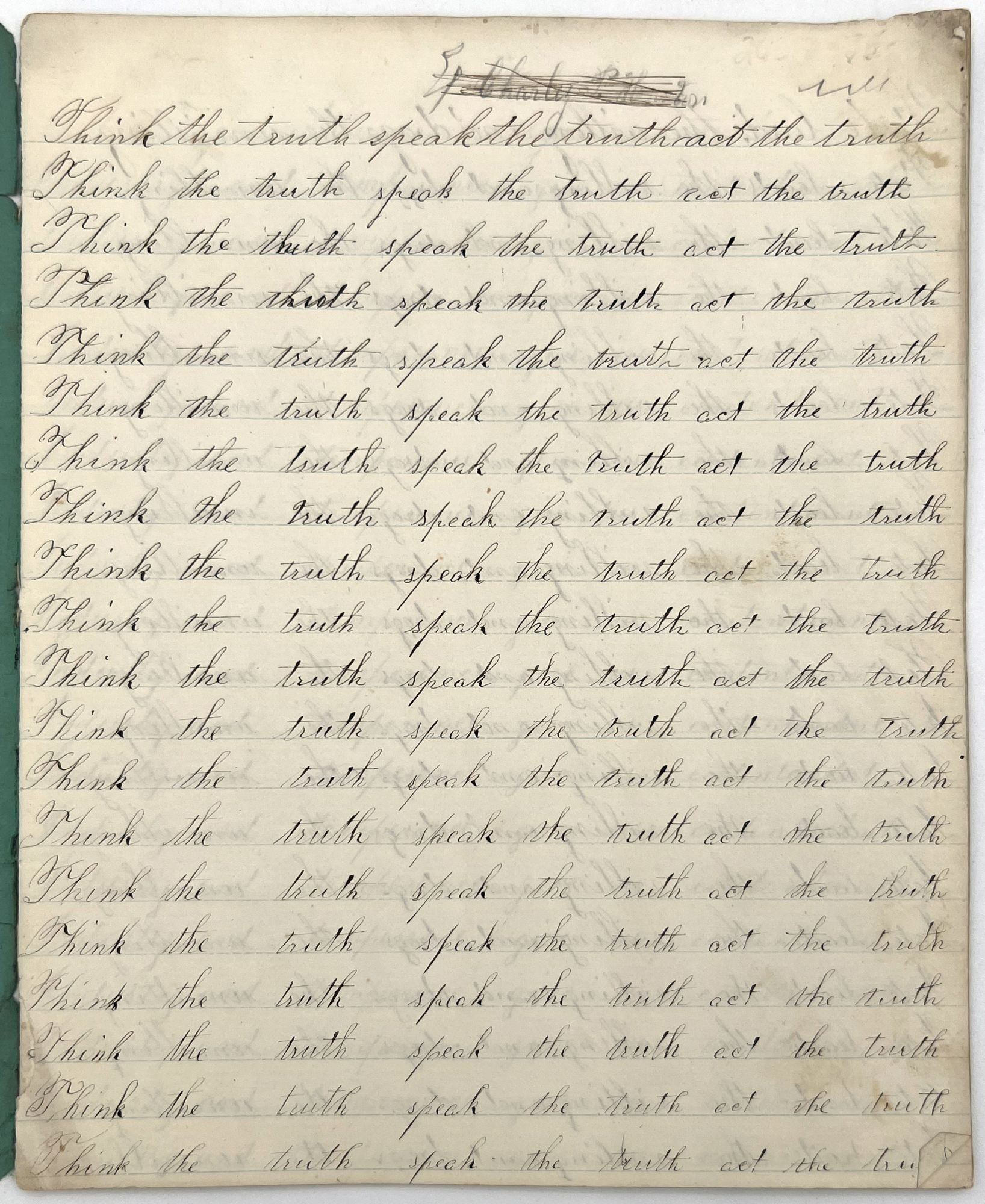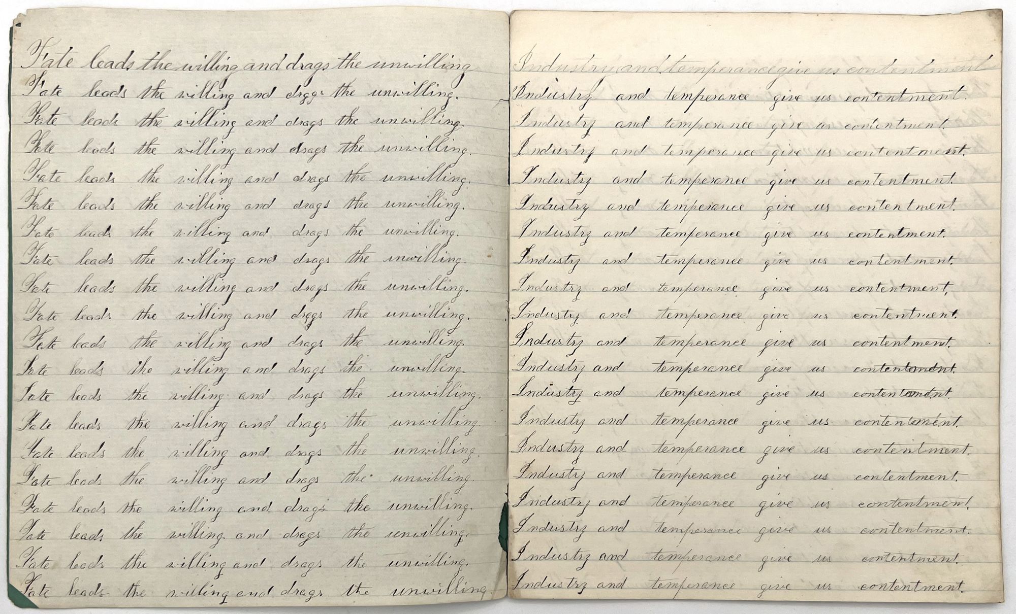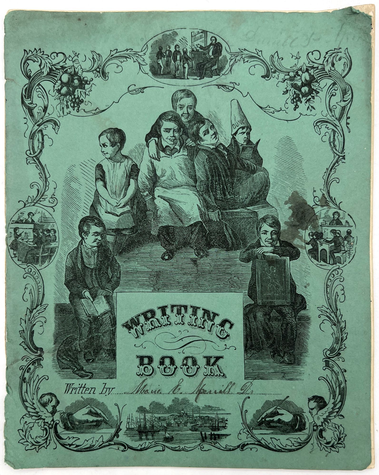 Cambridgeport, Massachusetts: L.S. Learned's Manufactory, 1870. Good, extremities chipped/worn, lacking one leaf.. A manuscript copy book of a school girl named Marie E. Merrill, presumably of Massachusetts, notable for its humorous and well-designed cover illustration. The image depicts seven school boys, each with personality and expressiveness. One proudly displays his chalkboard art, while others smile and lean on each other. Note the boy wearing a dunce cap in the back, grimacing at the others free to fool around while he has to keep doing his reading. Also includes smaller illustrations of school room scenes around the edge. A nice example of humor and personality in the classroom. Single vol. (8.5" by 7"), 11 lined leaves (lacking one) sewn in original illus. green wrps., ownership inscriptions in ink and pencil to upper wrapper.