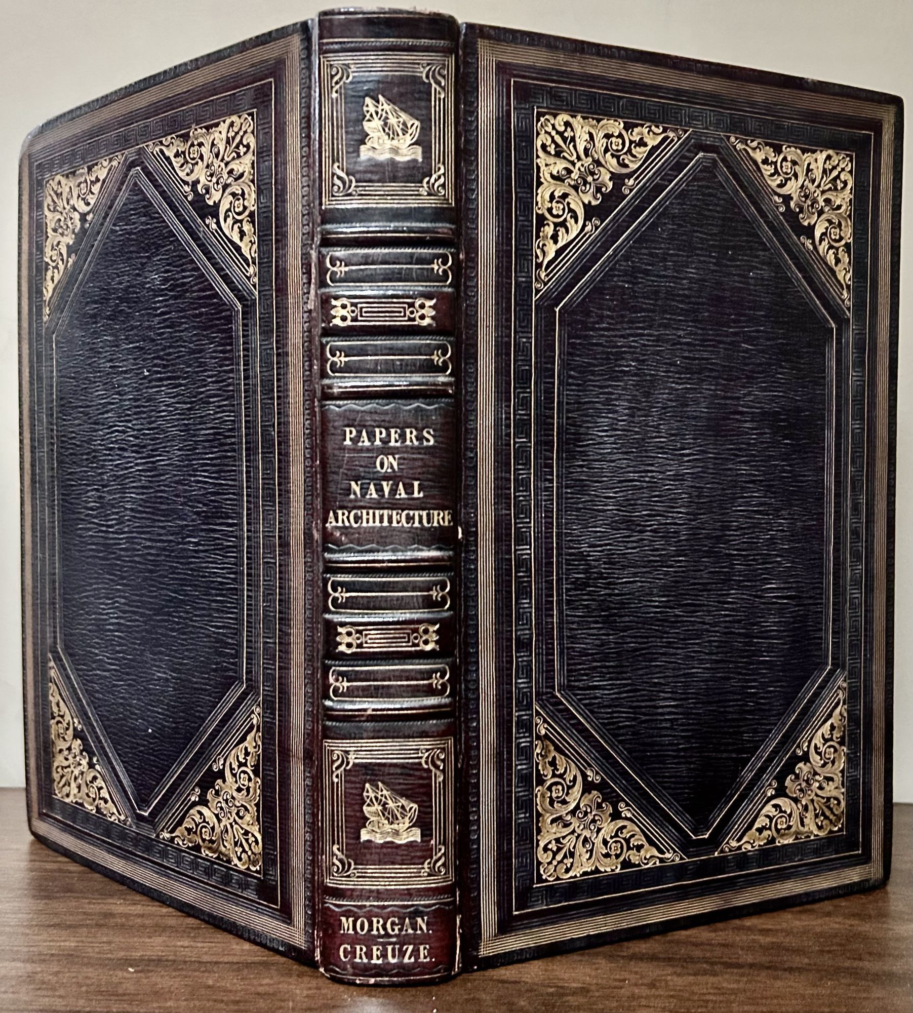 London: G.B. Whittaker, 1828. First edition. leather_bound. Fine. 448 pages. 22 x 14 cm. Dedicated to the Rev. James Inman, Professor of the Royal Naval College and School of Naval Architecture In His Majesty's Dockyard At Portsmouth. Two fold-out maps at rear and fold-out plates within the text. All interior contents clean and very fresh. Finely bound in charcoal morocco decorated with cover gilt motifs, silk moire endpapers, inner dentelles. Spine with raised bands decorated with naval motifs and lettered in gilt. Aeg.
