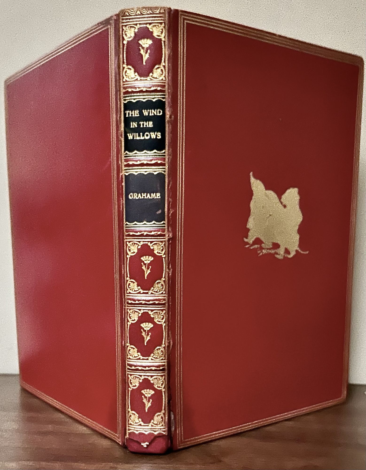 London: Methuen & Co, 1954. Reprint. leather_bound. Orig. polished red calf. Near fine. Aeg. Rackham, Arthur. 178 pages. 23 x 15.5 cm. Originally published 1908. 12 full page color plates. Bound by Baynton. Triple gilt border panels, backstrip with raised bands spine panels decorated with floral motifs, black spine labels lettered in gilt. Inner dentelles and marbled endpapers. Front cover gilt illustration. Small loss bottom of backstrip of .05 centimeters. Interior contents clean and bright with black and white illustrations at some chapter heads.