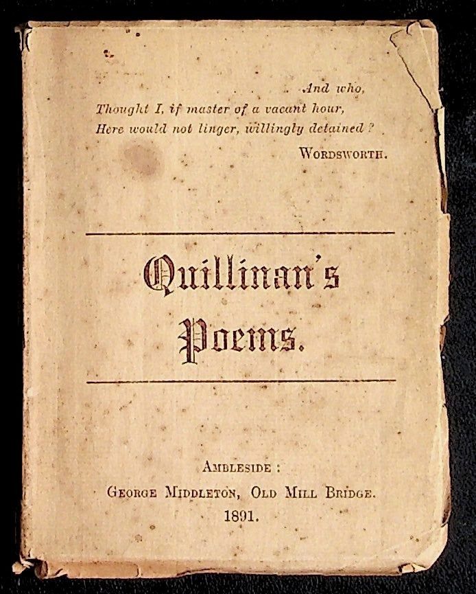 Ambleside: George Middleton, 1891. Paperback. Very Good. Paperback. English poet Edward Quillinan (1791 - 1851) was the son-in-law and defender of William Wordsworth against Walter Savage Landor, a critic. He is also remembered fro his translations of Portuguese poetry. Cream paper wrappers with dark brown title "Quillian's Poems" to front cover. Foxing and minor soiling to covers. Creasing and short closed tears to edges of wrappers. Occasional spots of foxing to interior, but clean overall. A few minor splits to interior, but binding remains secure. 126 pages. POE/050825.