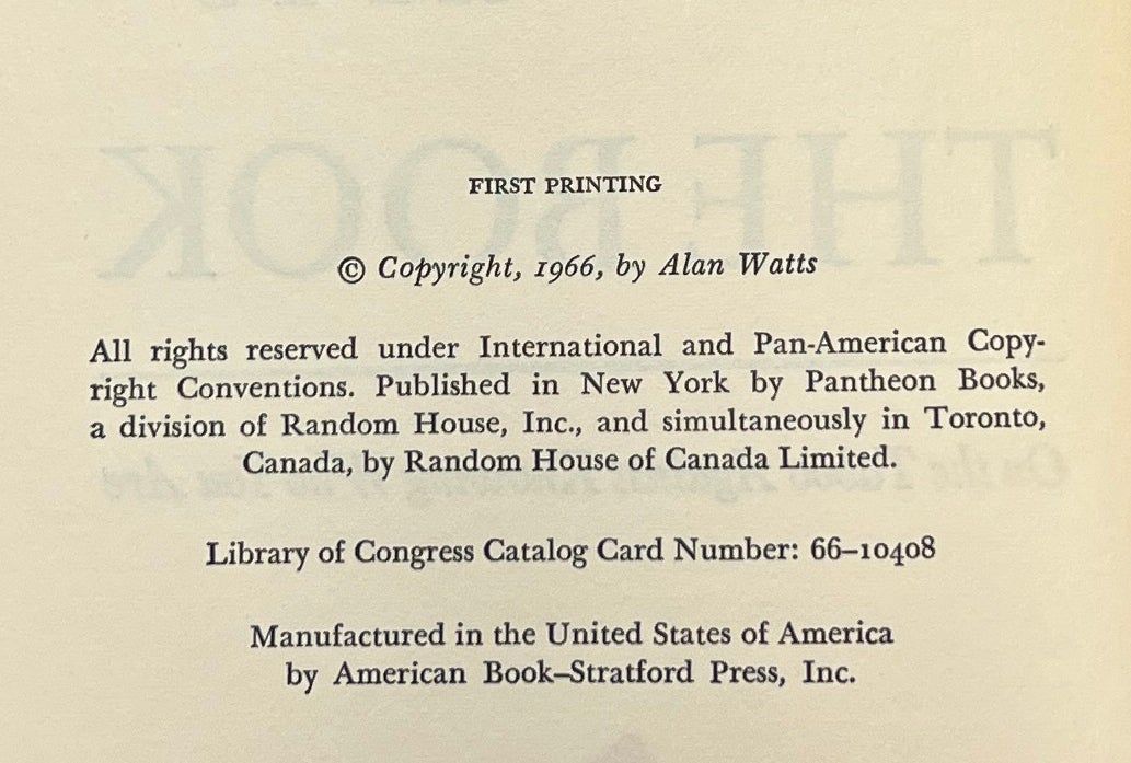 New York: Pantheon Books, 1966. First Edition. Hardcover. Fine/Very Good. Fine in a Very Good jacket, unclipped ($4.95) generally toned, a few scuffs and small stains, a shallow chip at the head of the spine. Beige cloth with black and orange ink lettering and designs on the spine and front board. Square and firmly bound with a faint orange top stain, clean internally. Watts's work that "modernizes and restates the ancient Hindu philosophy of Vedanta" to realize that "the self is in fact the root and ground of the universe.