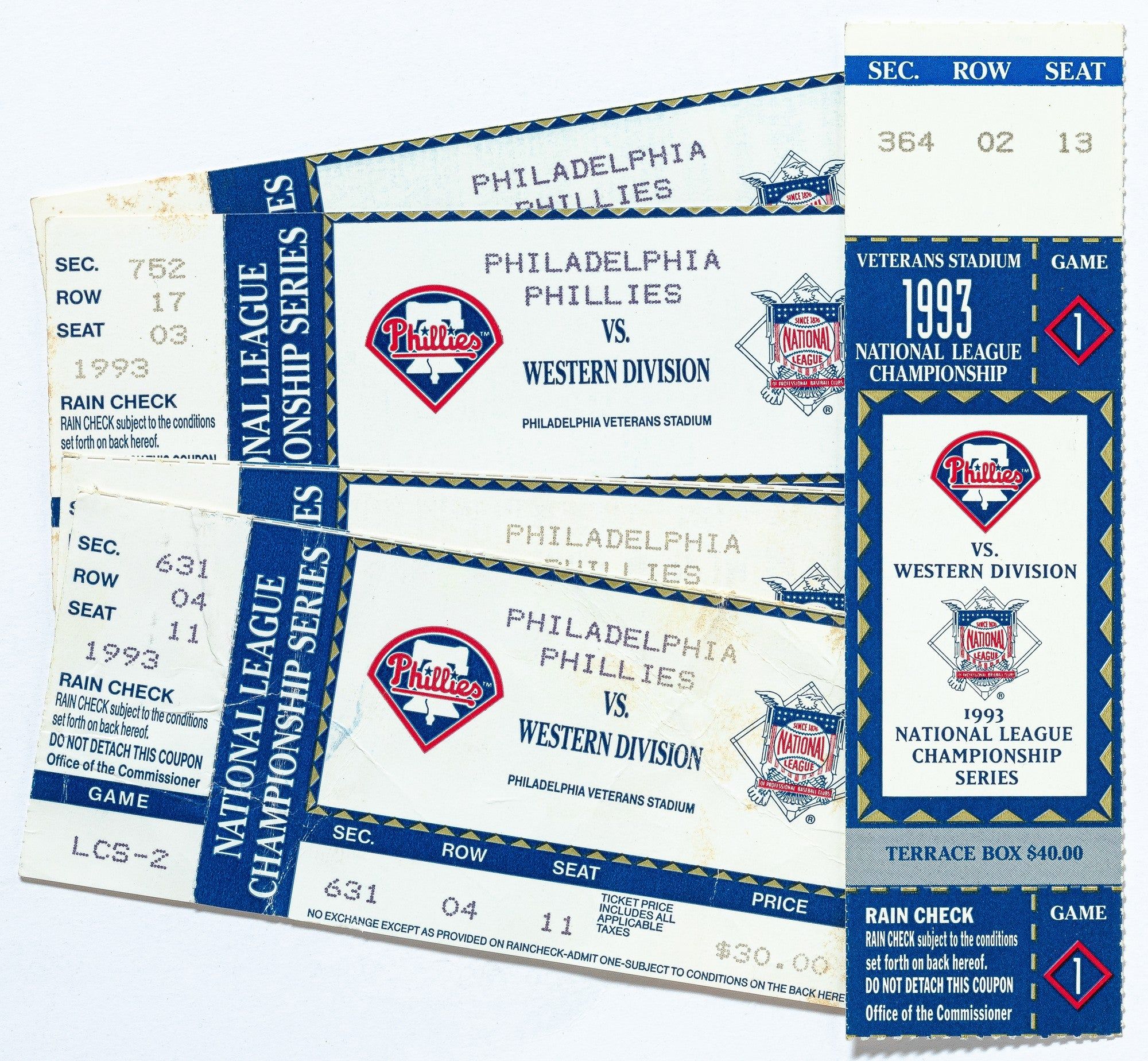 [Philadelphia]: Veterans Stadium, 1993. Unbound. Very Good. Five baseball National League Championship ticket stubs, measuring 1½" x 5" and 2" x 4½". A bit of soiling/foxing, one ticket with creases, very good overall. Five ticket stubs to the 1993 National League Championship between the Philadelphia Phillies and the Atlanta Braves, held at Veterans Stadium in Philadelphia. The Phillies won the series in six games, upsetting the Braves, who were looking to make their third consecutive World Series appearance.